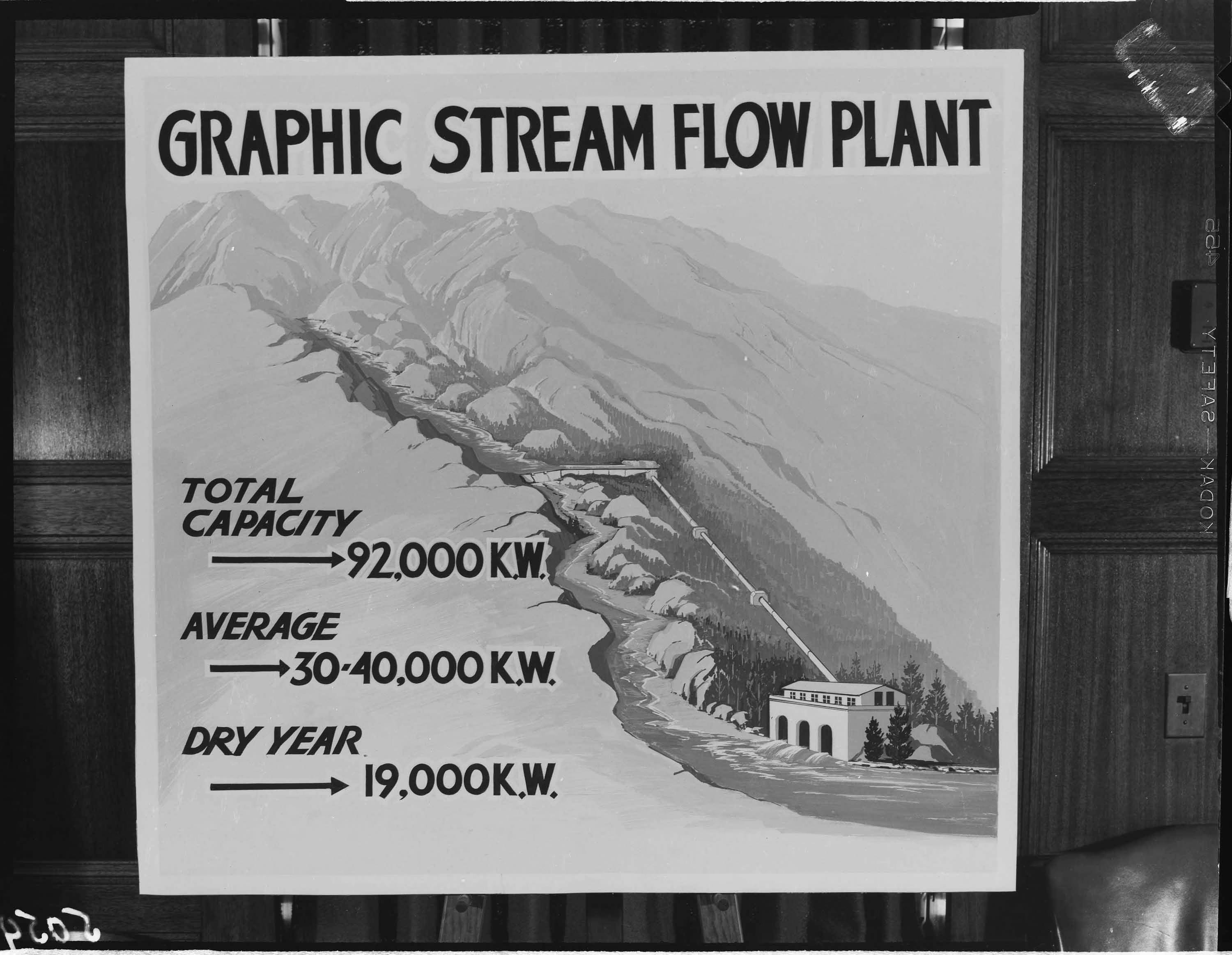 Graphic showing layout of a “run of river” hydro plant is taped to a wall for this copy neg. Doug White, undated
