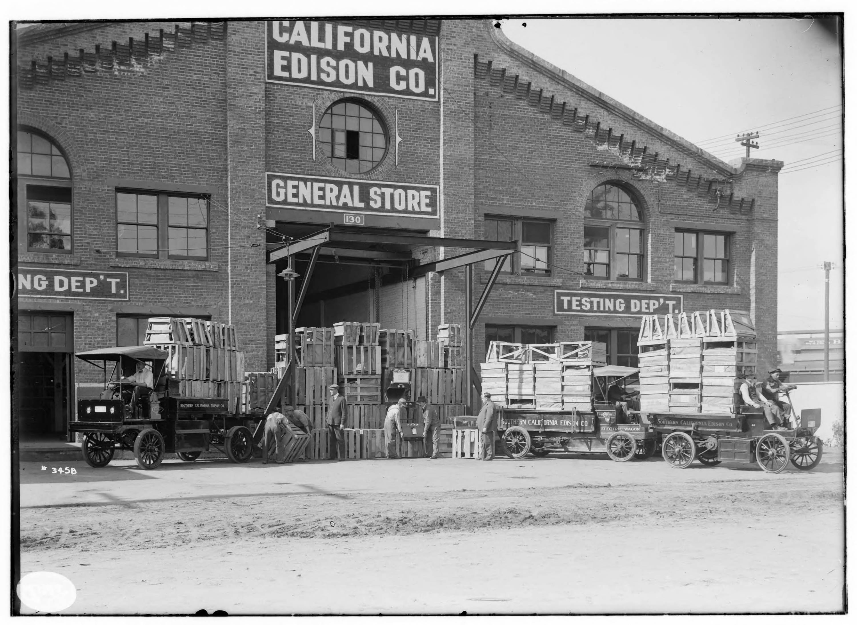 Trucks loaded up with electric ranges ready for delivery in front of the Edison General Store in Los Angeles. G. Haven Bishop, March 1, 1916