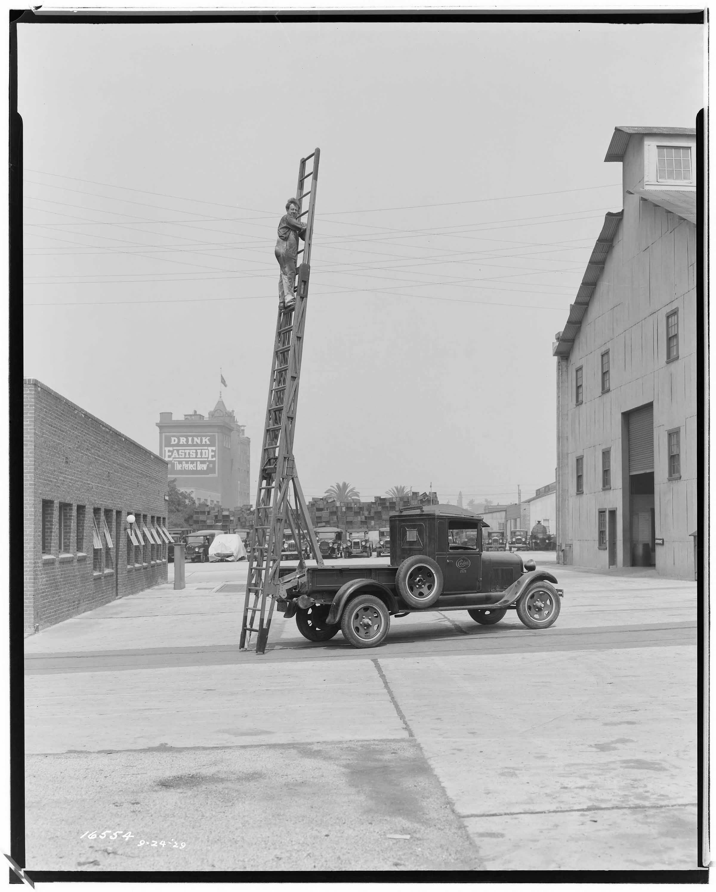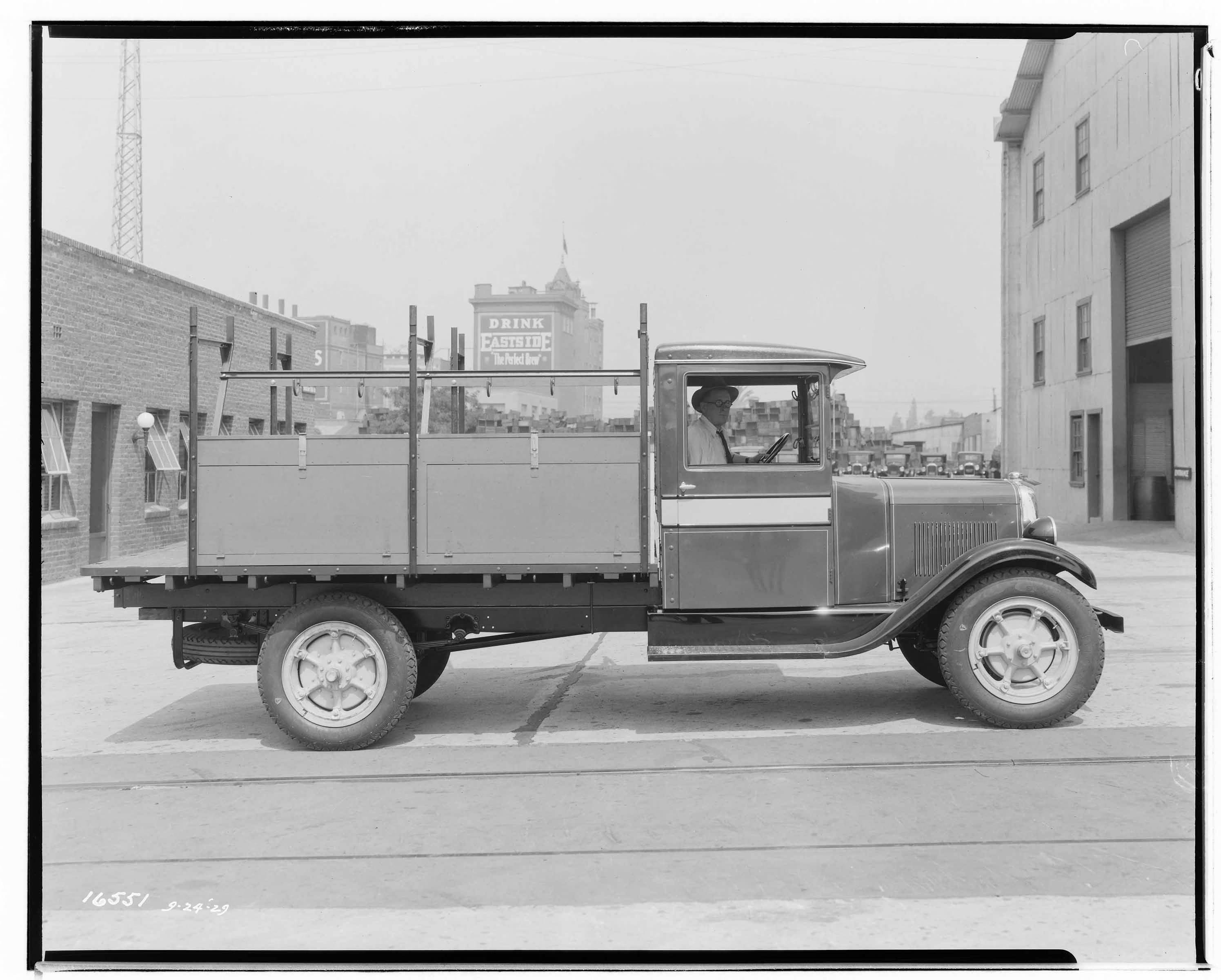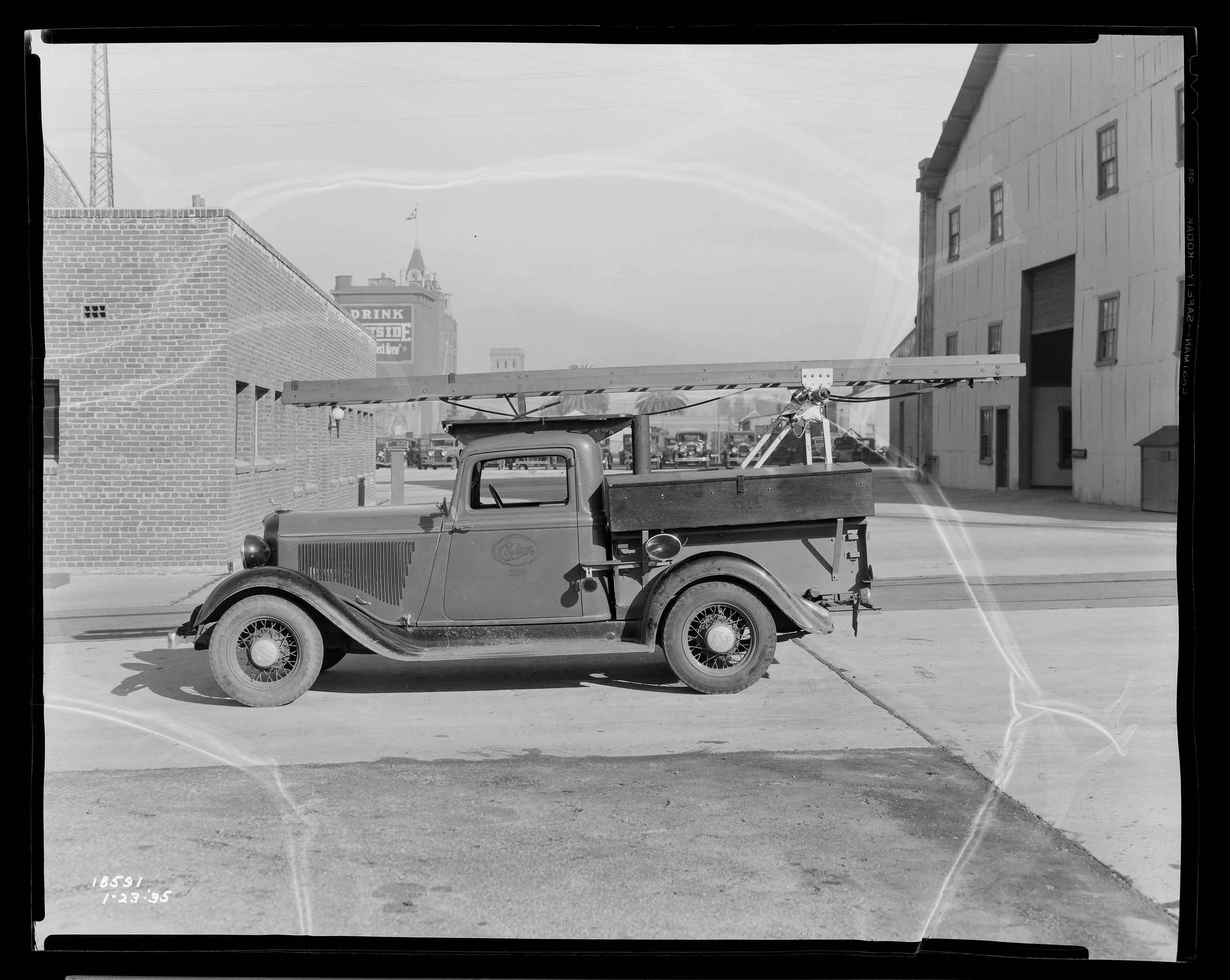 Special Truck with places for equipment storage – side view. [Eastside Brewry in background.] G. Haven Bishop, September 24, 1929