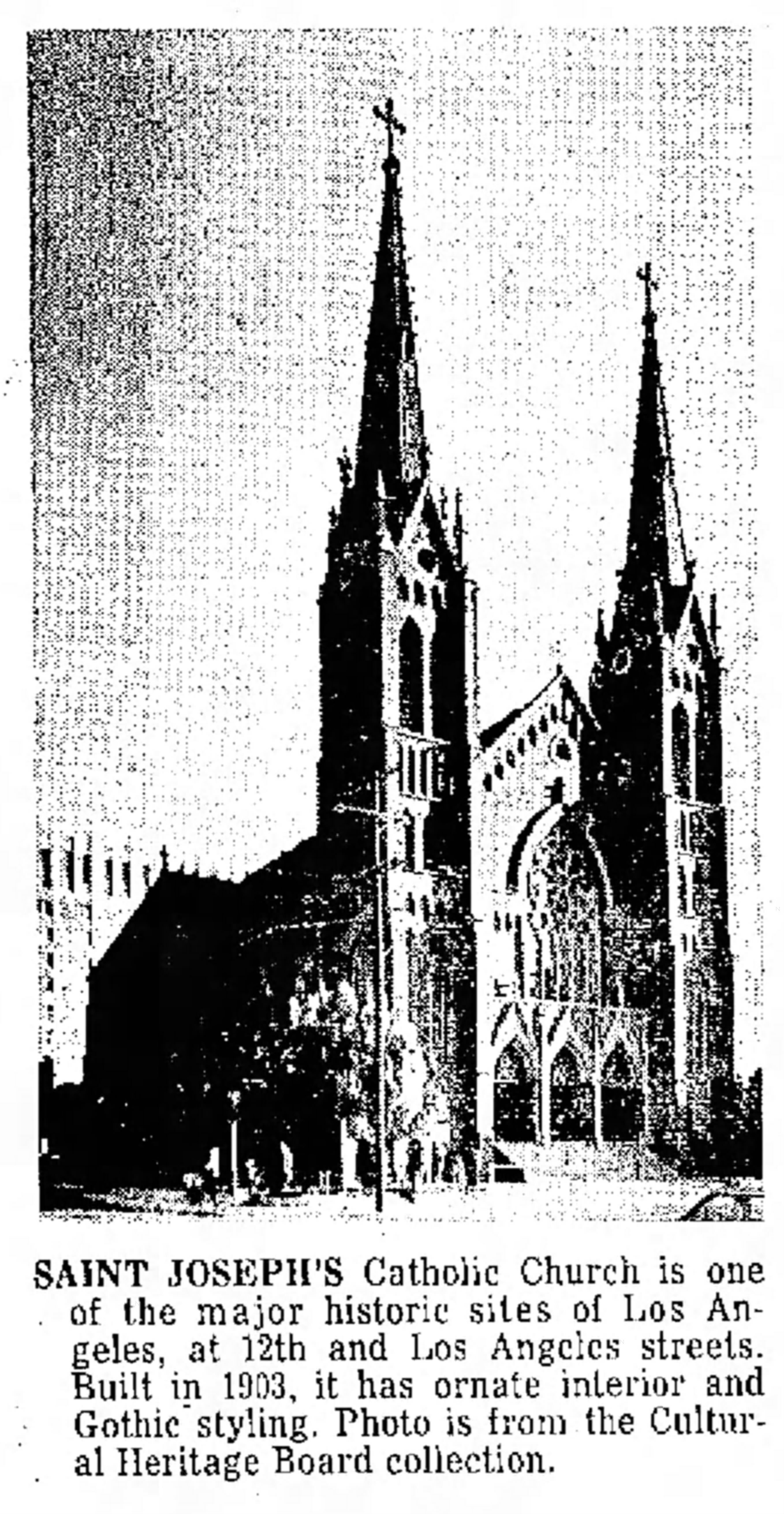Saint Joseph’s Catholic Church is one of the major historic sites of Los Angeles, at 12th and Los Angeles streets. Built in 1903, it has ornate interior and Gothic styling. Photo is from the Cultural Heritage Board collection.