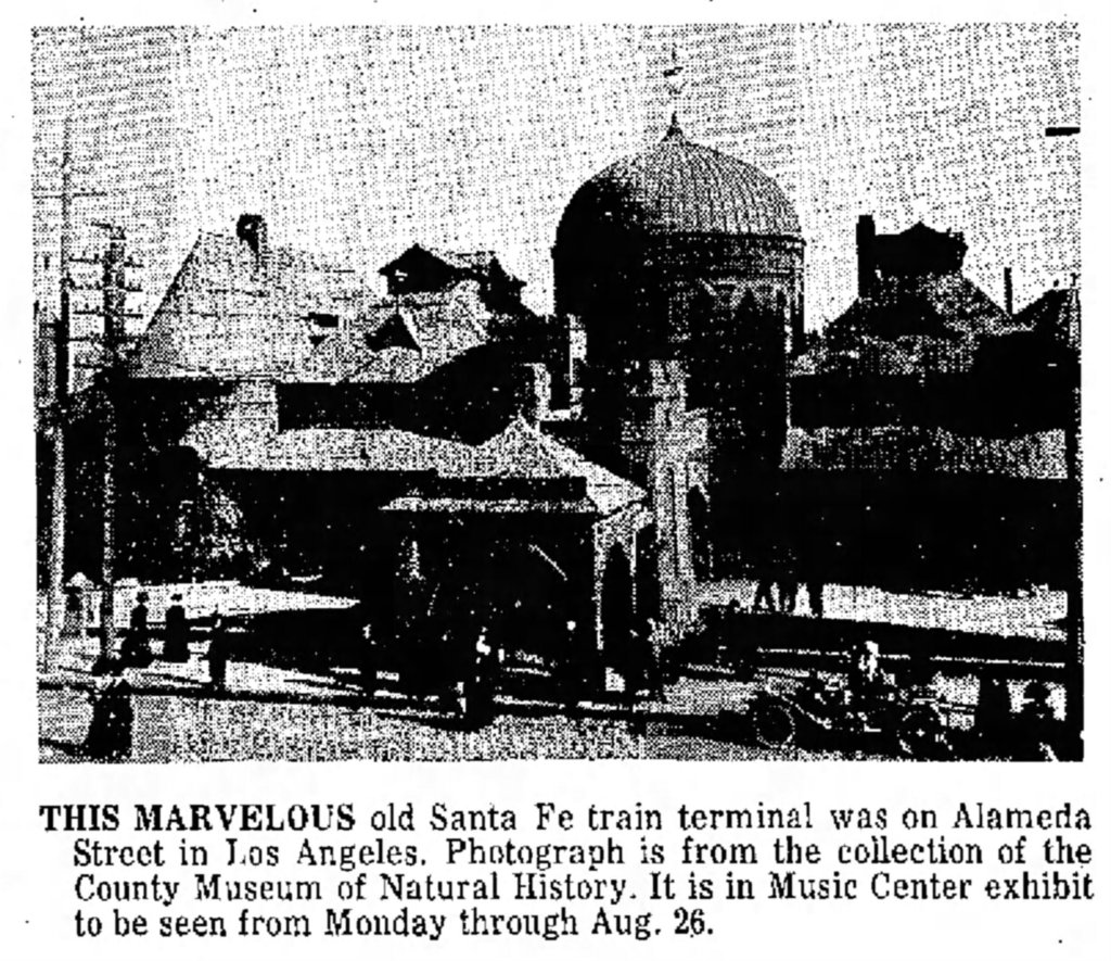 This marvelous old Sante Fe train terminal was on Alameda Street in Los Angeles. Photograph is from the collection of the County Museum of Natural History. It is in Music Center exhibit to be seen from Monday through Aug. 26.