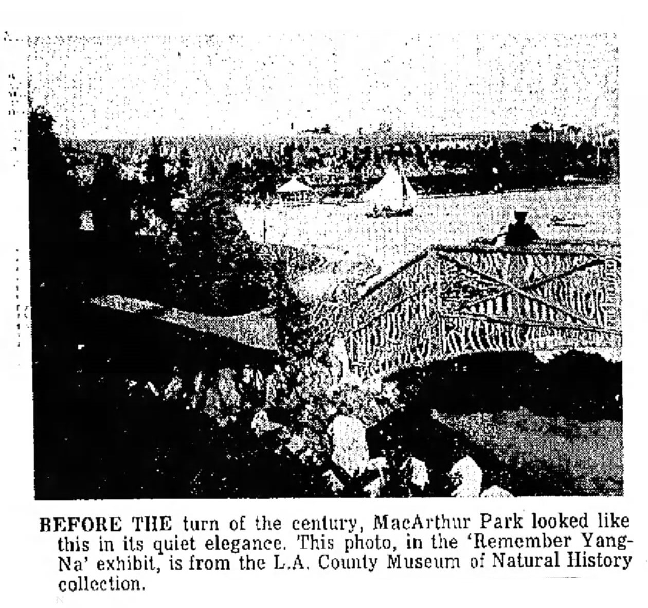 Before the turn of the century, MacArthur Park looked like this in its quiet elegance. This photo, in the ‘Remember Yang-Na’ exhibit, is from the L.A. County Museum of Natural History collection.