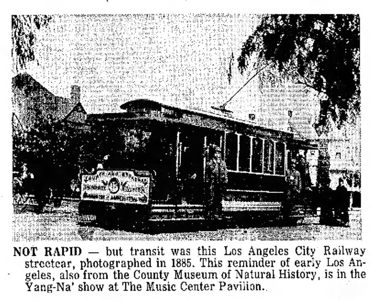 Not rapid — but transit was this Los Angeles City Railway streetcar, photographed in 1885. This reminder of early Los Angeles, also from the County Museum of Natural History, is in the Yang-Na’ show at The Music Center Pavilion.