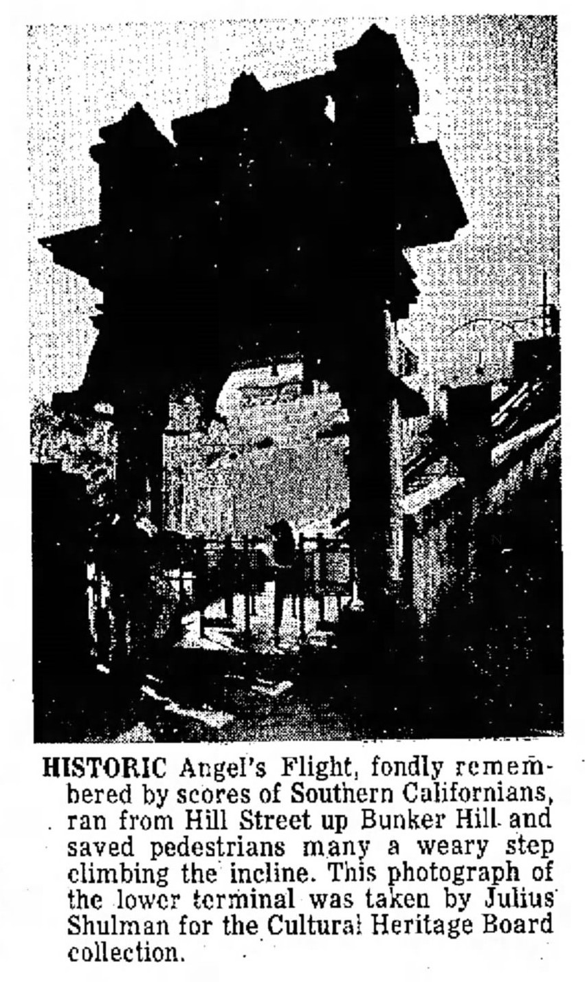 Historic Angel’s Flight, fondly remembered by scores of Southern Californians, ran from Hill Street up Bunker Hill and saved pedestrians many a weary step climbing the incline. This photograph of the lower terminal was taken by Julius Shulman for the Cultural Heritage Board collection.