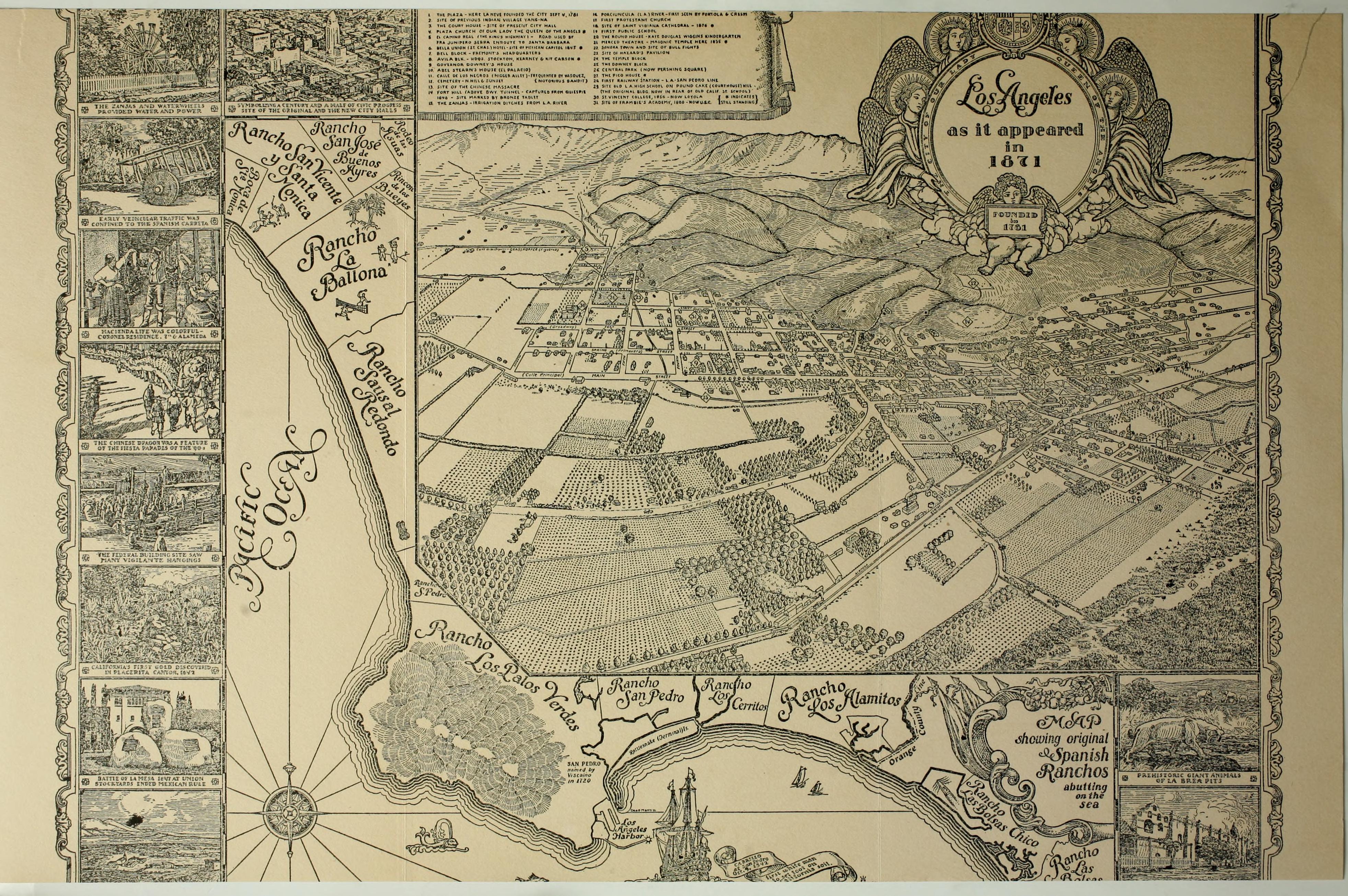 There is less confusion as evening draws on, and the mothers prepare the cena, while the men tend the campfires, happy in the thought that they have this day ‘dado principio a su pueblo’ — given a beginning to their Pueblo. Such is the simple story of the foundation of a community, which one hundred and fifty years later takes its place among the great cities of the world. The drama of it all is not in the fanfare and ‘panoply of pomp and liturgy’ that writers have attributed, but rather that having had such an humble beginning Royally ordained though it may have been, it has today surpassed the wildest dreams of the most farsighted of its founders.