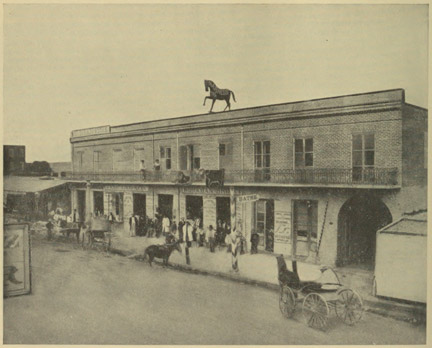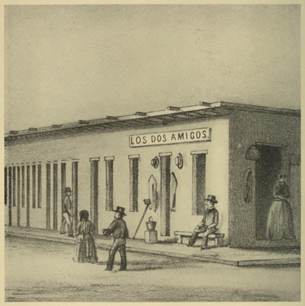 At last, with shouts and yells from the competing drivers, almost as deafening as the horn-blowing of a somewhat later date, and hailed apparently by every inhabitant and dog along the route, we arrived at the only real hotel in town, the Bella Union, where stages stopped and every city function took place. This hotel was a one-story, adobe house enlarged in 1858 to two stories, and located on Main Street above Commercial; and Dr. Obed Macy, who had bought it the previous spring from Winston & Hodges, was the proprietor…