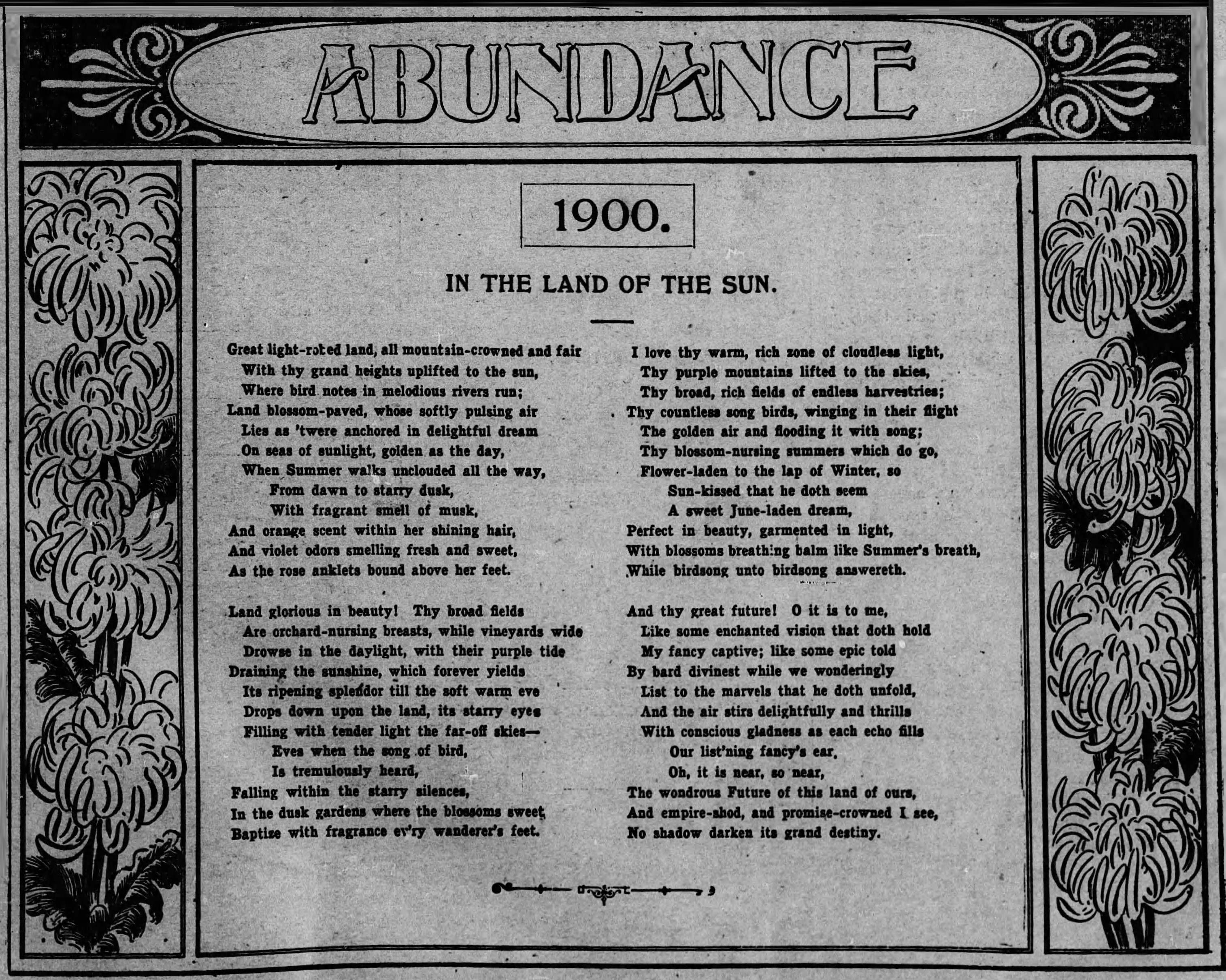 Secretary William H. Seward said in his memorable speech, made in 1869 during a visit to Los Angeles, that he had visited a great many countries to view the remarkable beauties of the different lands, and among them he had gone to Burgundy to see the most celebrated vineyards in the world but the vineyards of Los Angeles far surpassed them all.