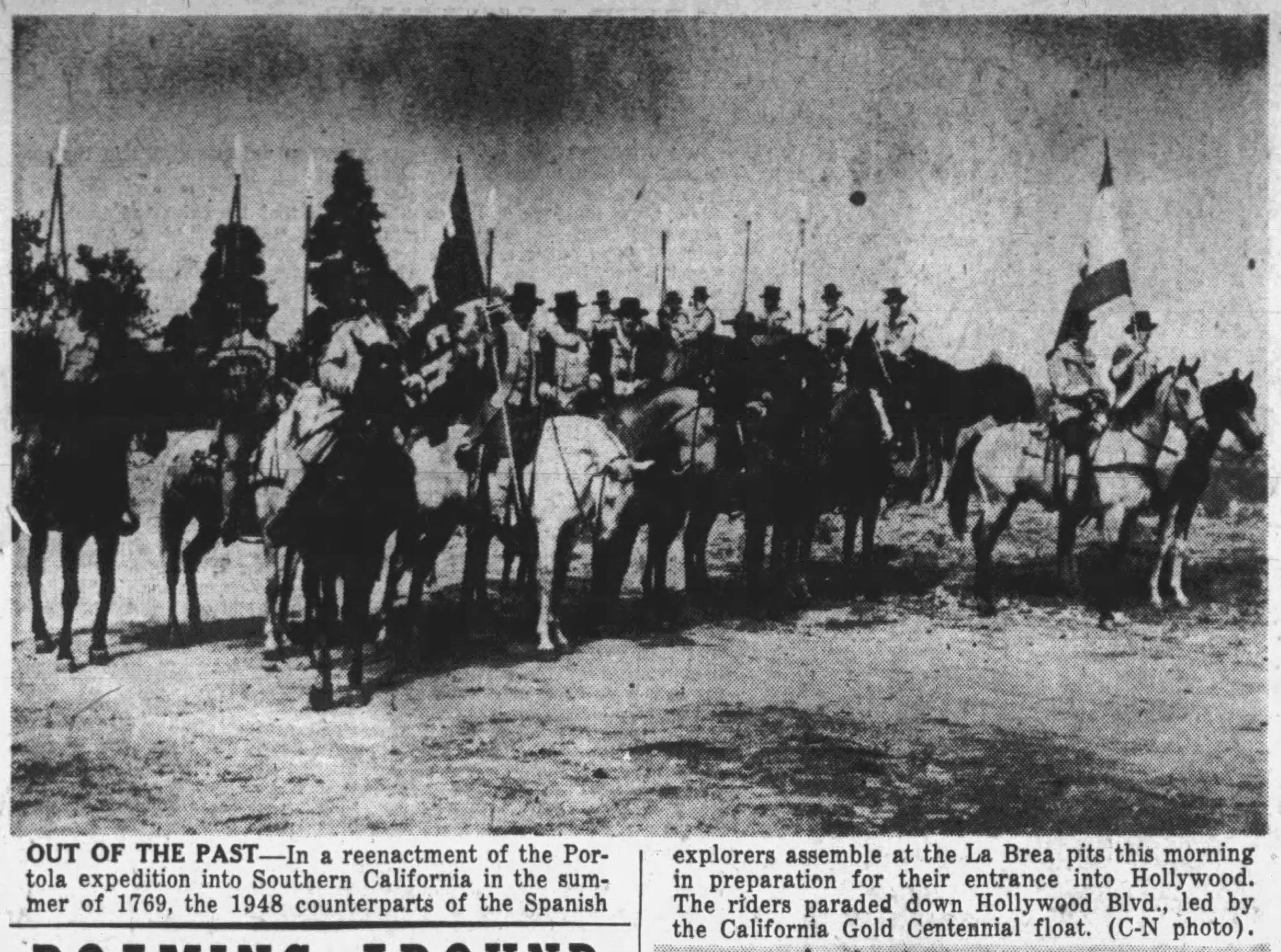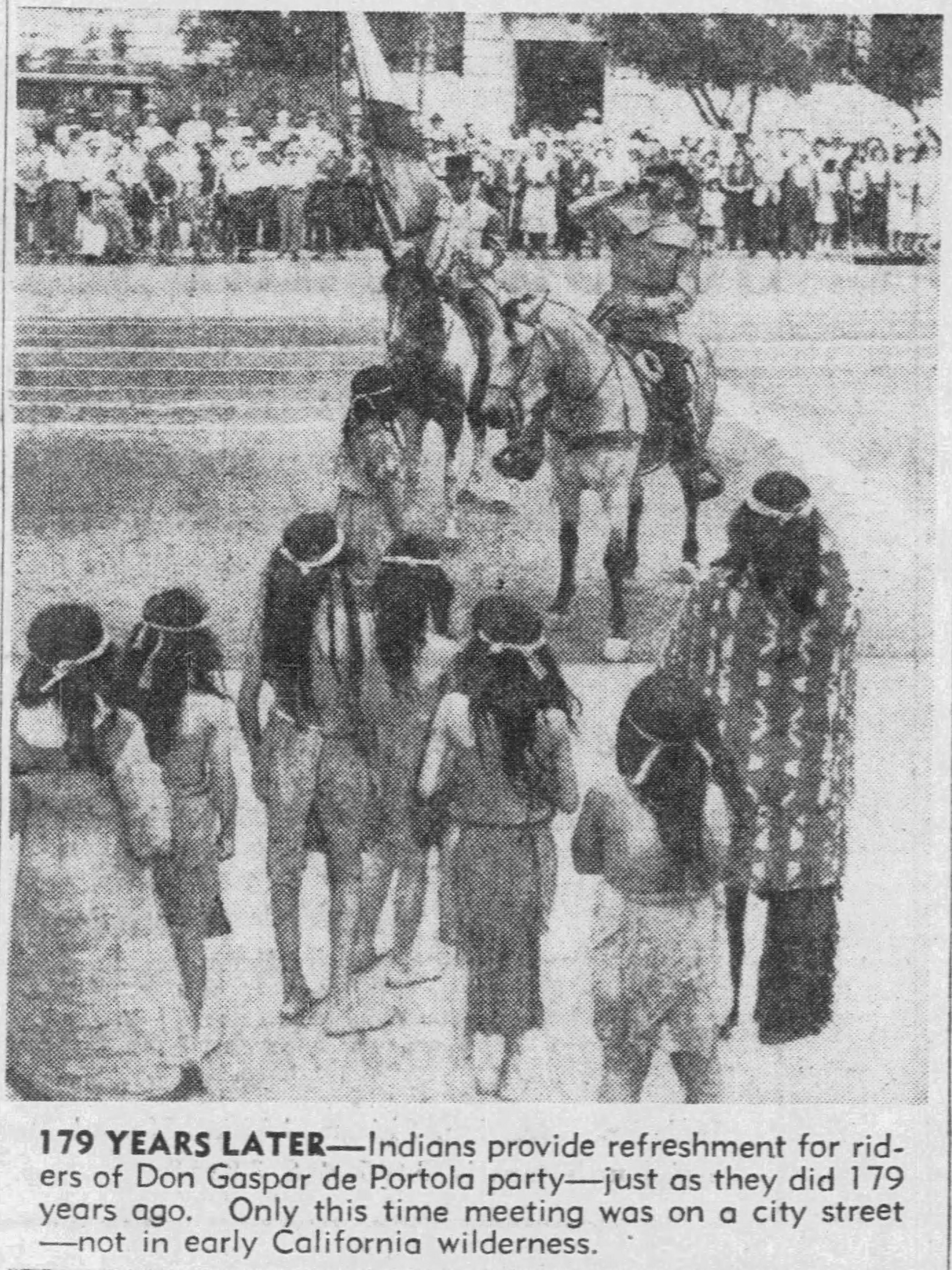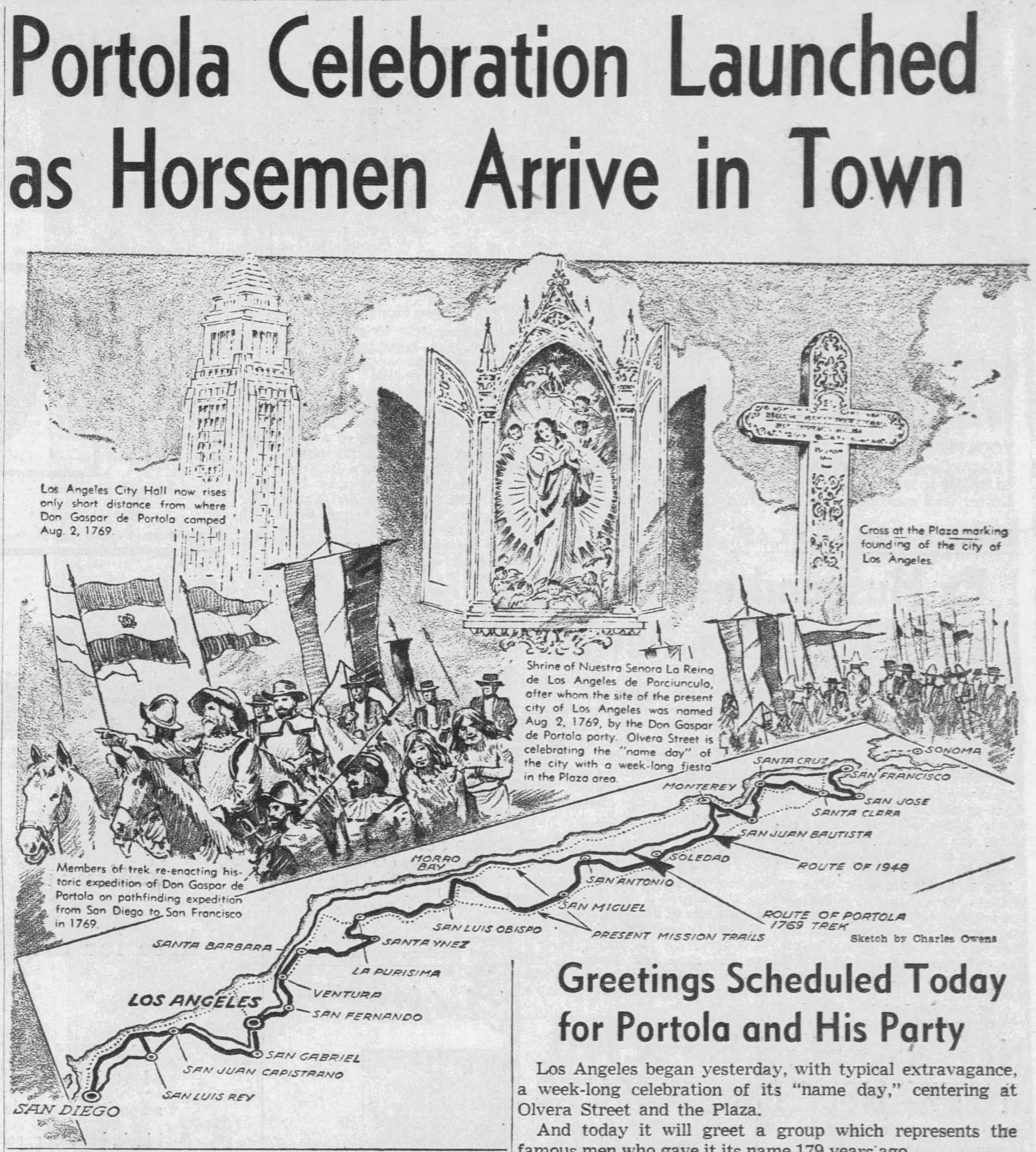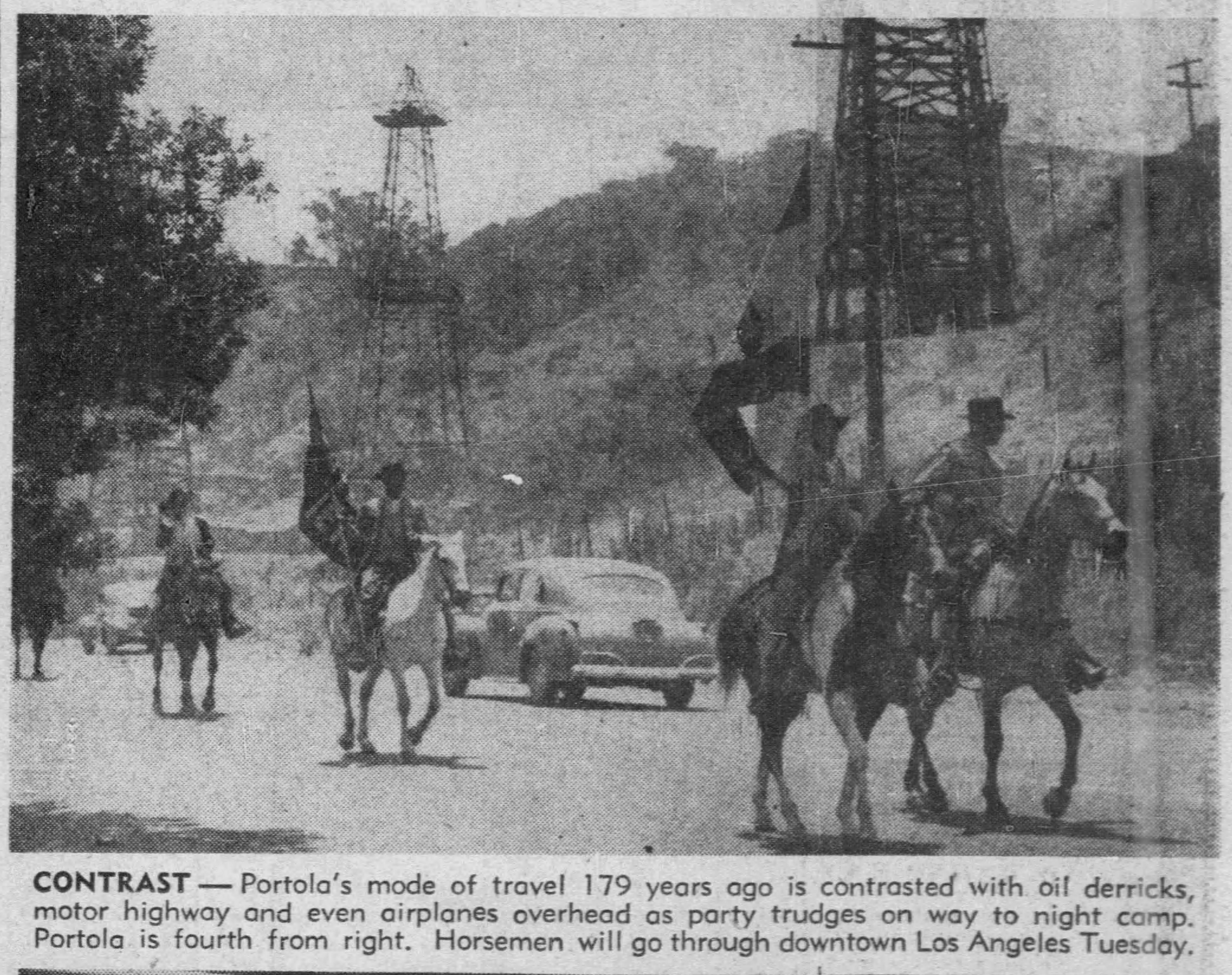The modern horsemen impersonating Portola and his party came in from Lincoln Park for welcoming ceremonies on the City Hall steps yesterday morning amid scenes that could not even have been imagined when the real Portola forded the little river christened ‘Porciuncula.’ Now that the Portola Trek was being re-enacted in 1948 as a feature of California’s Centennial years, the modern horsemen tried to picture that day of Aug. 2, 1769, when the region was named for ‘Our lady the Qieem pf tje Angels of Porciuncula (the shrine of St. Francis in Italy).’