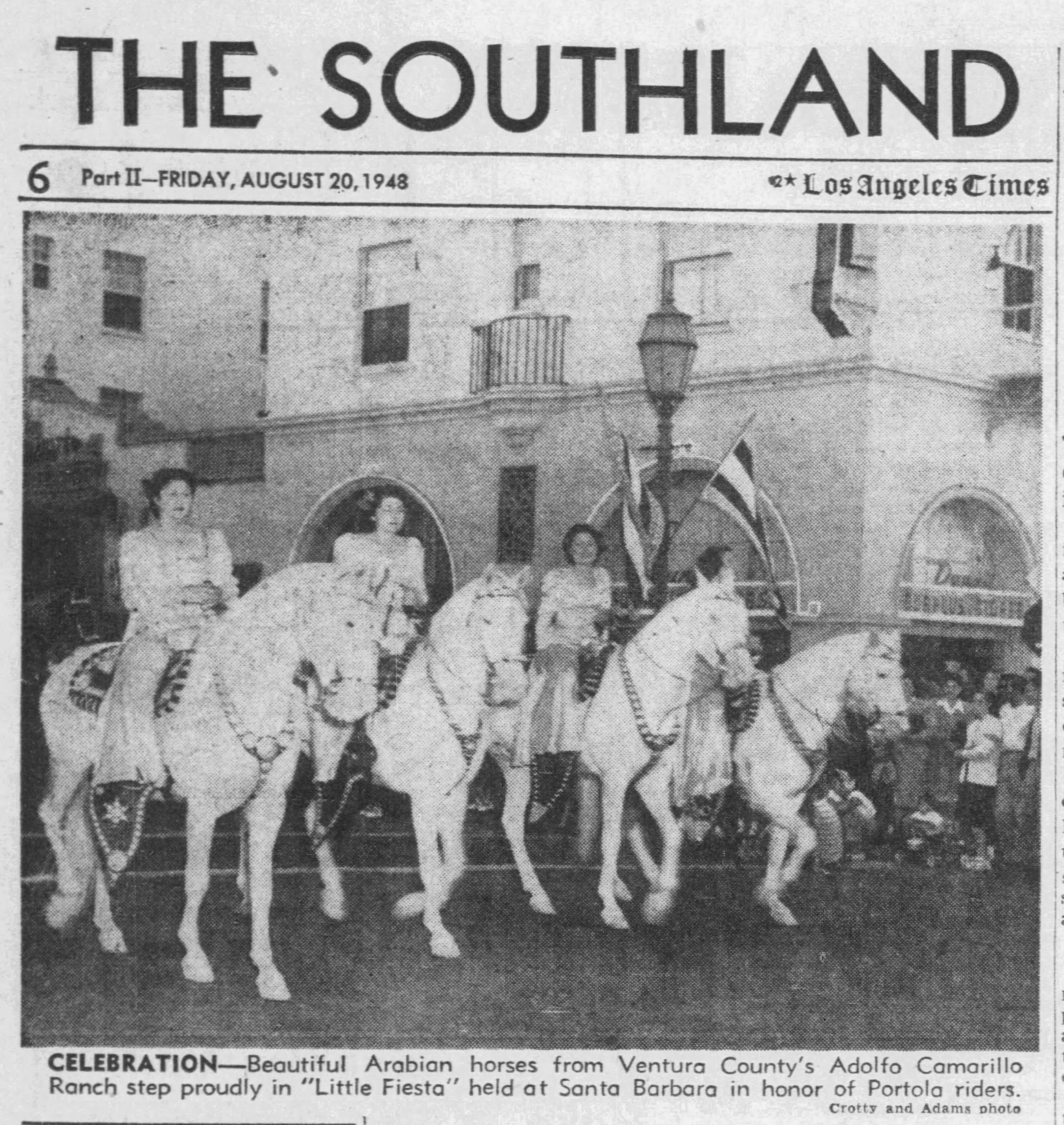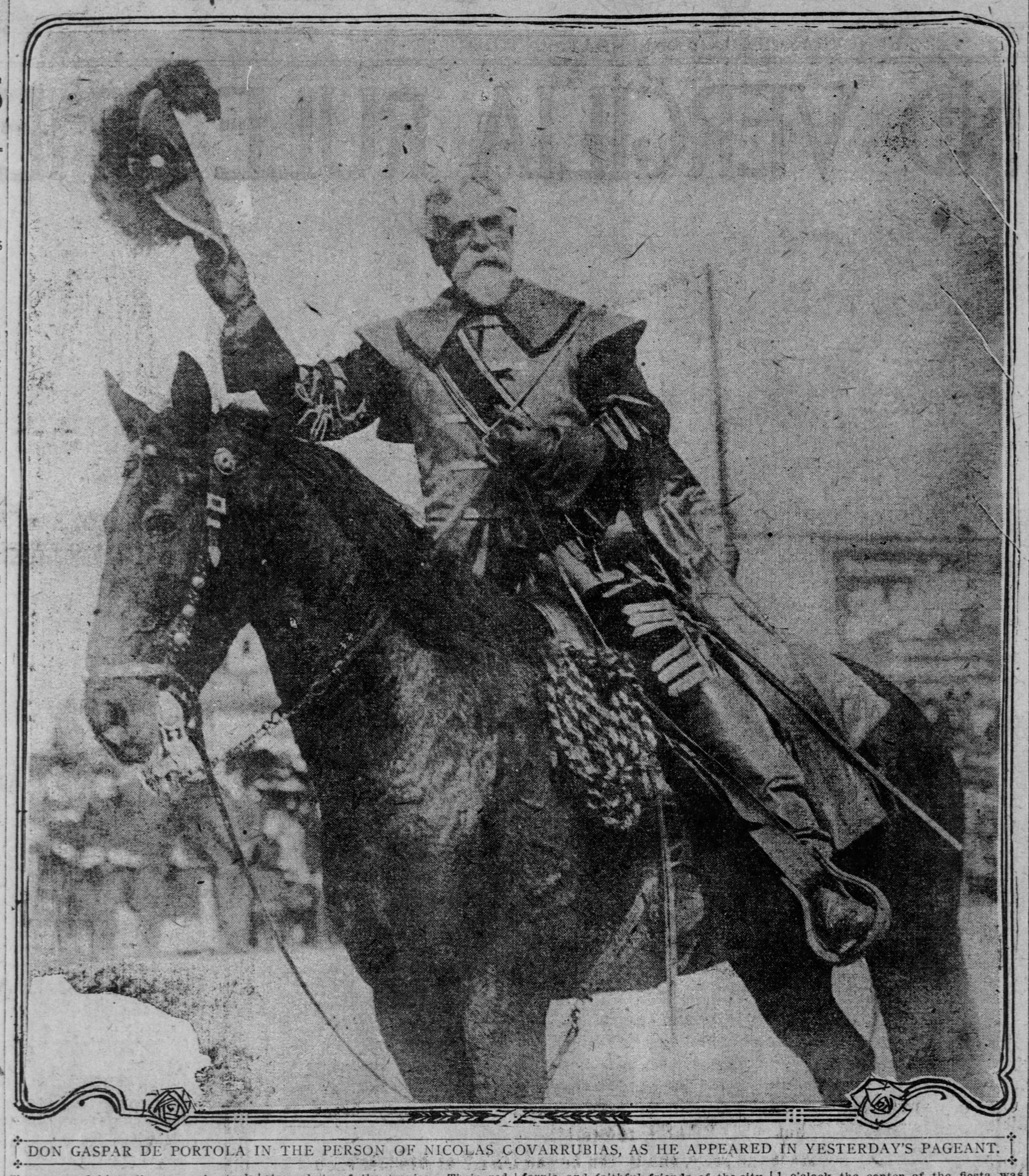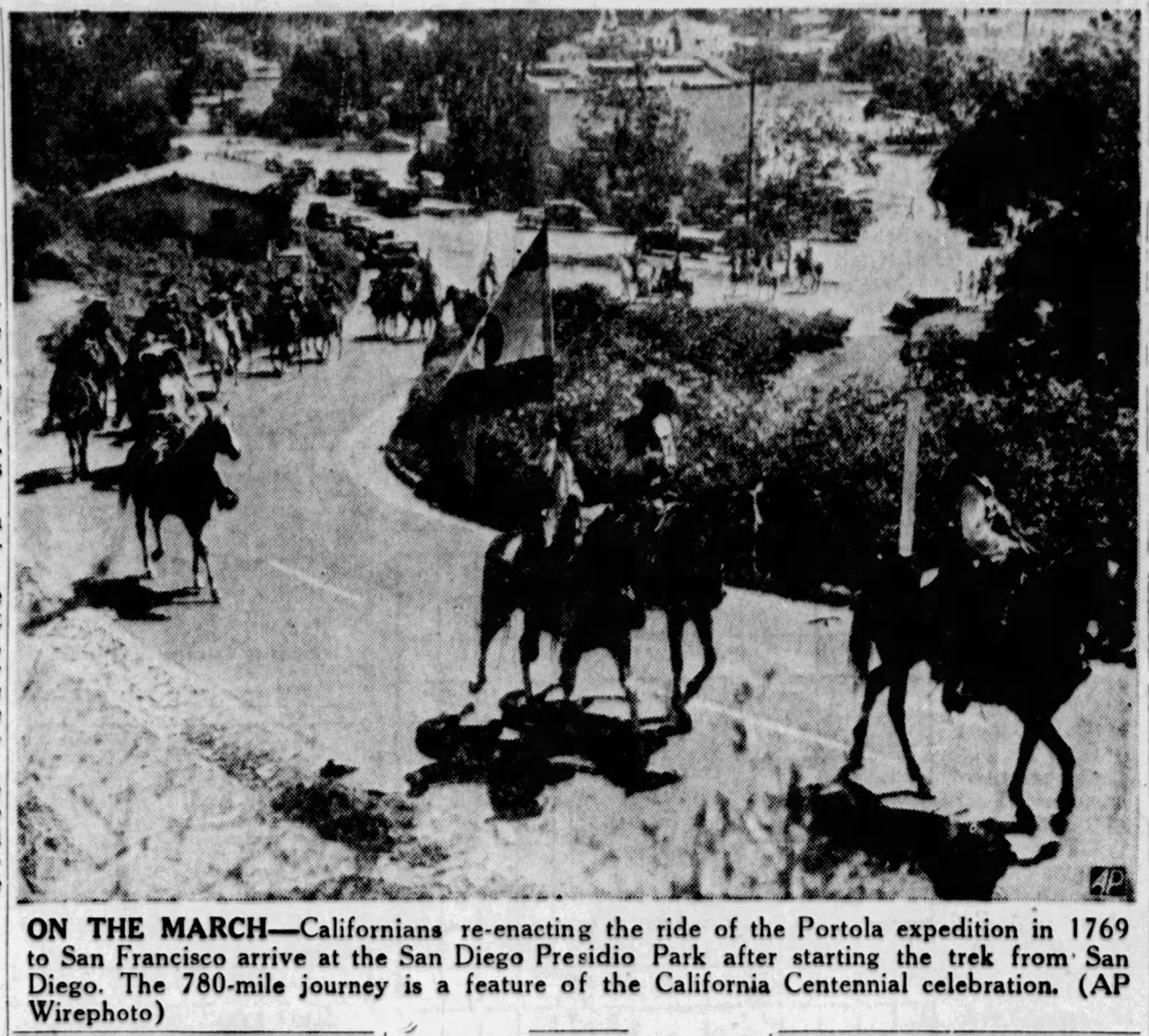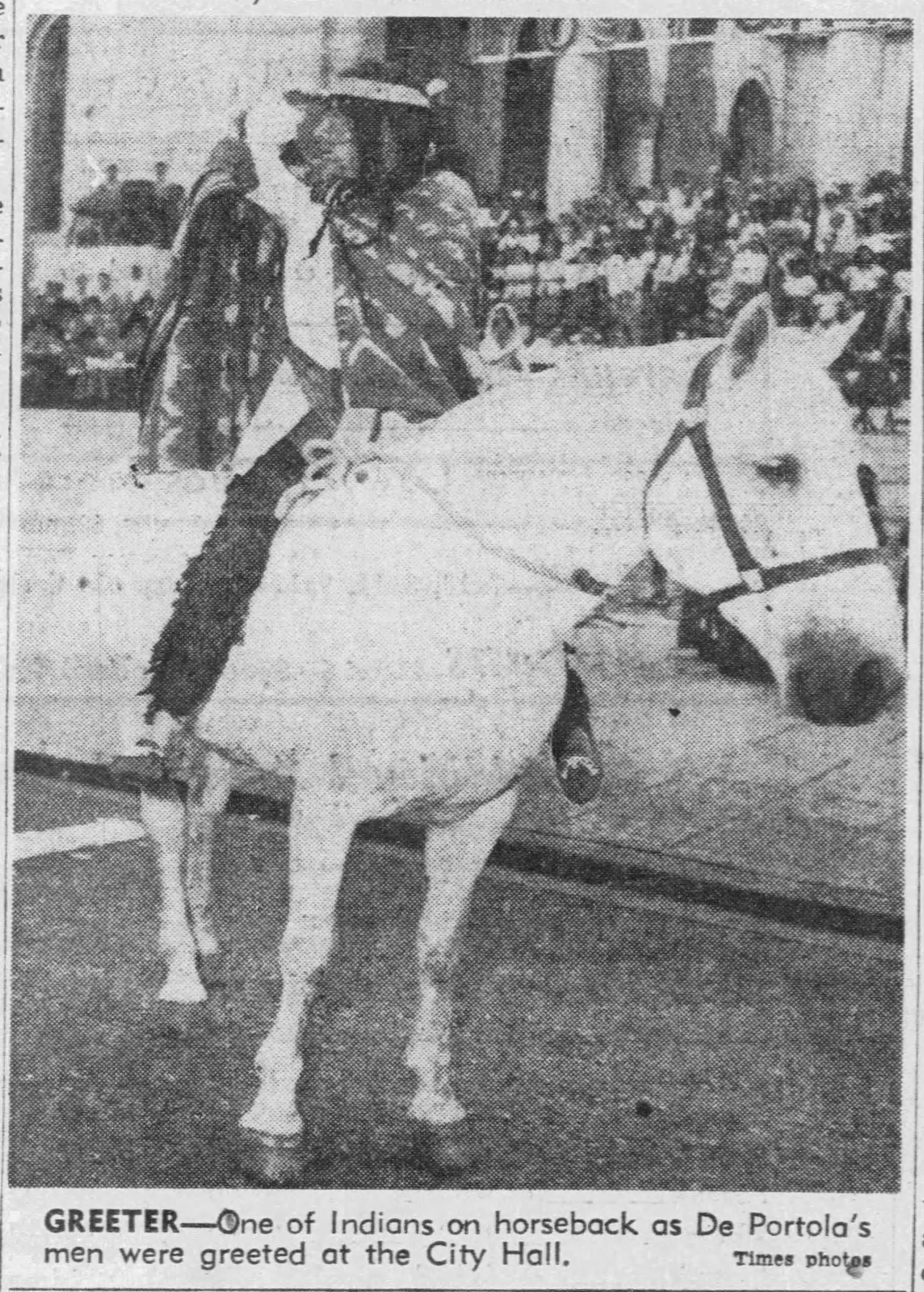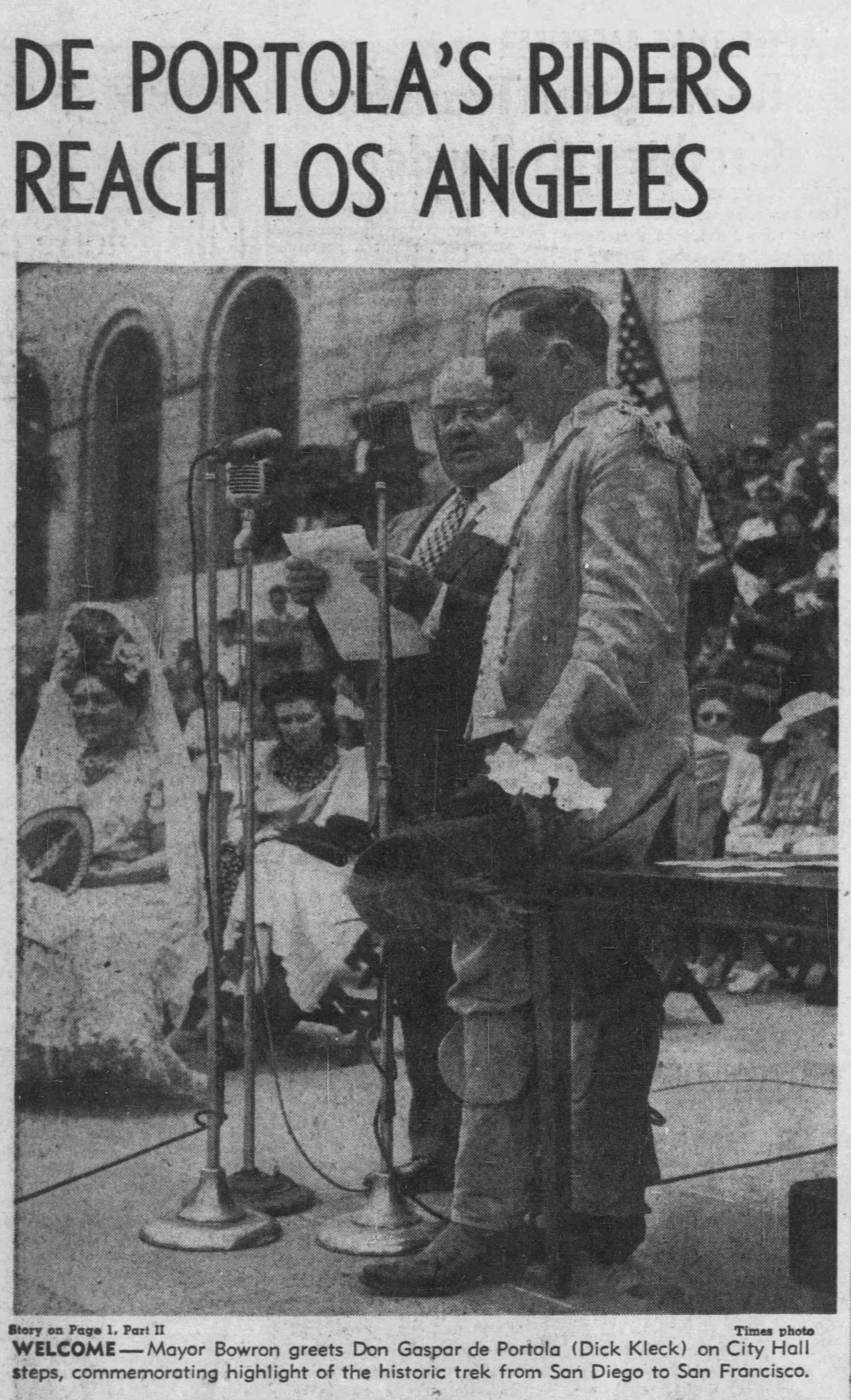 The modern horsemen impersonating Portola and his party came in from Lincoln Park for welcoming ceremonies on the City Hall steps yesterday morning amid scenes that could not even have been imagined when the real Portola forded the little river christened ‘Porciuncula.’ Now that the Portola Trek was being re-enacted in 1948 as a feature of California’s Centennial years, the modern horsemen tried to picture that day of Aug. 2, 1769, when the region was named for ‘Our lady the Qieem pf tje Angels of Porciuncula (the shrine of St. Francis in Italy).’