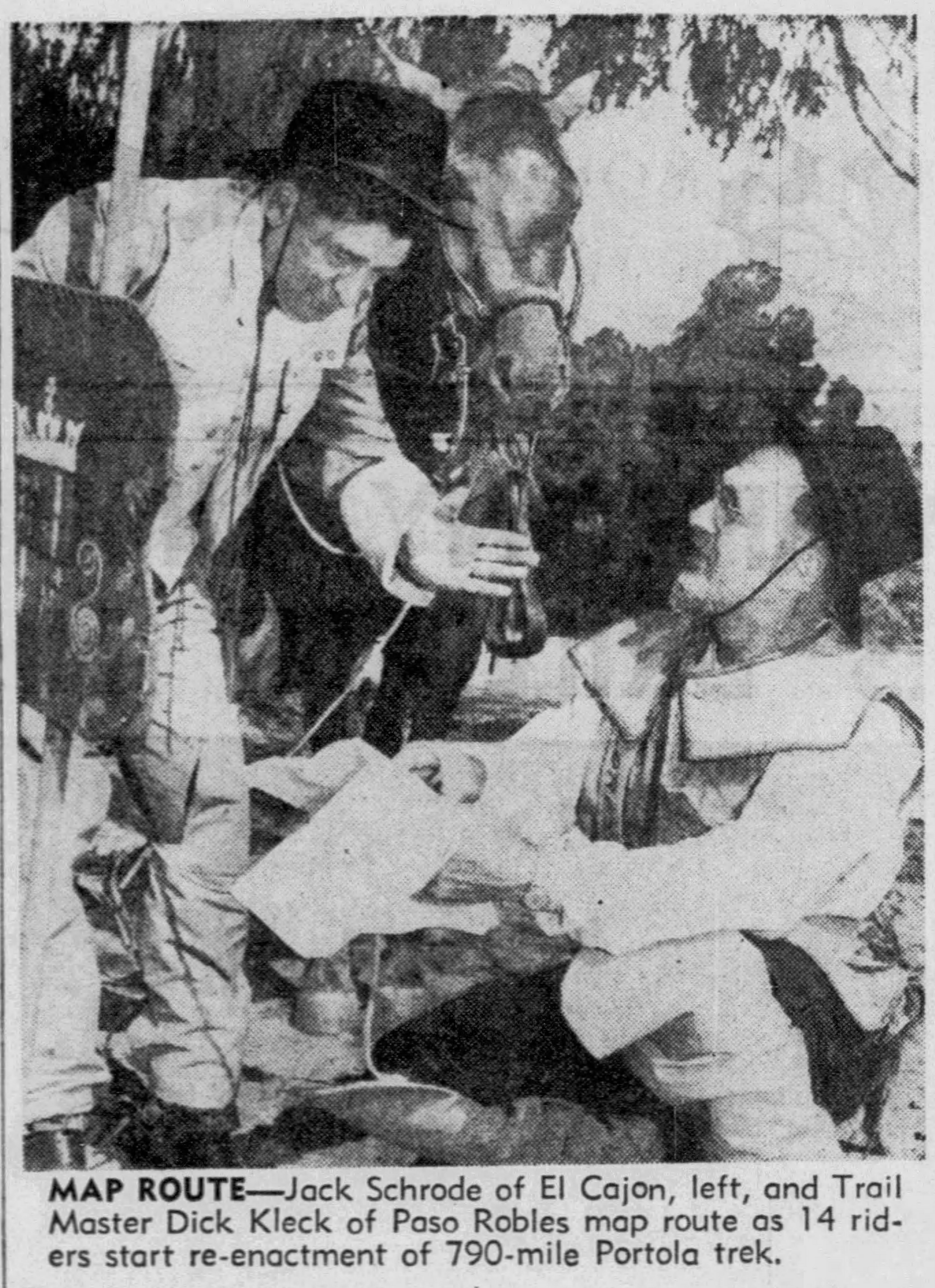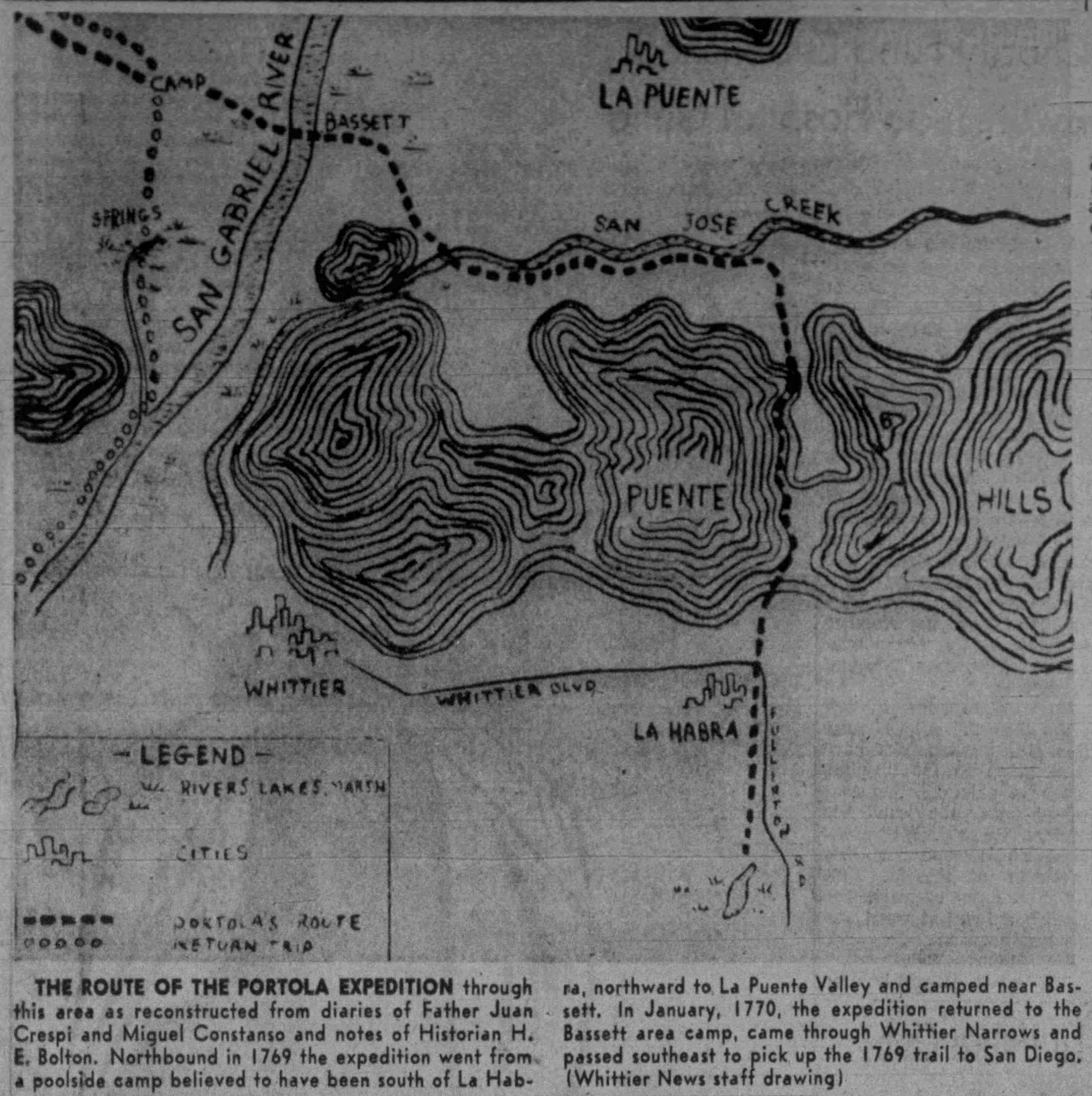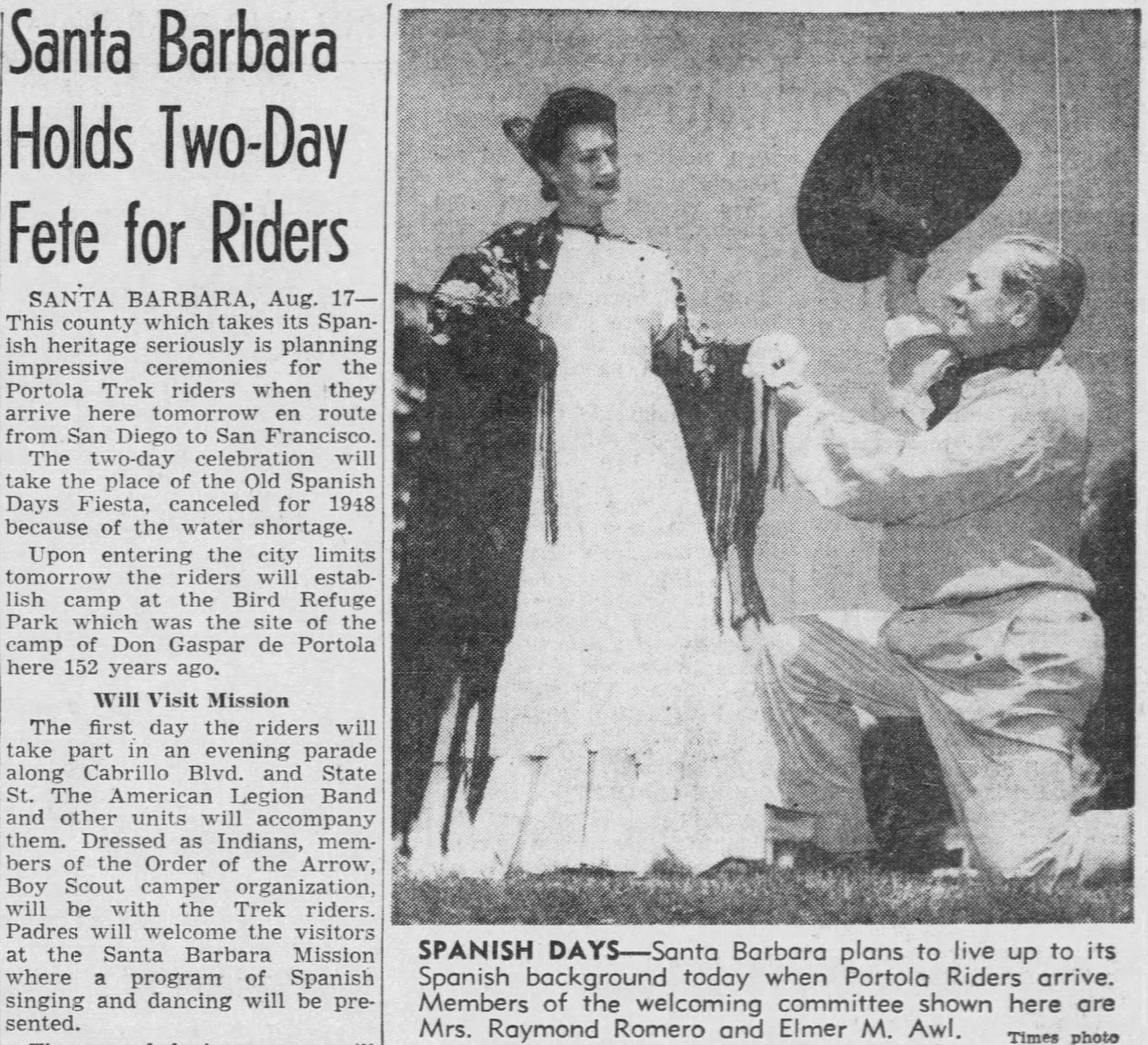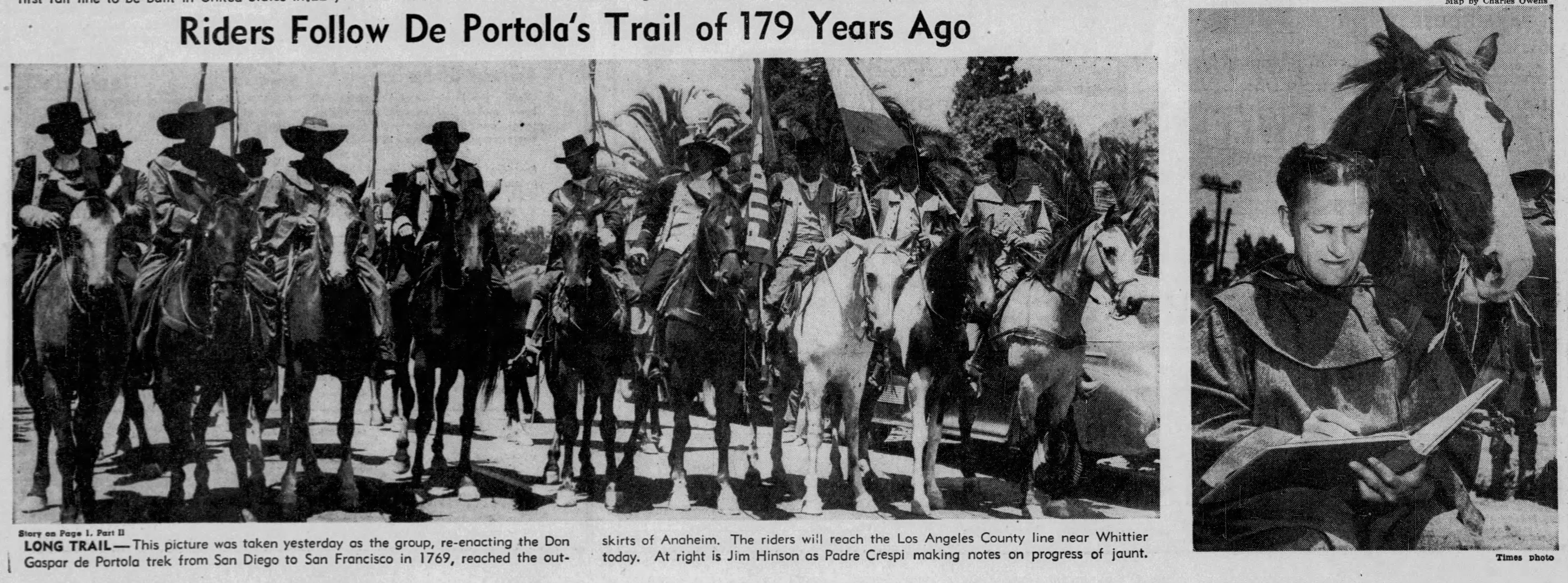 The modern horsemen impersonating Portola and his party came in from Lincoln Park for welcoming ceremonies on the City Hall steps yesterday morning amid scenes that could not even have been imagined when the real Portola forded the little river christened ‘Porciuncula.’ Now that the Portola Trek was being re-enacted in 1948 as a feature of California’s Centennial years, the modern horsemen tried to picture that day of Aug. 2, 1769, when the region was named for ‘Our lady the Qieem pf tje Angels of Porciuncula (the shrine of St. Francis in Italy).’