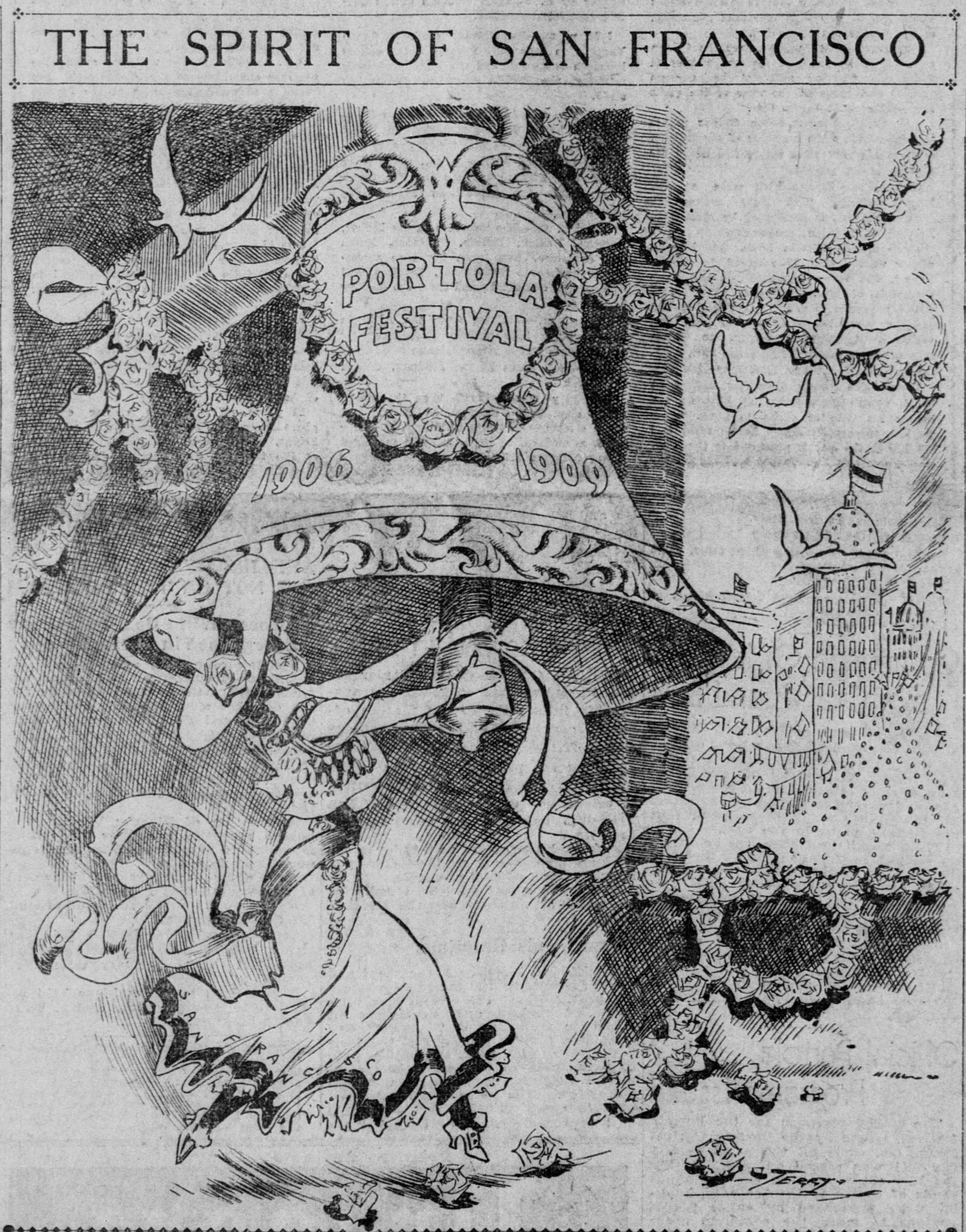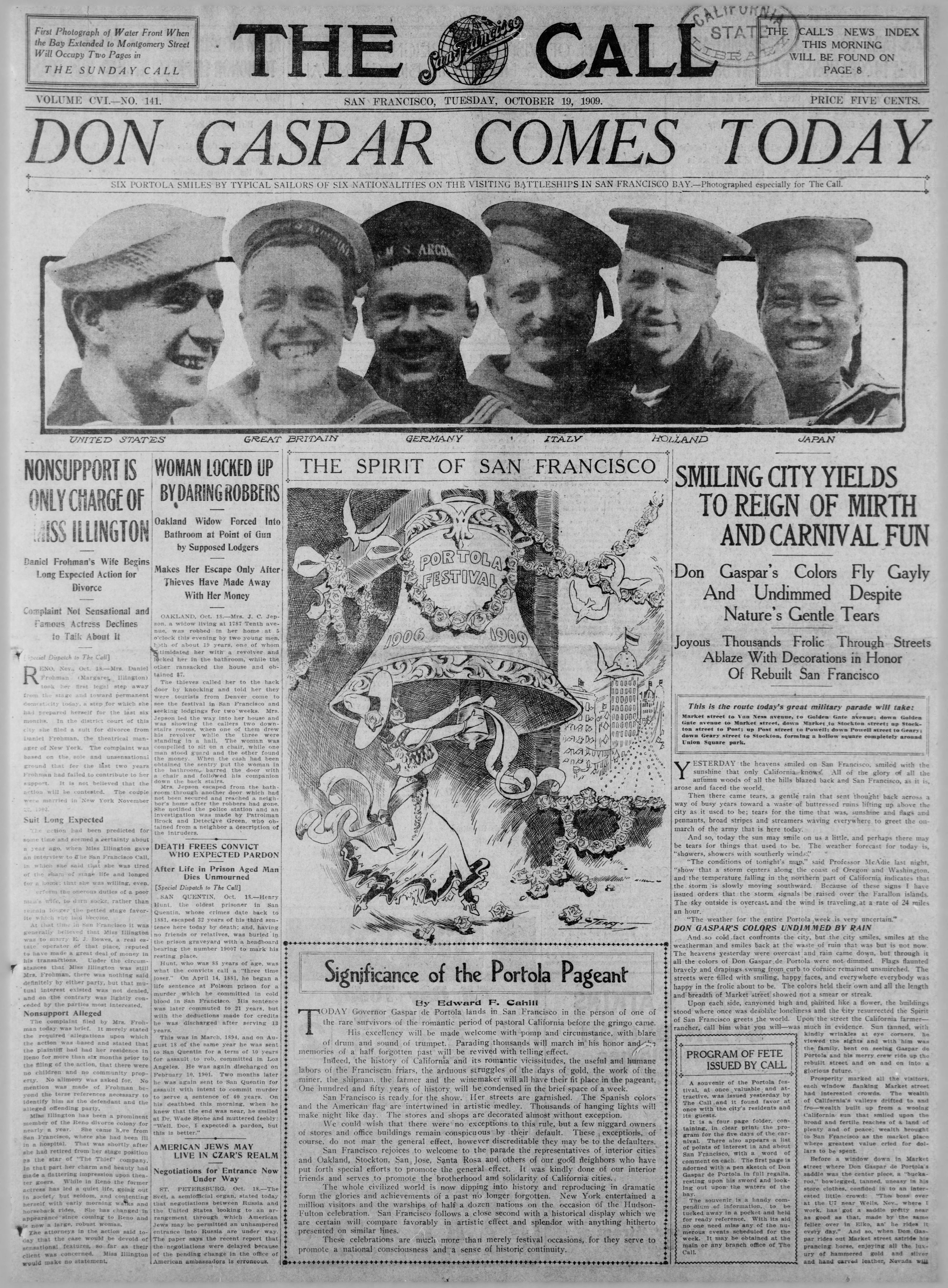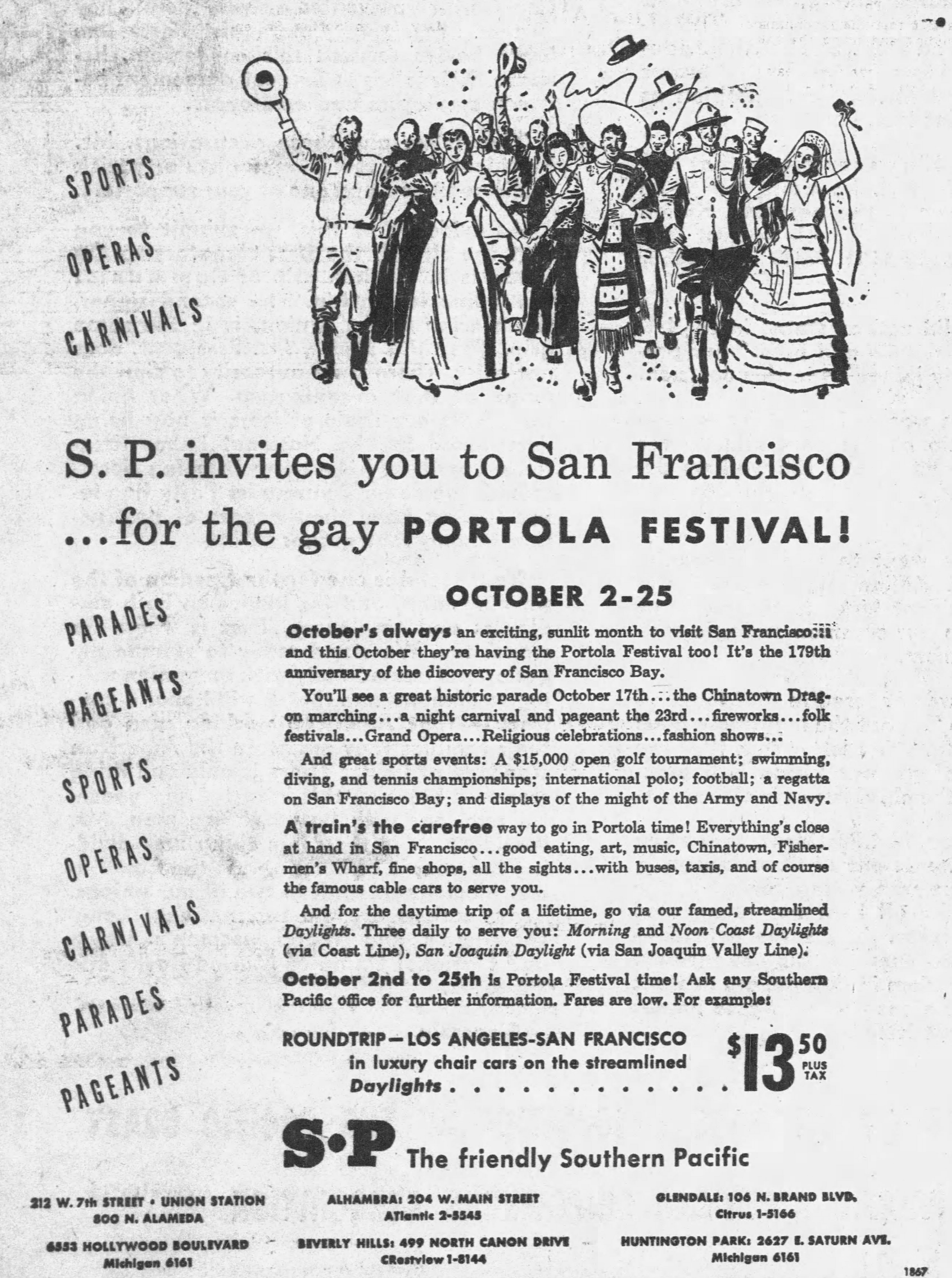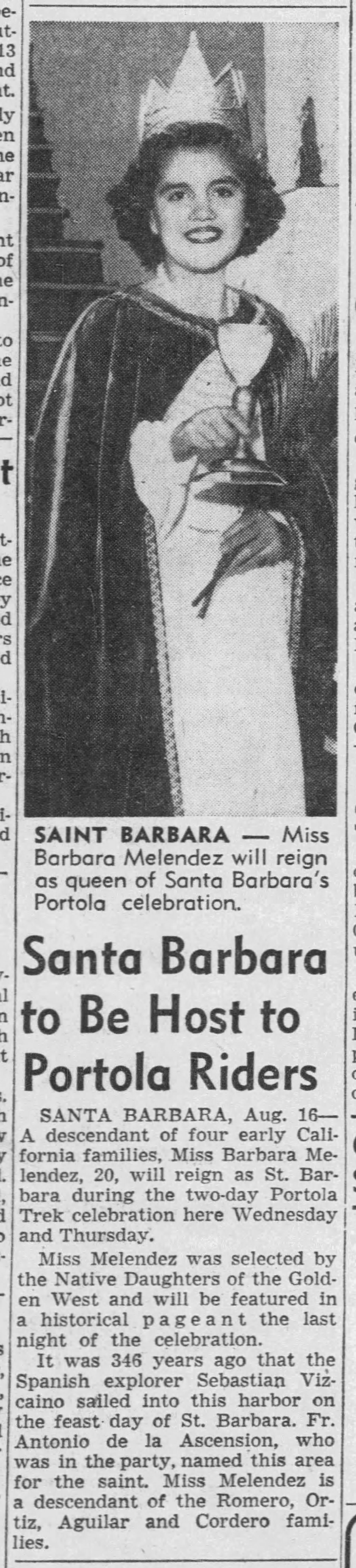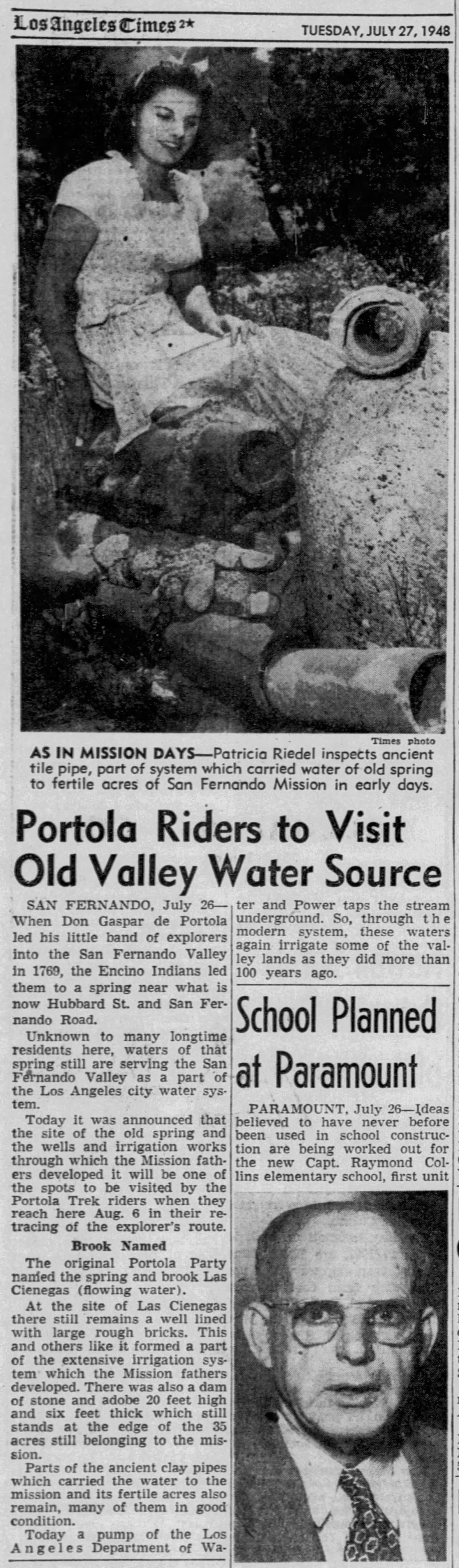 The modern horsemen impersonating Portola and his party came in from Lincoln Park for welcoming ceremonies on the City Hall steps yesterday morning amid scenes that could not even have been imagined when the real Portola forded the little river christened ‘Porciuncula.’ Now that the Portola Trek was being re-enacted in 1948 as a feature of California’s Centennial years, the modern horsemen tried to picture that day of Aug. 2, 1769, when the region was named for ‘Our lady the Qieem pf tje Angels of Porciuncula (the shrine of St. Francis in Italy).’
