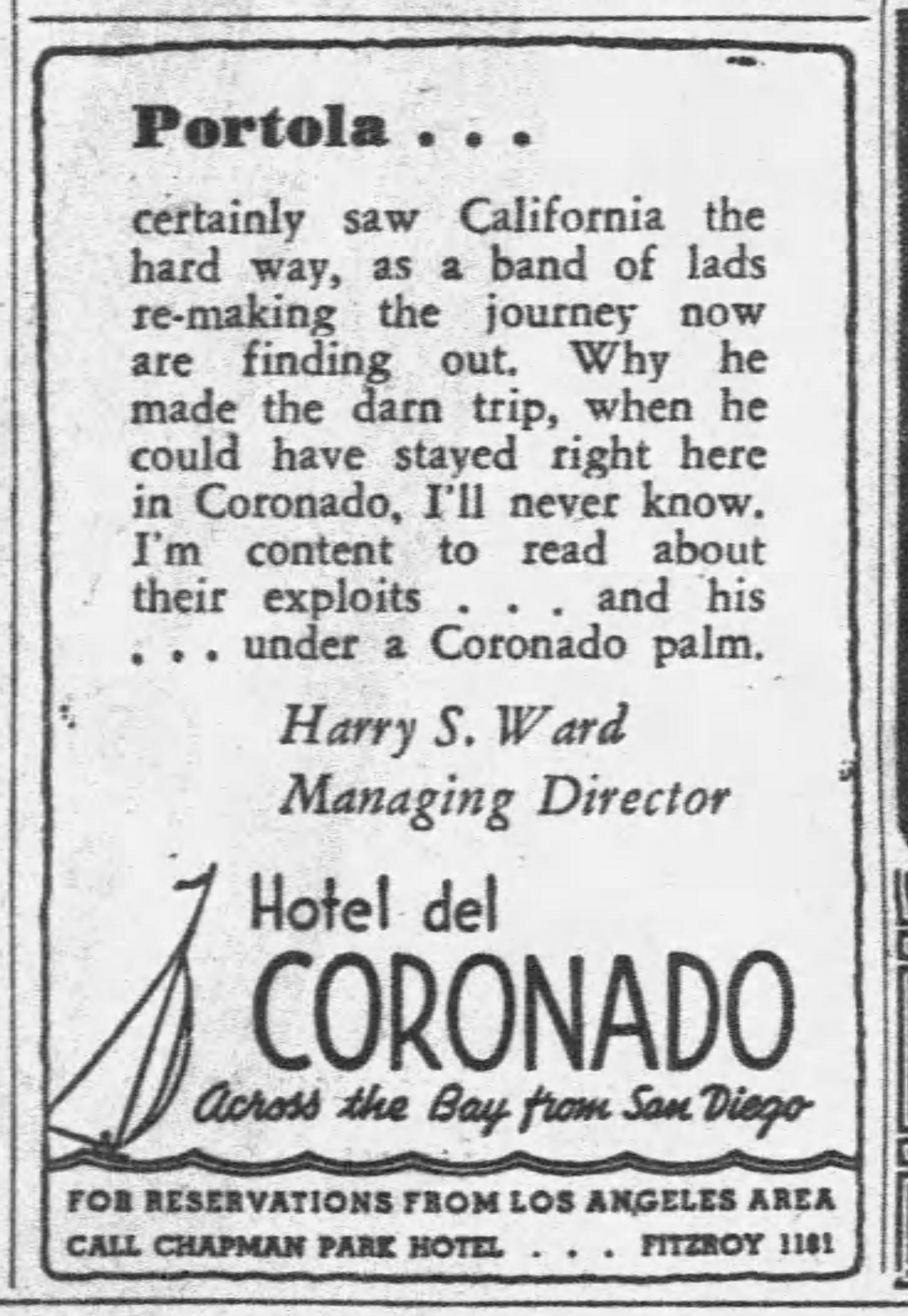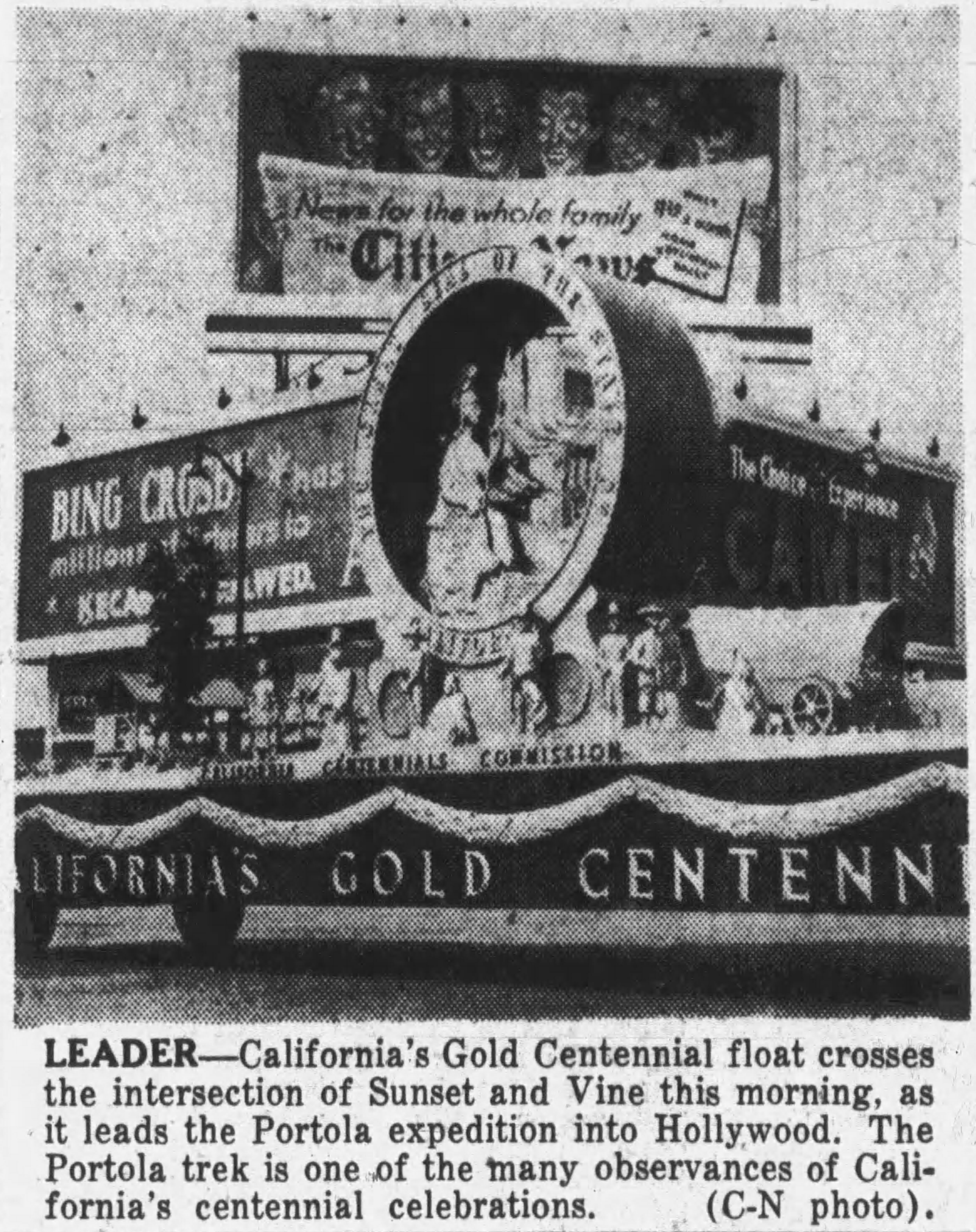Yesterday, by contrast, the Portola party abandoned what little greenery remains in metropolitan Los Angeles when it mounted under the flowering magnolia trees in Lincoln Park. Only bare pavement and telephone poles formed the ‘scenery’ as the official party of 14 riders accompanied by Los Angeles horsemen clattered toward the City Hall. Curious onlookers overran the park and crowded to the curbs along the streets at the horses passed.