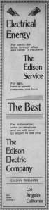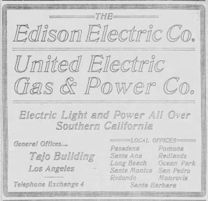 In conclusion it should be stated that the trustees of the Edison Electric Company are: Messrs. John S. Cravens, of Pasadena; James C. Drake, of Los Angeles; Henry Fisher, of Redlands; John B. Miller, of Pasadena; Frederick H. Rindge, of Santa Monica; Wm. R. Staats, of Pasadena; H. H. Sinclair, of Pasadena; J. S. Torrance, of Pasadena; Walter S. Wright, of Pasadena; while its executive officers and heads of departments are: Messrs. John B. Miller of Pasadena, president and treasurer; Henry Fisher of Redlands, first vice-president; J. S. Torrance of Pasadena, second vice-president; H. H. Sinclair of Pasadena, third vice-president; Wm. R. Staats of Pasadena, secretary; Walter S. Wright of Pasadena, counsel; W. L. Percey of Pasadena, assistant secretary and assist- ant treasurer; W. H. Workman Jr. of Los Angeles, technical assist- ant to the president; A. E. Halsey of Los Angeles, auditor; F. C, Finkle of Los Angeles, chief hydraulic engineer; O. H. Ensign of Los Angeles, chief electrical and mechanical engineer; C. A. Copeland of Los Angeles superintendent of distribution; A. L. Selig of Los Angeles, general agent; D. A. McGilvray of Pasadena, purchasing agent.