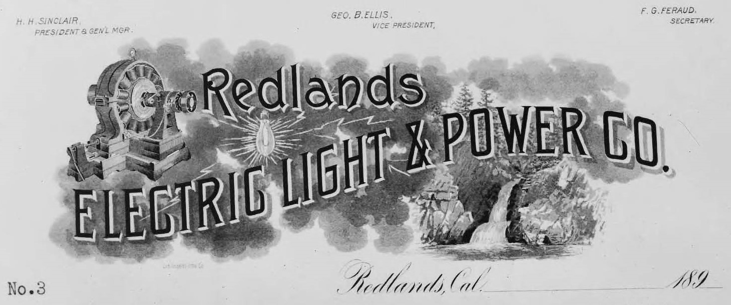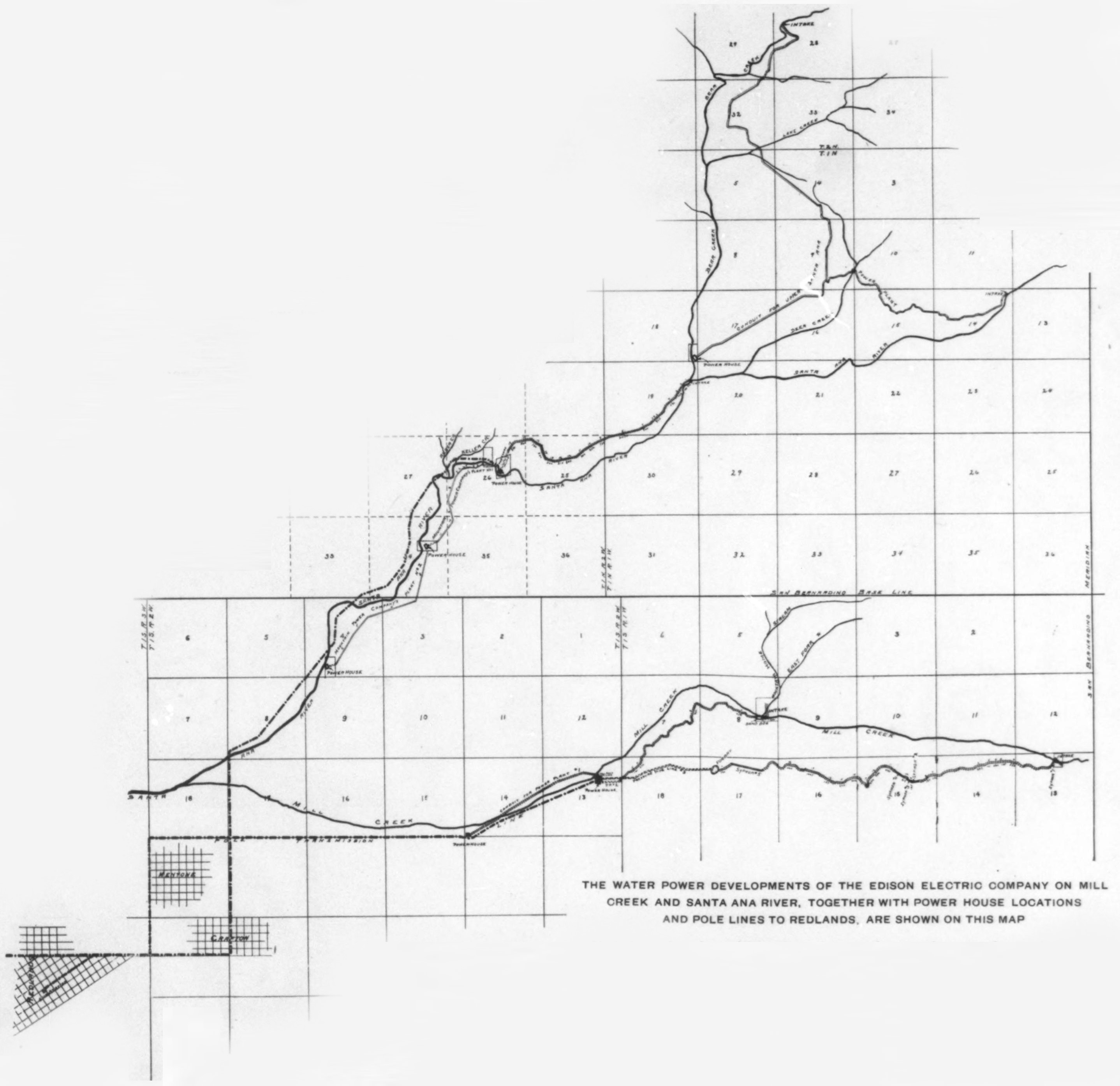 The Redlands Electric Light and Power Company was incorporated in the spring of 1892 by residents of the town of Redlands, in San Bernardino County, for the purpose of supplying electric light and heat for both public and private use, power for manufacturing purposes and for the operation of street railroads in the city of Redlands and the country round about within a radius of ten miles, such power to be developed from a transmission plant that was to be built at the mouth of Mill Creek Canyon, some eight miles distant. At that time Redlands was a promising city with a population of 4,500 people, and was lighted solely by oil and a few private gasoline plants. Coal was worth $11. a ton, and although the town was a small one, its prospects were exceedingly bright. It was further borne in mind by the promoters of the enterprise that the cities of Riverside and San Bernardino, each of a population of about 10,000, were comparatively near by, that is at a distance by rail of fifteen miles and nine miles respectively. These were then lighted by electricity generated from a water power developed from the irrigation canal which supplied Riverside, and the amount of power so obtained was of very limited quantity. The towns were then connected with each other and Redlands by a steam motor road, which it was hoped would eventually be changed to an electric railway system, to be operated by power developed at the Redlands plant.