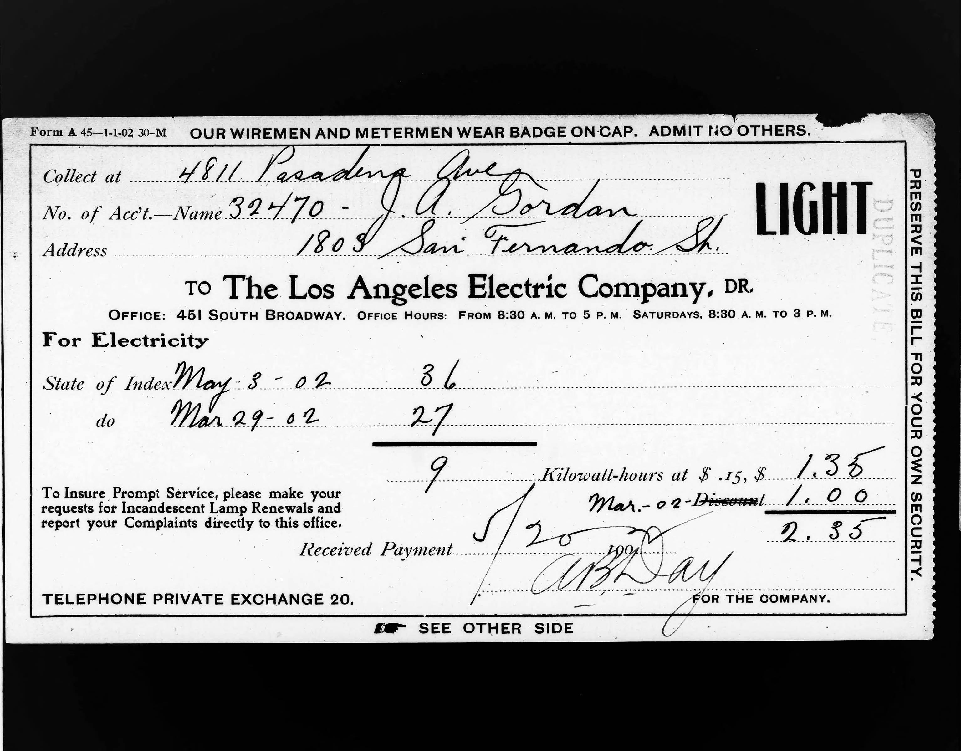But before starting this rather primitive electric lighting plant, Mr. Peck was naturally looking for capital to aid him in its development, and as a result of his labors, Messrs. George H. Barker, W. R. Staats and W. S. Wright, of Pasadena, associated themselves with him, and in December, 1895, a Fort Wayne 50-kilowatt 2,000-volt alternator and some Fort Wayne transformers and Shallenberger meters of various sizes were ordered. In January, 1896, Mr. E. Y. Ware came from Denver and joined in the enterprise, and under his direction the work of running a line to supply alternating current lighting service was begun. In the meantime Mr. Peck renewed his efforts to persuade the Council to advertise another franchise for sale, but without success. Nevertheless, the lines from the little plant were extended into the city by setting poles on private property and simply crossing the streets with the line wires, but the lines were harassed by competitors, and the city at last cut the wires. These were replaced as fast as cut, and they were finally let alone. Despairing of getting a franchise of their own for the city, the owners of the plant finally bought an old franchise known as the Scott Franchise, in the spring of 1896.