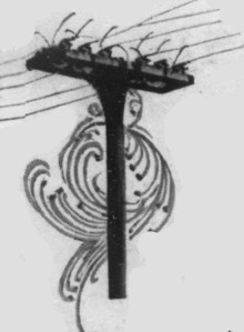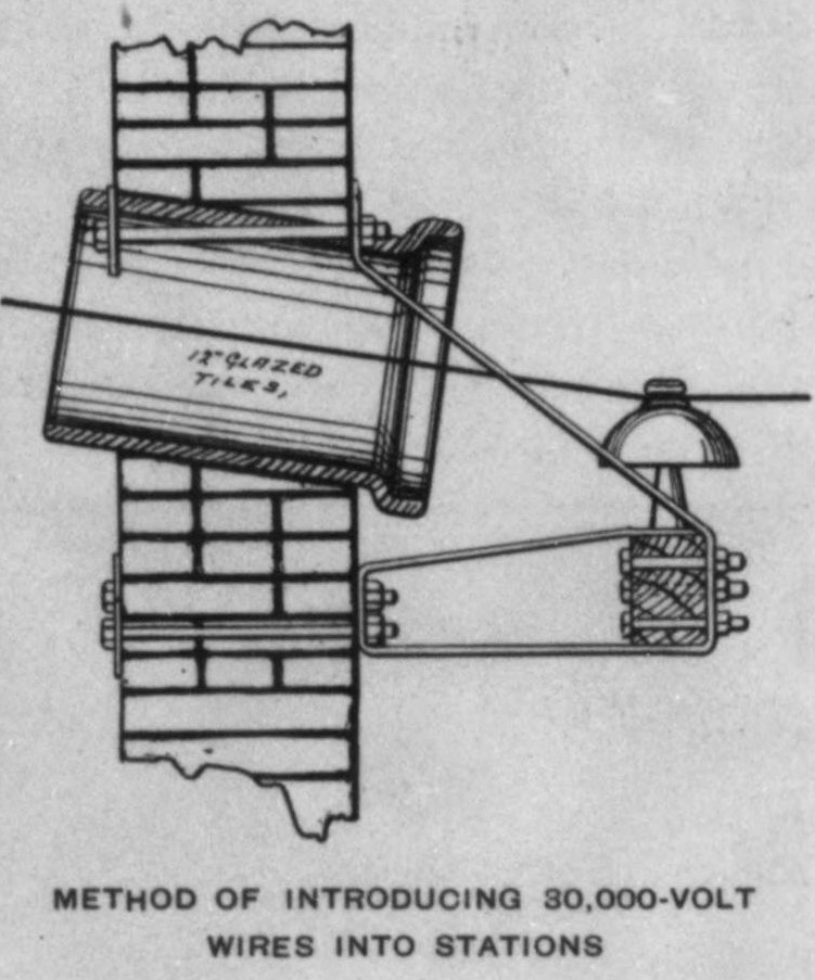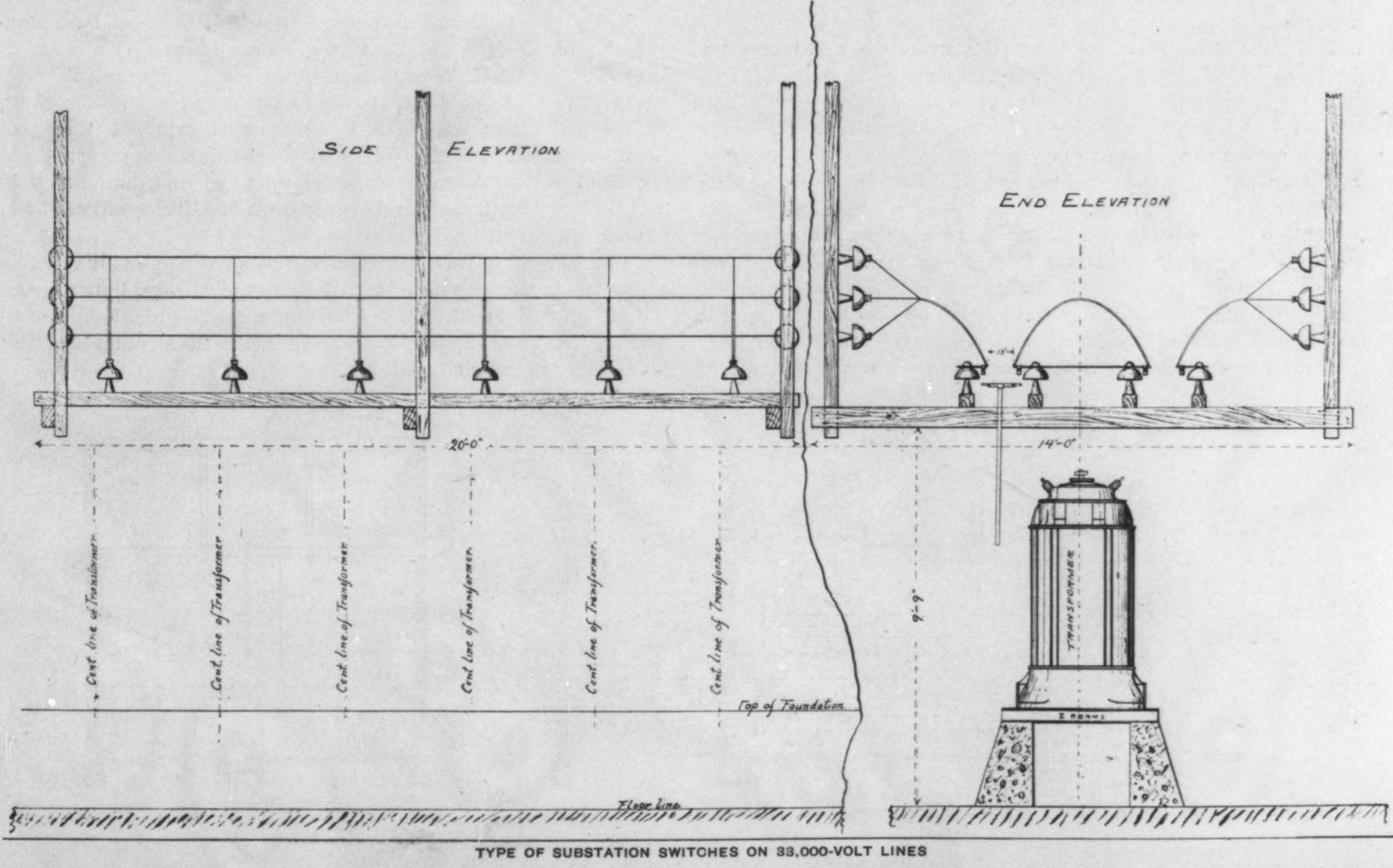 ‘In starting this plant in February, 1899, the potential was raised very slowly — a step at a time. At about 16,000 volts the lightning arresters started jumping, and it was necessary to increase the air gap in them about double. The brush discharge from the balls of the lightning arresters probably bridged over at least half of the air gaps. At about 18,000 volts the instruments at each end of the line gave indications that the current was jumping somewhere. Lowering the potential a few hundred volts stopped it, only to start again as soon as it was attempted to raise the potential. The plant was then shut down and a thorough inspection of the eighty-three miles of line was made without finding any trace of the trouble. The plant was then started at night, and the potential was raised to keep the current jumping, and the trouble was soon discovered. The line men, in running the wires, had crossed the line between two poles so that one wire hung about an inch below the other. This, from the ground, looked like a transposition, and so was not discovered. At about 18,000 volts the current would jump from one wire to the other, then run along the line, increasing its arc until it would break, then jump to the shortest distance again. The station agent at Ontario saw the fireworks two miles down the track and reported by telephone. As soon as the lines were cleared the potential was run up to 33,000 volts with no more trouble.’