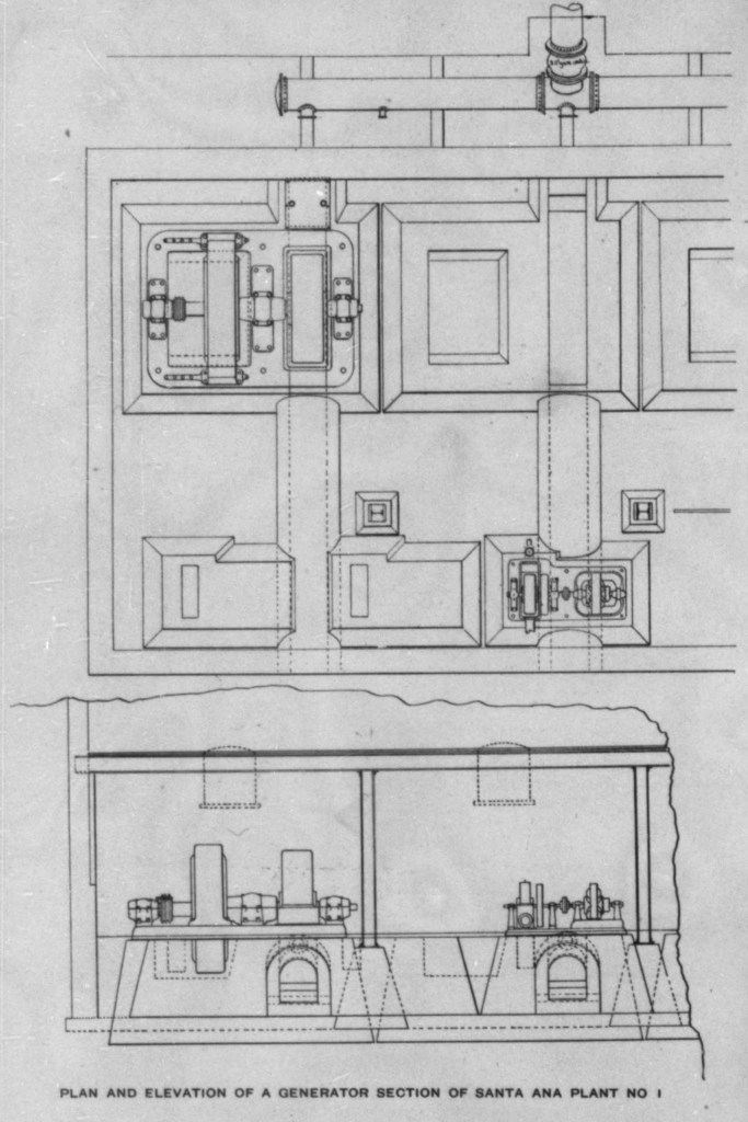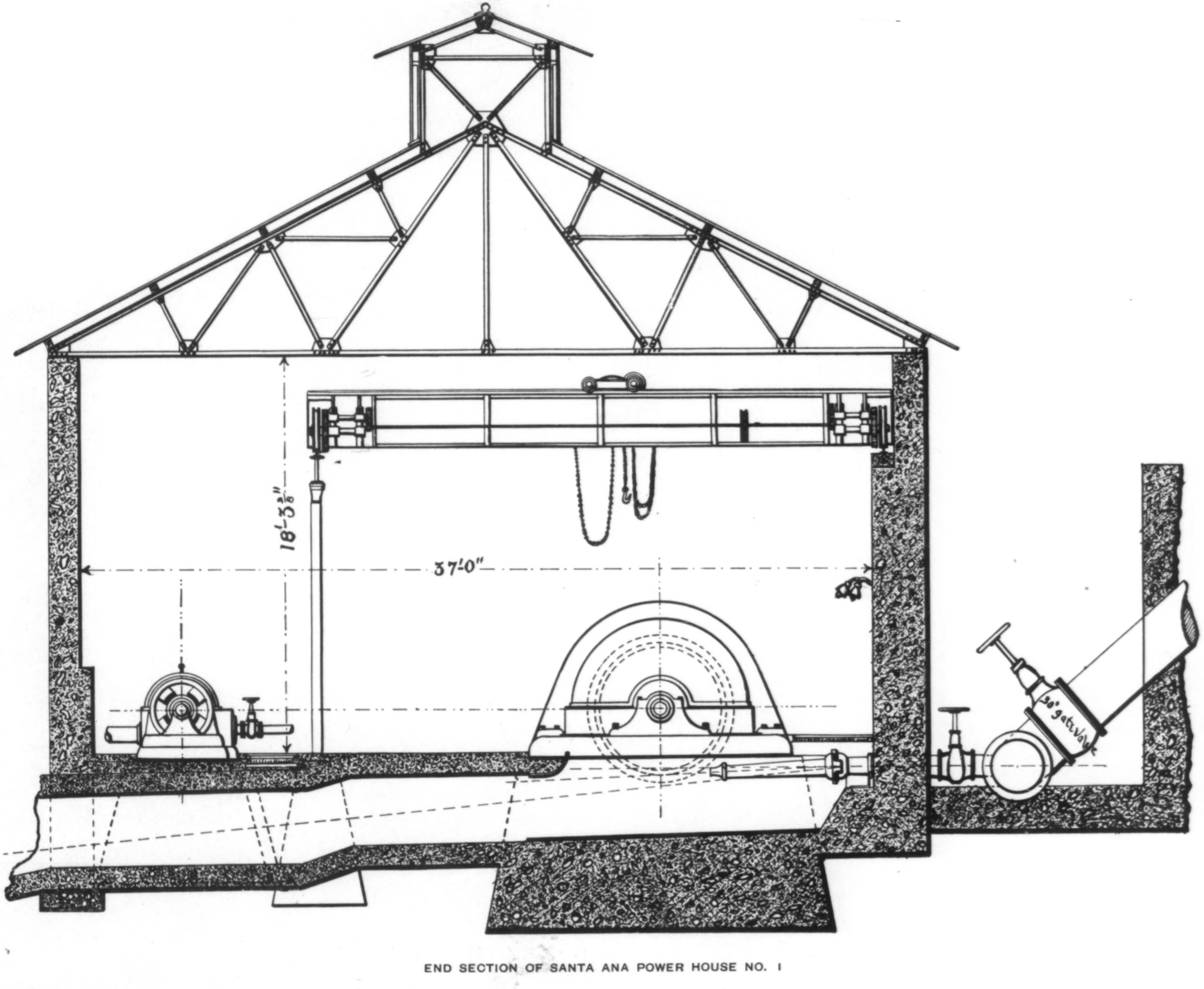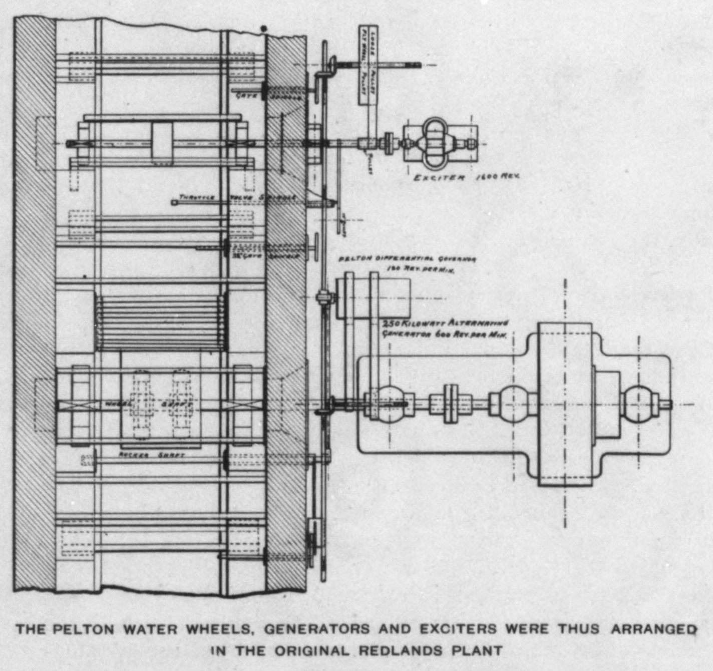 The designs and superintendence of construction for the above were by F. C. Finkle, during 1898 and 1899, as chief engineer of the Redlands Electric Light and Power Company, which built the plant. The water wheels were designed by the Pelton Water Wheel Company, and the electrical equipment by the General Electric Company, but were installed under the superintendence of H. H. Sinclair, president, and F. C. Finkle, chief engineer, of the Redlands Electric Light and Power Company.
