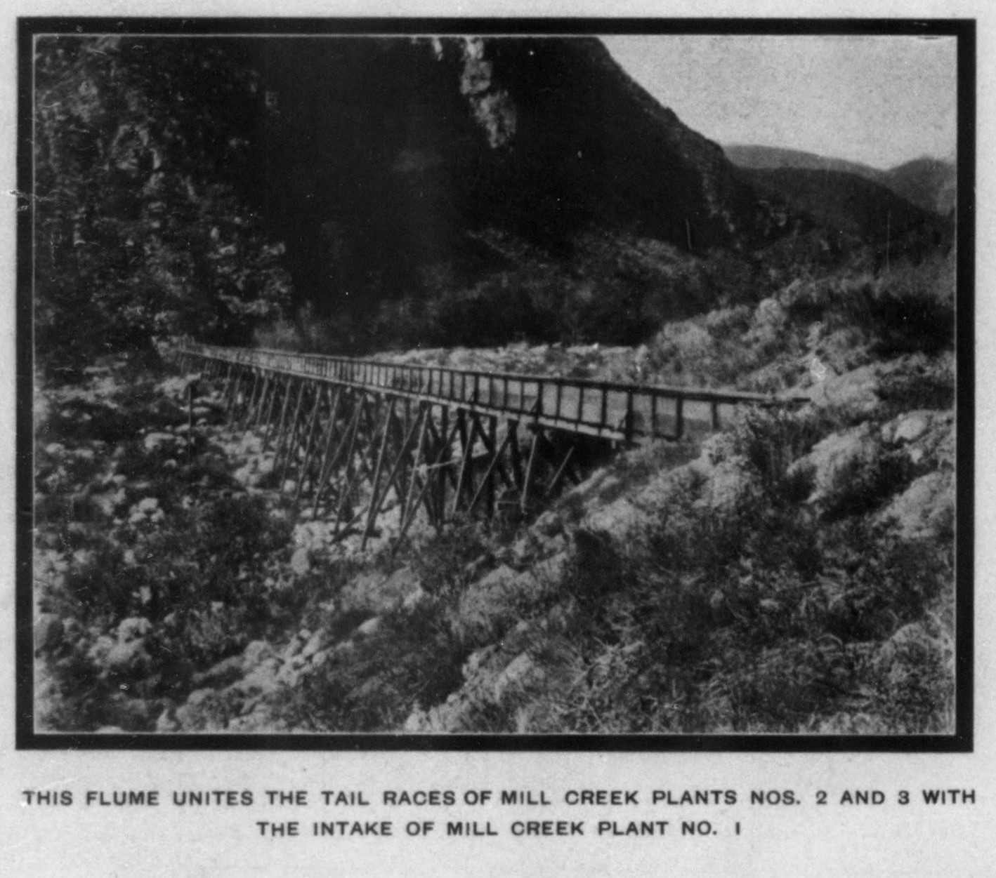 For the overflow of the forebay a waste flume, constructed of two-inch clear surfaced redwood, and 1,200 feet in length, extends down the slope of the mountain to Mill Creek. This waste flume is for carrying any portion, or all, of the water flowing in the gravity conduit back to Mill Creek stream when it is not passing through the pressure pipe. It has a capacity sufficient to carry all of the water flowing in the gravity conduit, and it is securely anchored to the bedrock and soil of the mountain.