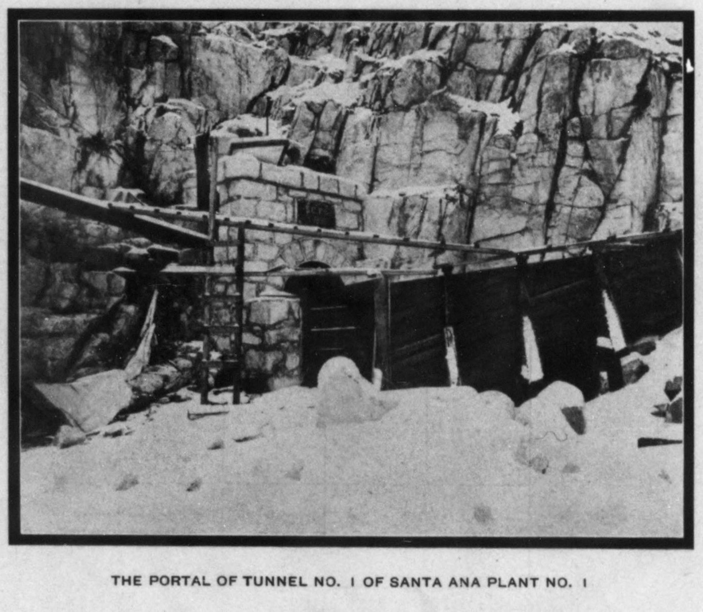 It is a truly remarkable experience to go over the water courses of The Edison Electric Company in Santa Ana Canyon. Perhaps I might better have said through the water courses, for the tunnels are indeed the most interesting part of the whole work. The story of the great reservoir at Bear Valley, of its enormous storage capacity and of the Paradises which its waters have wrenched from arid wastes, is an oft-told tale so I will not repeat it.