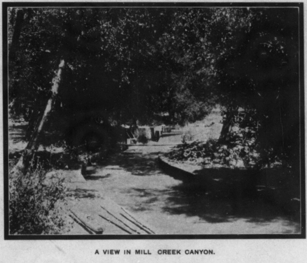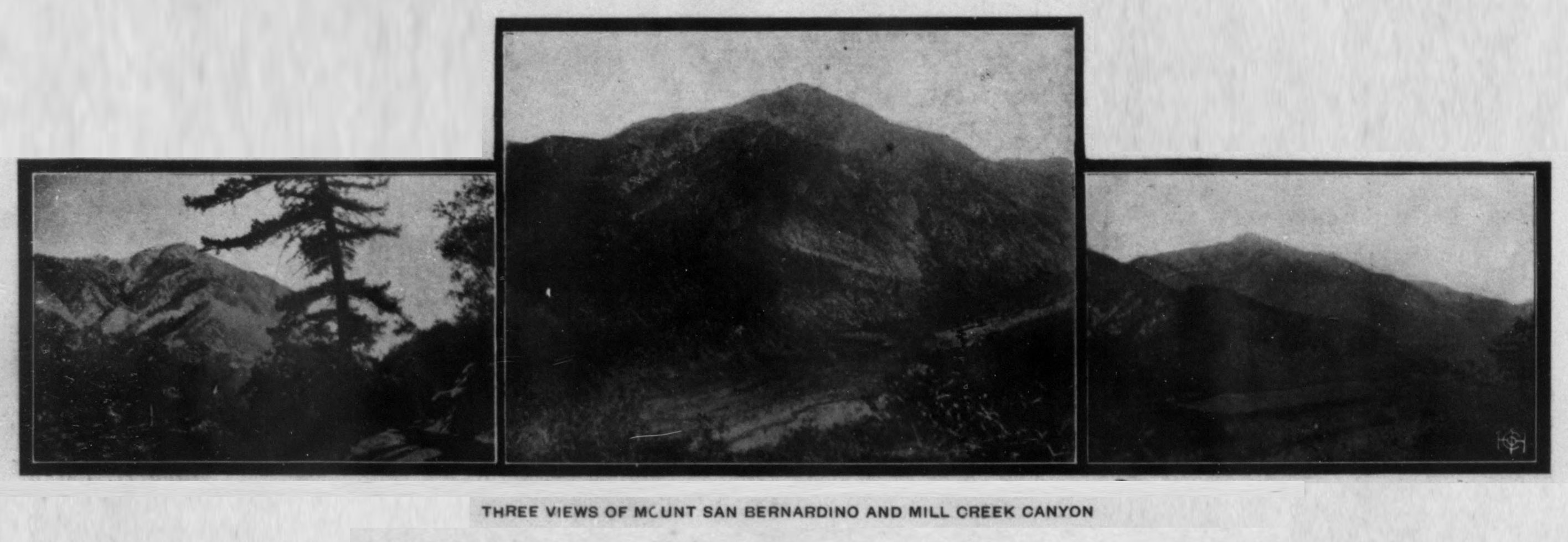 Topographically, Mill Creek Canyon differs radically from Santa Ana Canyon, for while the latter below the junction of the Santa Ana River and Bear Creek is virtually a barren ragged mountain gorge, through which the waters rush almost torrentially, Mill Creek is a stream of goodly size and of very even temperament in its flow. That it should be so becomes evident to any one who has driven up along its beautiful course, for here instead of bleak rock, rock, rock everywhere, as exists in Santa Ana Canyon, there are alders and cottonwoods and hazels and shrubbery galore, while ‘neath the foot ferns and mosses thrive luxuriously. It is a most beautiful canyon, wherein through the long summer months campers find a matchless Mecca. Its soil, deep and absorbent, stores up the winter rains and the melting snows of spring to give them back through the summer and autumn months, and thus it is that Mill Creek has been endowed by Nature with its perennial flow. To the north, the grizzled side of old Mount San Bernardino rears to its mighty eminence, and, like the southern sides of all mountains in the southern part of the State of California, it is covered only with rock that is bare except for the chapparel and greasewood that grows here and there. But across the canyon on the northerly exposure all is different, for there vegetation is shielded from the blanching rays of the sun and it thrives in utmost glory, from the tenderest maiden hair and lichen to the sturdiest oak arid pine.