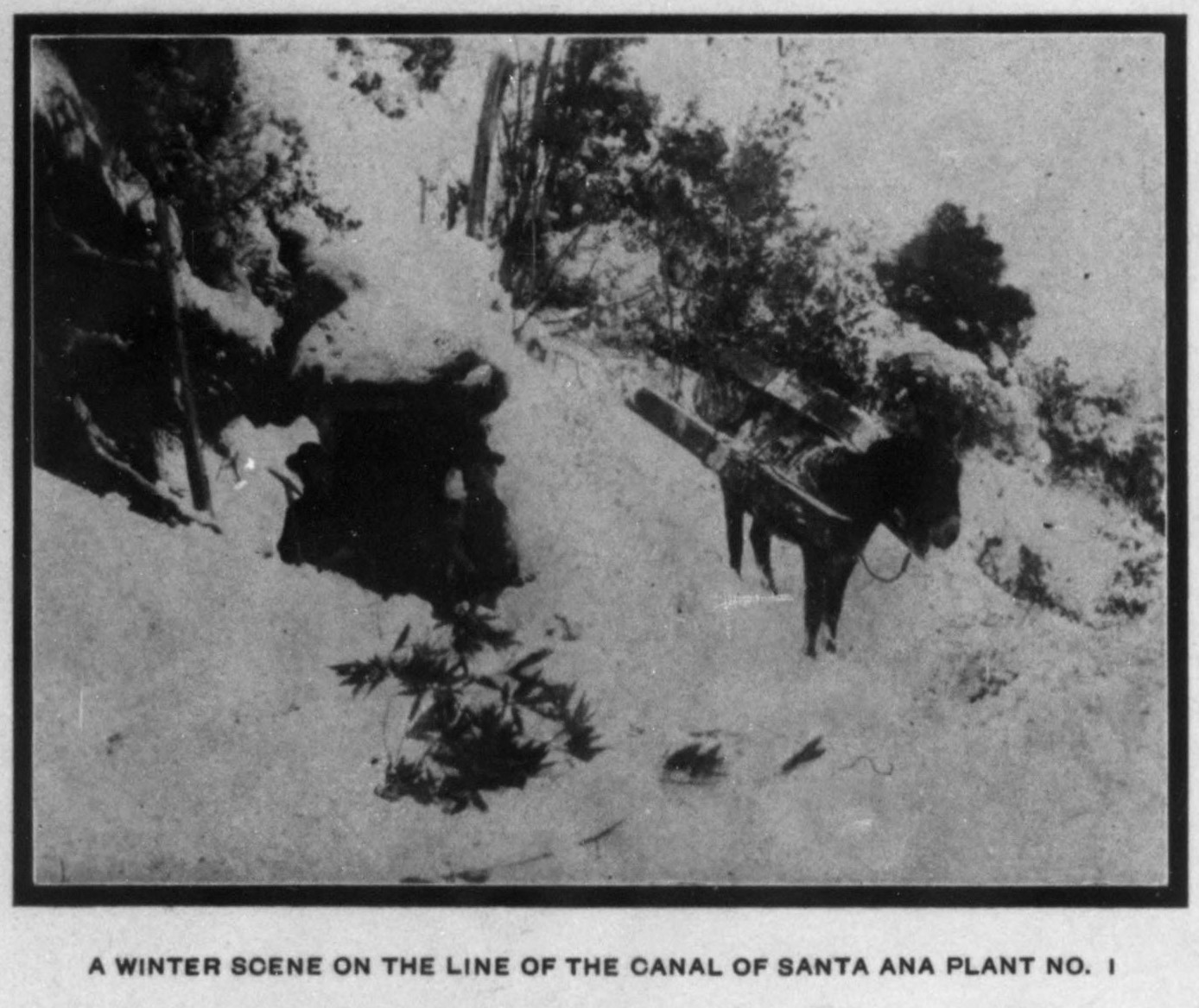 Less than three hours’ drive takes one — figuratively transports one — from the beauties of Redlands to the grandeurs of the Santa Ana Canyon. First, by bowered houses, then past orange groves that fill the air with Eden and on we drive across and up the great river bed of the Santa Ana into its rugged canyon. The altitude and the deep shadows in the canyon make driving chilly — it is winter anyway — but ‘a drink that will cheer’ is promised us soon, and when time has given a sufficient whet to our longings, we reach the stopping place where ‘hot drinks’ are served, fresh from a bubbling spring of boiling mineral water. Better toddy never was than this, so they say, and on we go past the powerhouse and up to the intake of the canal. A few rods above is the confluence of Bear Creek and Santa Ana River, then comes the diversion with its gates and sandbox and directly the stream is swallowed by the gaping portal of Tunnel No. 1. Then we returned to the road and went back down the canyon for a half mile or so, and a short climb up the base of the mountain brought us again to the canal at the sand box, between the mouths of Tunnels Nos. 3 and 4. Here our boat awaited us, and, nearby, smoking restful corncobs and wearing great gum boots that reached the hips, were the three men who had spent the previous four hours in pushing this self-same boat up against the waters that rush on their way to the powerhouse. And our party was to float down in that boat, like the rich in their chaises, while these men were to walk back, by gracious, but such is life!