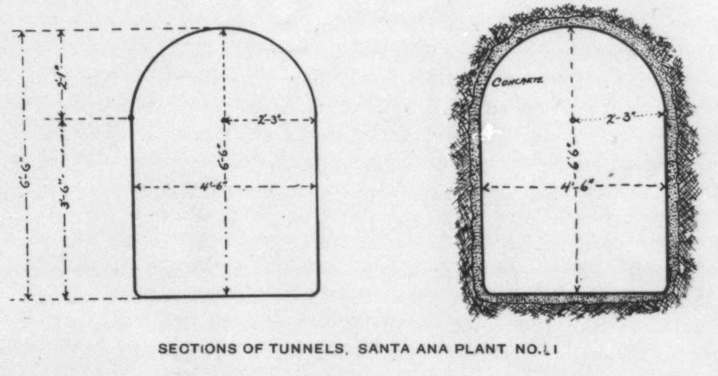 Concrete pipes, the same as laid in the trench, are laid through all the tunnels. Since the construction of the plant another tunnel, located between tunnels Nos. 3 and 4, has been added. This takes the place of flume No. 18, which was slightly damaged in a storm, thus deeming it advisable to drive a tunnel behind the canyon spanned by this fume. The length of this new tunnel is 173 feet.