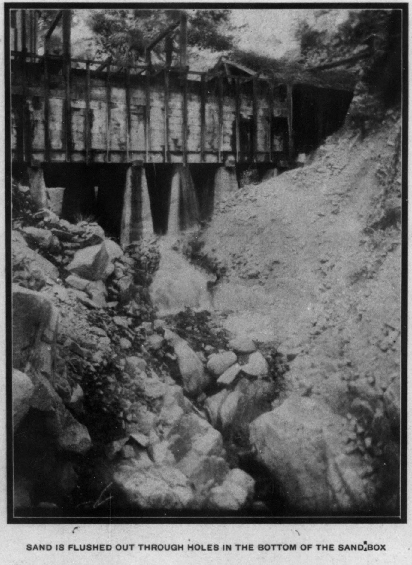 The conduit has been constantly in use since the latter part of the year 1898, and it has never been found necessary to turn the water out for the purpose of making repairs to the work. After the water is admitted at the head of the conduit it is passed through a sandbox or settling basin where the sediment is allowed to precipitate before the water is carried on to the power plant. This sandbox consists of two parallel hoppers with sluice gates in the bottom through which the accumulated silt can be expelled. The water is passed through one hopper while the other is being emptied, thus causing no interruption of the flow of water while the sand sluicing is in progress.