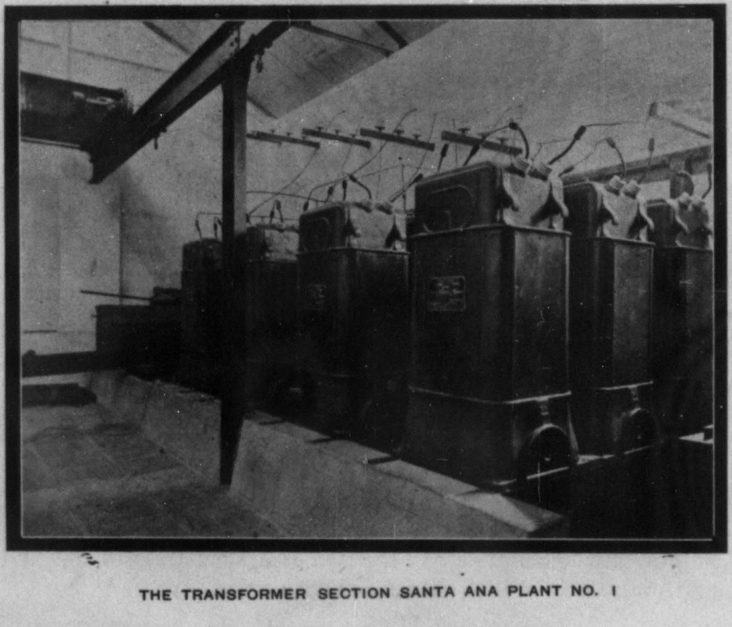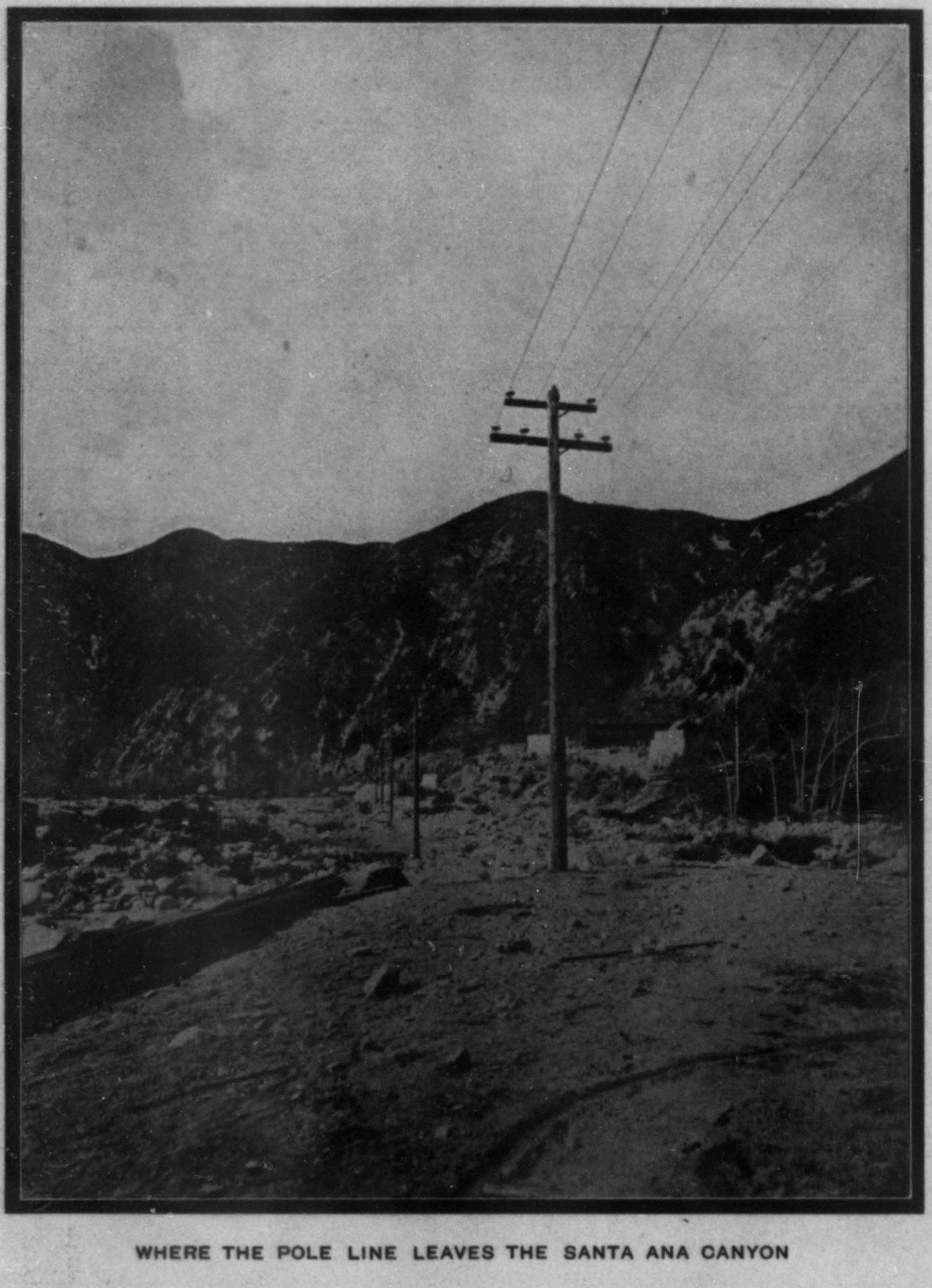From the powerhouse in Santa Ana Canyon, which is described elsewhere, the great artery of the system at 33,000 volts extends eighty-three miles to Los Angeles, the only 33,000-volt spur of which reaches out to Pasadena from Shorb, a distance of four miles. At Puente this pressure is reduced to 11,000 volts, at which pressure distribution is effected to substations there and in Whittier, Fullerton, Anaheim, Orange and Santa Ana.