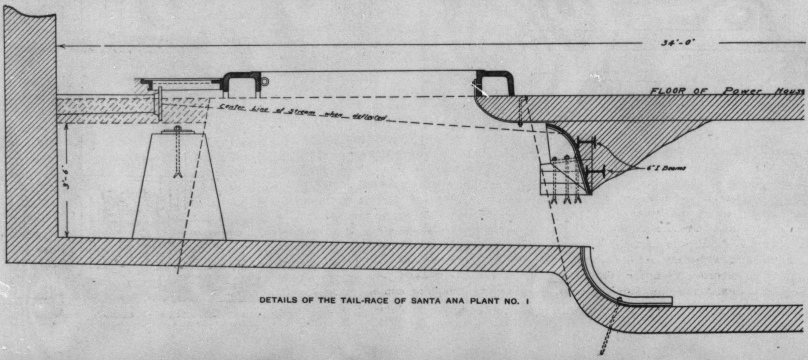 The water, after passing through the water wheels, or when deflected from there, passes out through a tunnel from each wheel pit, and below the powerhouse floor. In these tunnels, and immediately beyond the line of the generators, are placed upper and lower curved deflector plates. The stream, when either partly or wholly deflected, strikes the upper plate, which is anchored in the arch of the tail-race tunnel, and is turned down, striking the other plate in the tunnel floor. The curve of the lower plate is such as to again direct the water along the floor of the tail-race, in which manner it passes for a distance of thirty feet beyond the outside of the powerhouse, entering the main tail-race.