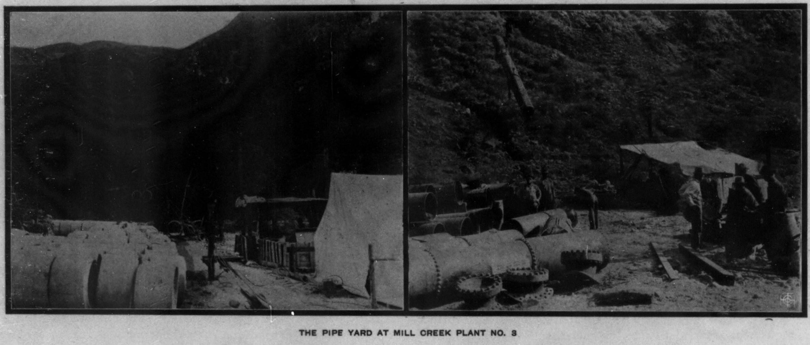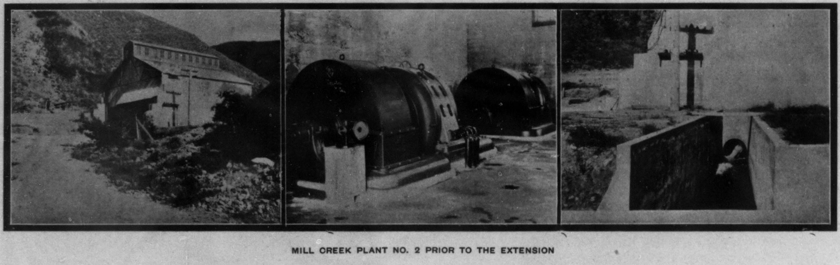 It was in 1898 that the load which had been thrust upon the original Redlands plant became so heavy as to make it imperative that further power should be developed, and fortunately the location of Mill Creek was such that all the water which ran through plant No. 1 was susceptible to prior use by diverting it further up the canyon and applying it at a new location, known as No. 2 plant, which could be situated so that the water from its tail-race would be immediately taken up by the intake of the pipe line of No. 1 plant. In line with this policy the construction of Mill Creek plant No. 2 was begun on the 24th day of October, 1898, and it was completed upon the 1st day of September, 1899, having been carried on continuously between those dates.