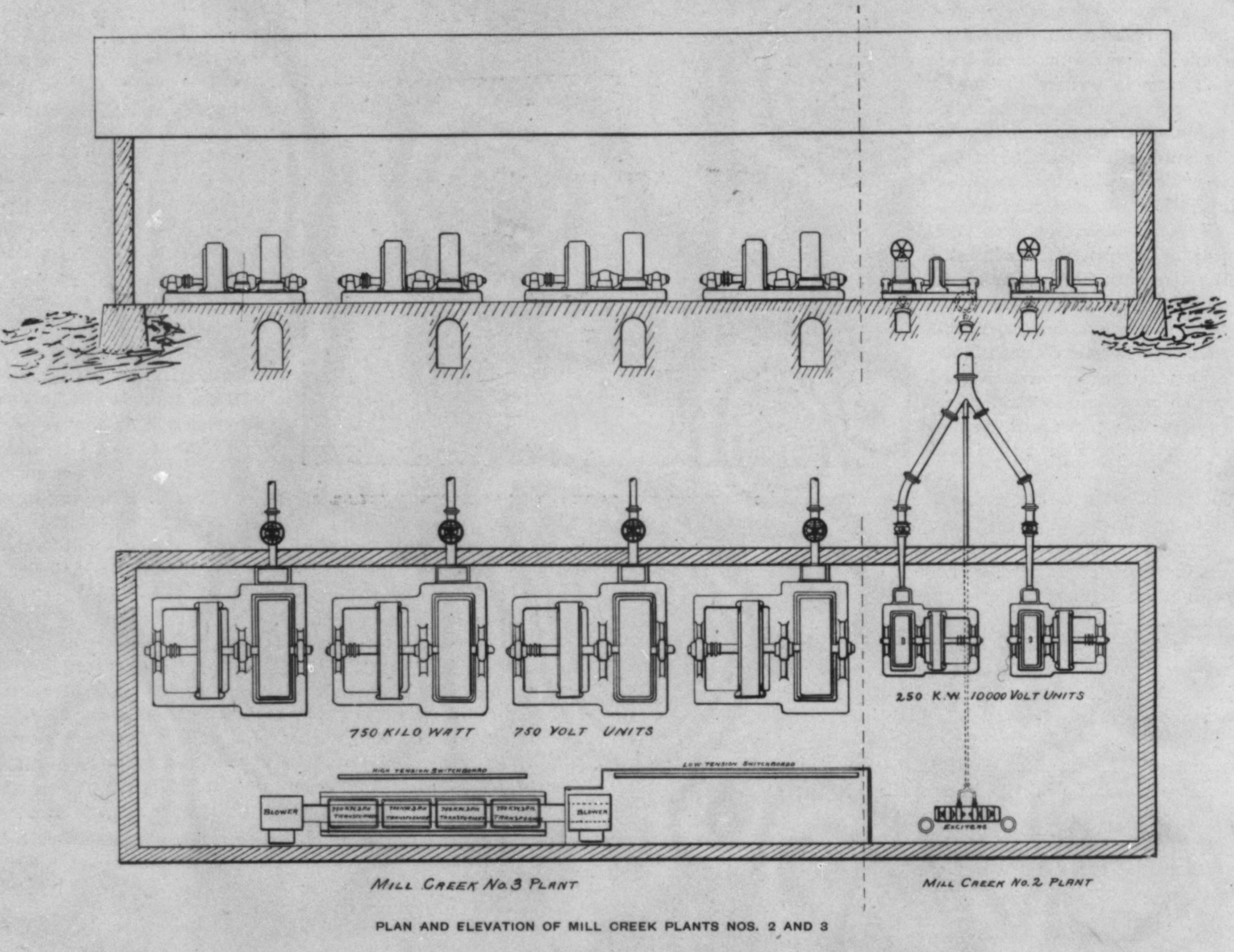 Three years later, in 1899, the further growth of the business of the company had necessitated the building of the second station, now known as Mill Creek No. 2 station, which is so located that the water from its tail race is taken up directly by the intake of the pipe line of Mill Creek No. 1 plant. This second plant contains two 250-kilowatt, revolving field, 11,500-volt, three-phase generators, running at 375 revolutions per minute. They were put in operation in November, 1899, and though they have been in constant operation ever since, they have always given perfect satisfaction and have never cost one cent for repairs. It is in an extension to the building of Mill Creek No. 2 station that Mill Creek No. 3 plant is now being rapidly finished, and when this latter plant is running it will be noteworthy as being driven under a higher head of water than any other electric transmission in the world, namely, 1,960 feet.