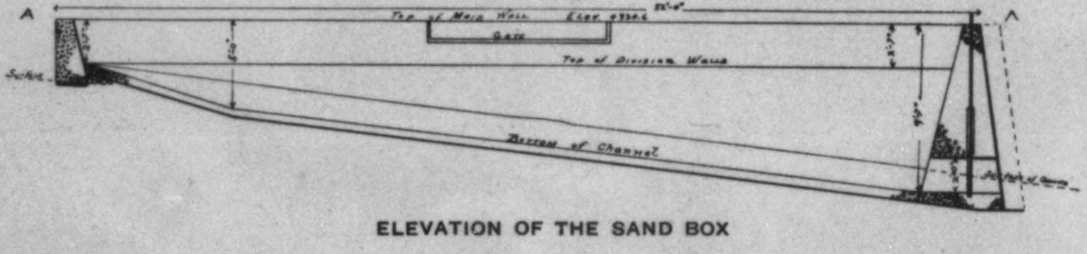 After passing through the intake tunnel and flume No. 1 the water enters the sand box or settling basin of concrete. This is twenty-two feet wide by fifty feet long and is divided into five compartments by means of concrete cross walls. The depth of the sand box is five feet along the upper side and nine feet along the lower. In addition to having a slope of four feet in twenty-two thus created, the bottom of each chamber is V-shaped, so that sand collected can easily be expelled by sluicing through the gate at the lower end of the chamber. A flume passing along the upper side makes it possible to deliver the water into any one of the five chambers, from which it can pass on from one compartment to the other through wide crested weirs, until it finally reaches the pipe line. The large cross section occupied by the water while passing through the sand box reduces its velocity so that silt carried in suspension will be deposited when it reaches the pipe line.