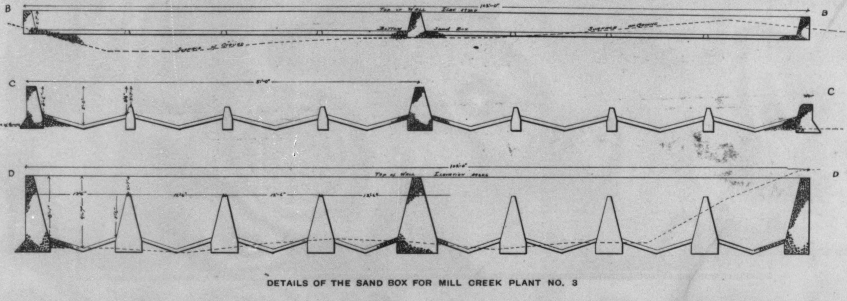 There is only one flume along the whole line of the gravity conduit, and this is for the purpose of conducting the water from tunnel No. 1 into the sand box. It is of two-inch clear surfaced redwood, four feet wide by three feet deep, and about 200 feet in length. The sand box is practically 100 feet long by fifty feet wide, and built according to the plan of sand box for plant No. 2, with the following exceptions: There are eight chambers twelve and one-half feet wide by fifty feet long; the slope in each of these towards the gate is four feet in fifty, and all of the dividing walls between the chambers is three feet below the water surface in the sand box, except the middle wall, which is higher than the water surface, and allows the water to pass through a gate instead of over the wall.