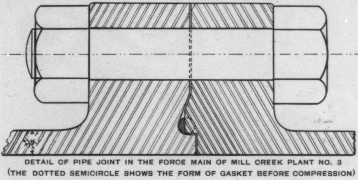 The joints on lap-welded pipes are made in two different ways. On the lighter pipes what is known as the ‘expanded’ or ‘bump’ joint is employed. One end of the pipe section is swelled sufficiently to permit the other to enter it. Holes are punched through both thicknesses of metal where the insertion of one pipe into another is made and the riveting is done by means of hot rivets in the same manner as shown for round seams for riveting pipes in the drawing herewith. The joint is also chipped and calked in the same manner as on riveted pipe. For the lighter gages of lap-welded, expanded-joint pipe one row of rivets is employed in making the joint, but for metal having a thickness of from five-eighths to three-fourths of an inch, two rows are used, and the rivets staggered in the same manner as when making straight seams on riveted pipe. The diameter of rivets used for these heavier pipes is seven-eighths of an inch. A portion of the lap-welded pipe is made with solid welded steel flanges. The joint employed in laying these pipes is also shown in the sketch which applies to the lap-welded pipe with shell three-fourths of an inch in thickness. The principle of this joint is that a groove runs entirely around the flange, as shown in the separate drawing, into which is squeezed a five-eighths-inch circular rubber gasket. This gasket is made in the form of a circle and not of the exact diameter of the groove in the flange. It is inserted into this groove and pressed into the space shown when the flanges are drawn together so as to have their faces come metal to metal. The principle of this joint is excellent, since the possible escape of water from the interior of the pipe, and the pressure against the rubber gasket which may be due to it, simply tend to press the gasket more firmly into the recess in the flange, thereby making an absolute guarantee against leaks. There is no chance for this gasket blowing out, since the flanges are drawn up by means of the bolts so as to have the two metal faces in perfect contact.