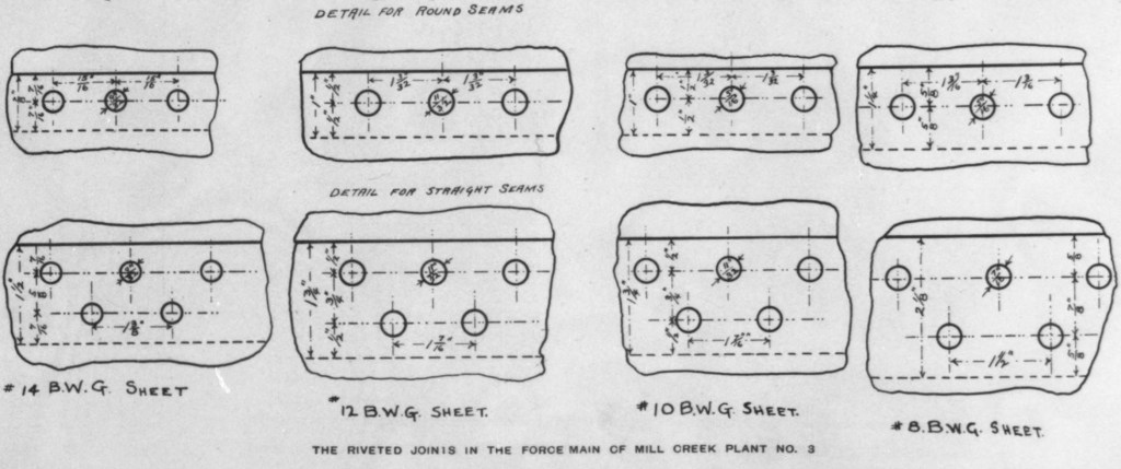 The joints used in laying the force main of the pipe line of Mill Creek plant No. 3 were made in the following manner: On riveted pipes all joints are made by means of a single row of rivets, such joints being in what is known as ’round seams.’ The details for this riveting are shown by the sketch on page 39. The description of the work is as follows. The holes are punched with a multiple punching machine in a manner to make them all meet fairly when the sections of pipe are pulled together. The joint is then riveted, cold rivets being used on all gages lighter than No. 8 B. W. G. and hot rivets for all heavier gages. After the seams are riveted the pipe is chipped and calked to make a perfect union, metal to metal, entirely around the circle of the joint. Where the lap in the joint occurs the metal of the overlapping sheet is also chipped and calked in the same manner. After this is done the inside and outside are painted with asphaltum to protect the pipe against the action of water and soils.
