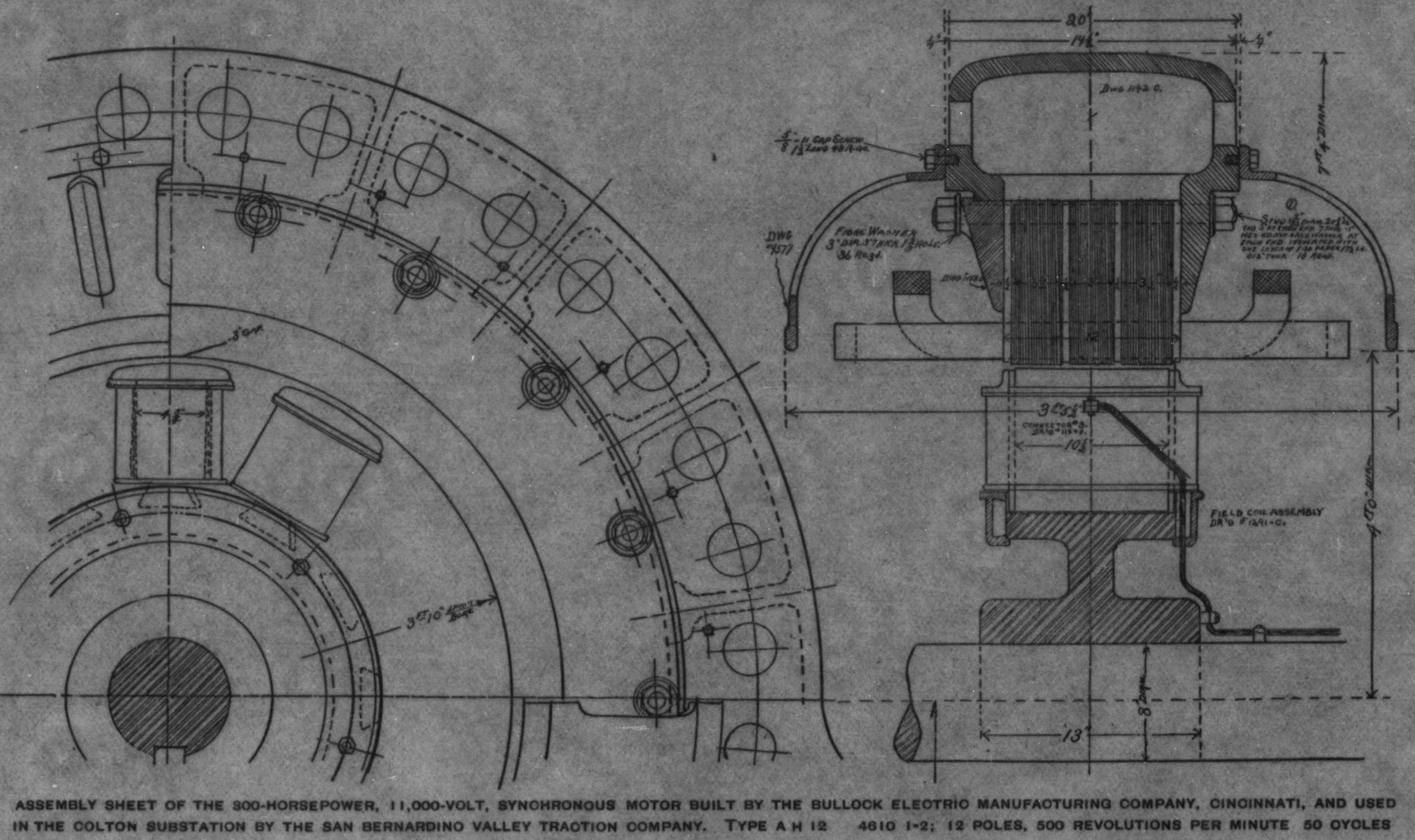 The San Bernardino Valley Traction Company, now operating lines from San Bernardino to Colton, is supplied with power from the 10,000-volt line through a 10,000-volt motor generator in its substation at San Bernardino. This machine is a single coil per pole per phase, with a revolving field, and rated at a capacity of 243 kilowatts. Some anxiety was felt lest it should pump on The Edison Company’s line, which is furnished with generators of a supposedly different wave form. No trouble of any kind, however, has been experienced. This synchronous motor generating set is started from the direct-current side by means of a small rotary converter furnished by a 10,000-volt transformer from the main line. The power so furnished is metered by a 10,000-volt primary meter of the familiar Thomson polyphase form. The view on page 55 shows the construction of the motor, which was manufactured by the Bullock Electric Manufacturing Company, and which is so built that the revolving field pieces may be slid to one side. The company intends shortly to extend its line to Highland and thence to Redlands, this machine being large enough to supply all such service. This is the largest motor which the company has on its line.