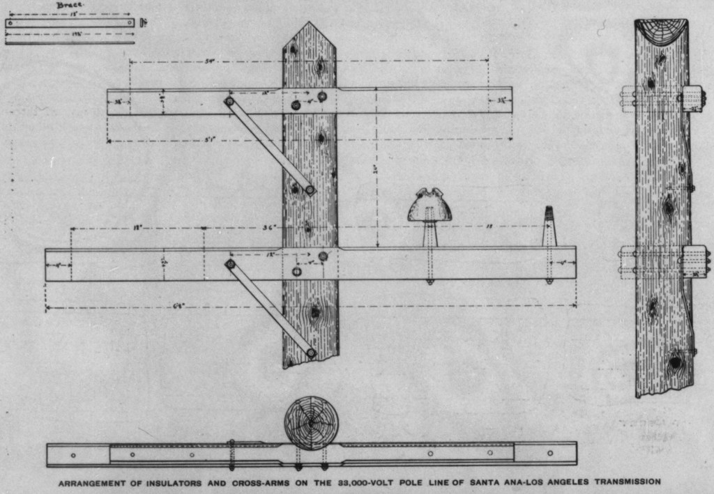 The 33,000-volt lines are composed of two three-phase circuits of three No. 1 B. and S. gage medium hard-drawn copper wires, strung upon thirty-five-foot round cedar poles, and, except in cities and a few other instances, they are spaced forty-four to the mile and supported on two-pin and four-pin cross-arms, with bolt-centered oak pins. The insulators are white glazed porcelain six-inch, triple petticoat, manufactured at Trenton, N. J., by C. S. Knowles, especially for this line. In addition the pins have a porcelain base butting into the cross-arms.