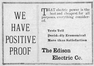 In December, 1897 the West Side Lighting Company sold out to the Los Angeles Edison Electric Company, which had incorporated on July 9, 1894, with a capital of $500,000, it being necessary to assume that name in order to obtain the Edison licenses. The name was then changed to Edison Electric Company which retained the old board of directors of the West Side Lighting Company, but others were taken on subsequently. It was about that time that Mr. John B. Miller, now president of The Edison Electric Company, entered the board, and was elected treasurer of the company, whereupon he at once became an important factor in financing the company to its present imposing position. Early in 1898, another Stirling boiler was added to the steam equipment, as were also a 500-horsepower condenser and a 500-horsepower Day open heater. A 300-horsepower Ideal engine was purchased and utilized in driving a Westinghouse three-phase, 240-kilowatt, generator that had been supplied by the Southern California Power Company, with which The Edison Electric Company had contracted for power.