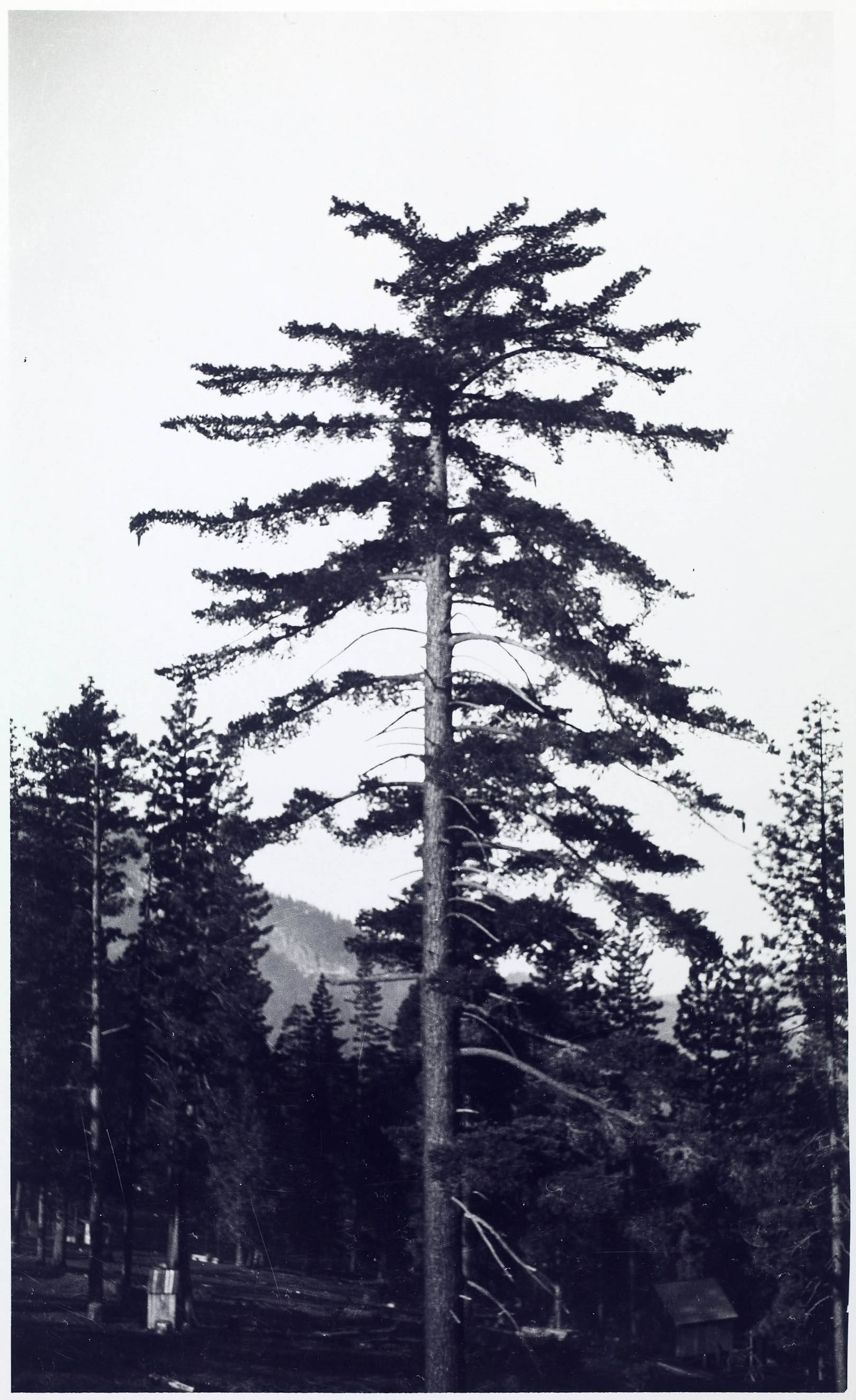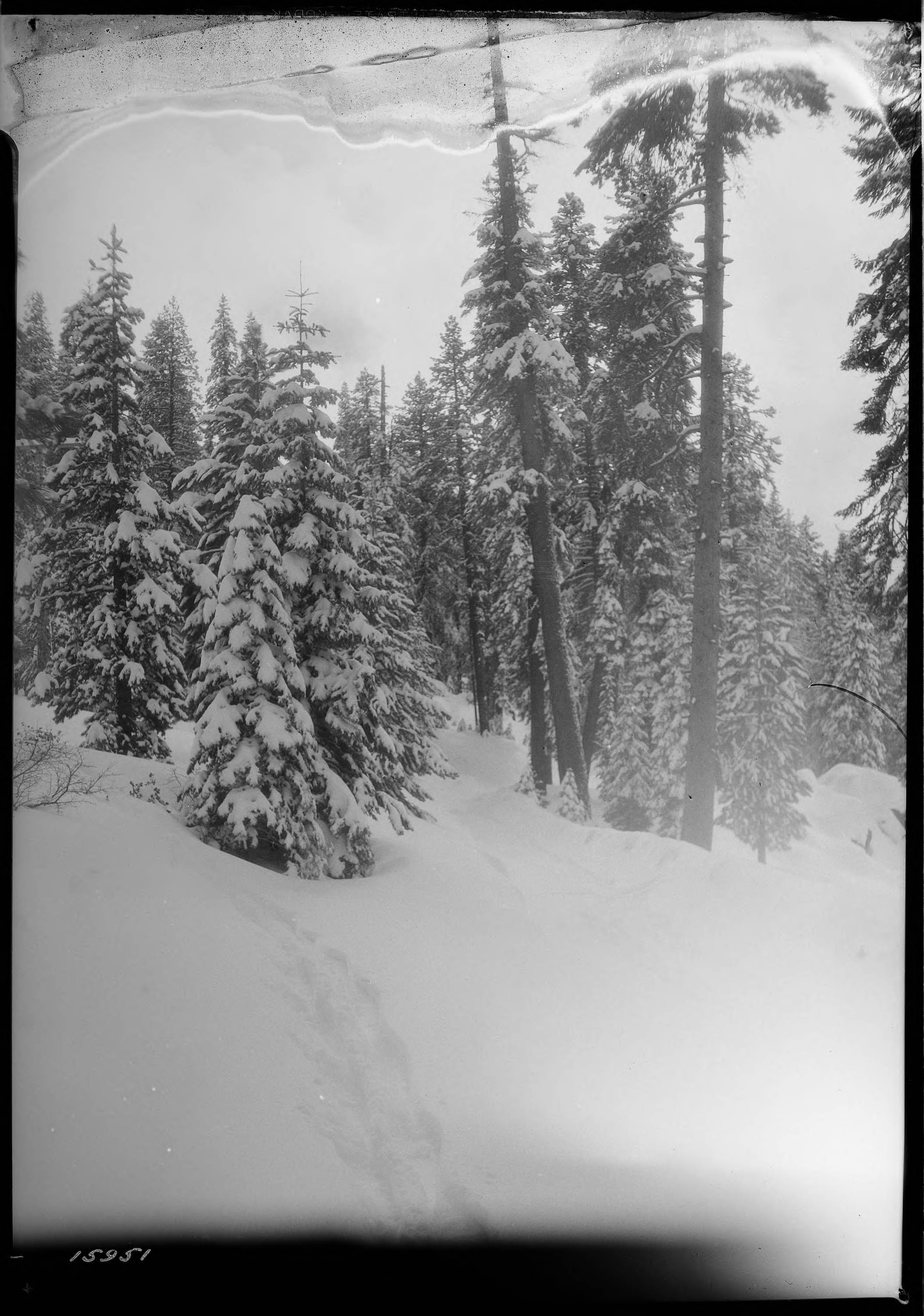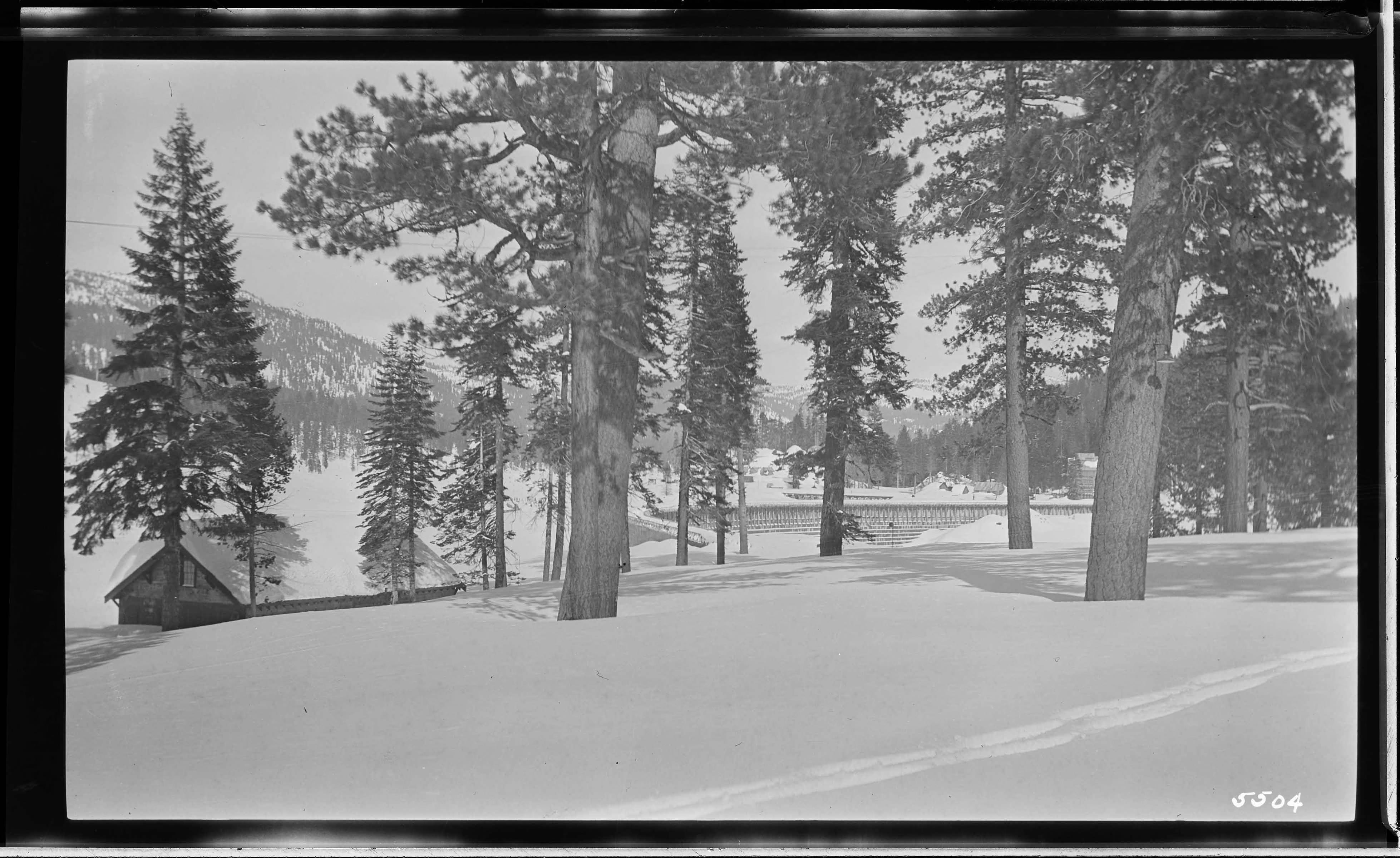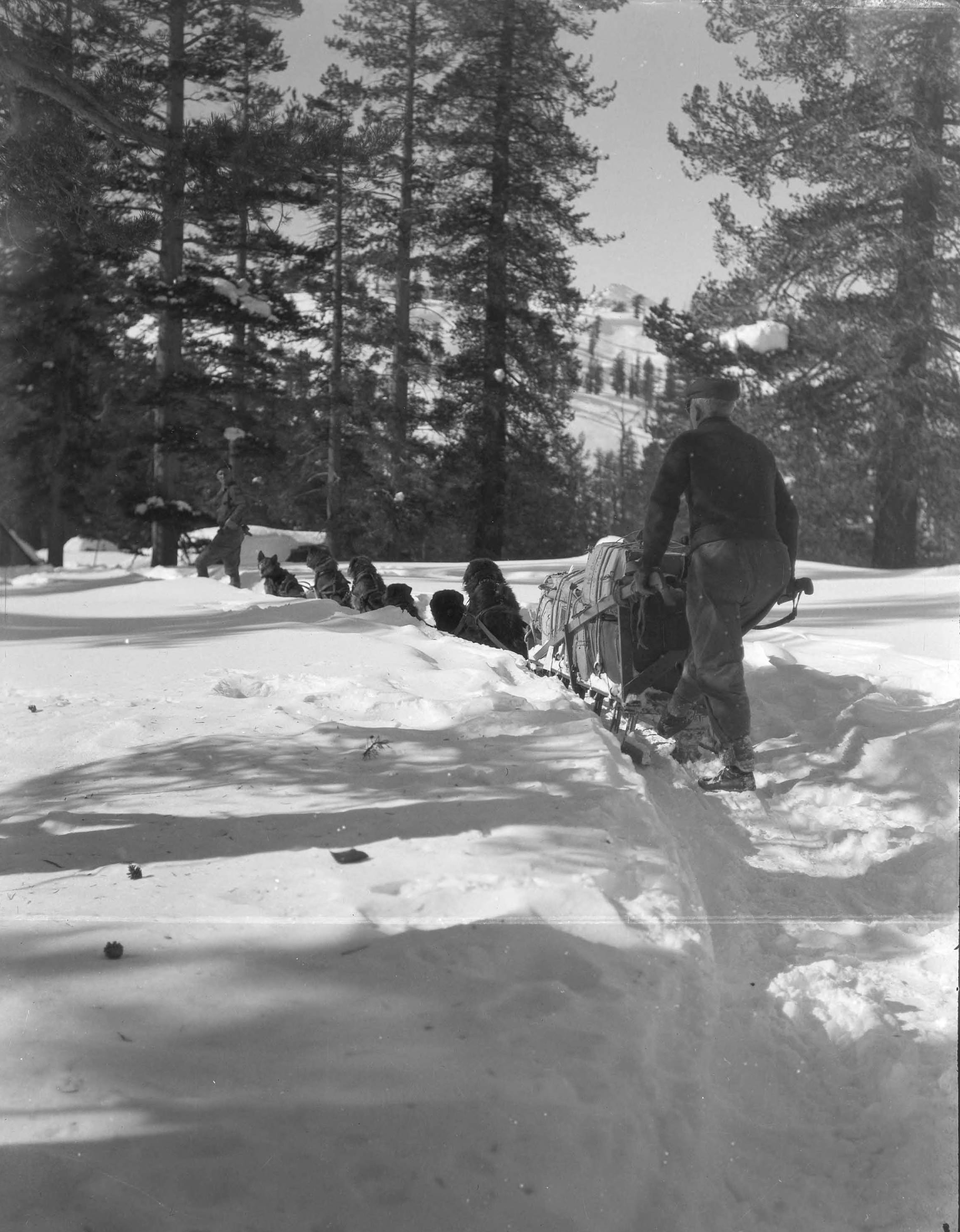 The dog team had not been working long before it was called into action on an errand of mercy, but too late. An employee located at Camp 61, six miles beyond Kaiser Pass, was determined to get home to spend Christmas with his family in the San Joaquin Valley. Against the advice of his superiors and contemporaries, he reached Camp 61-C on Kaiser Pass, where quarters were available for anyone who might need shelter during storms. After a short stop-over, he insisted on going ahead. It was six and one-half miles to Camp 60, at the upper end of Huntington Lake, and the snow at the Pass was more than waist deep. Three men volunteered to accompany him, not wanting to see him go on alone. The party had not gone far when his exhaustion made it necessary for the others to place their companion at the foot of a large juniper tree — the snow is always light around the bases of large trees — and return to camp for Jerry and his dogs. When the rescue party finally reached the juniper tree, the man was dead.