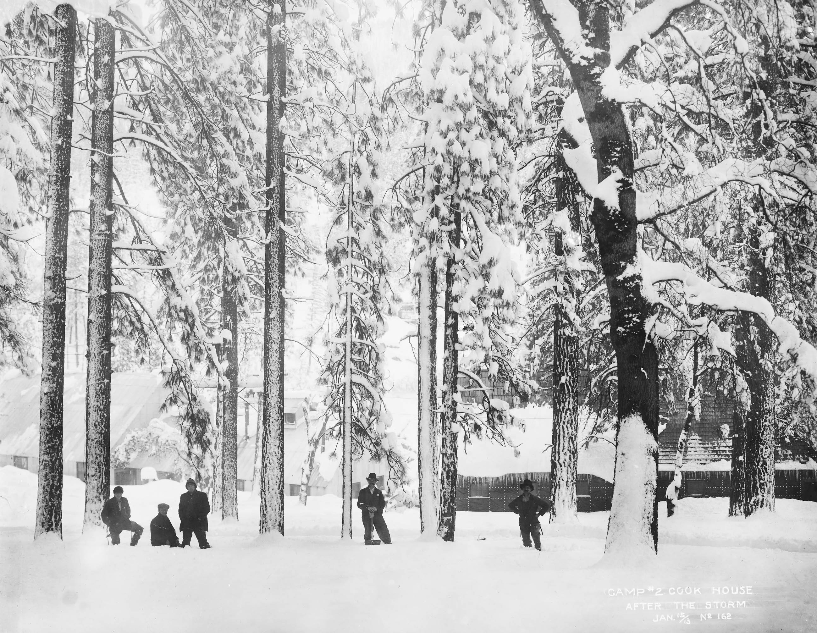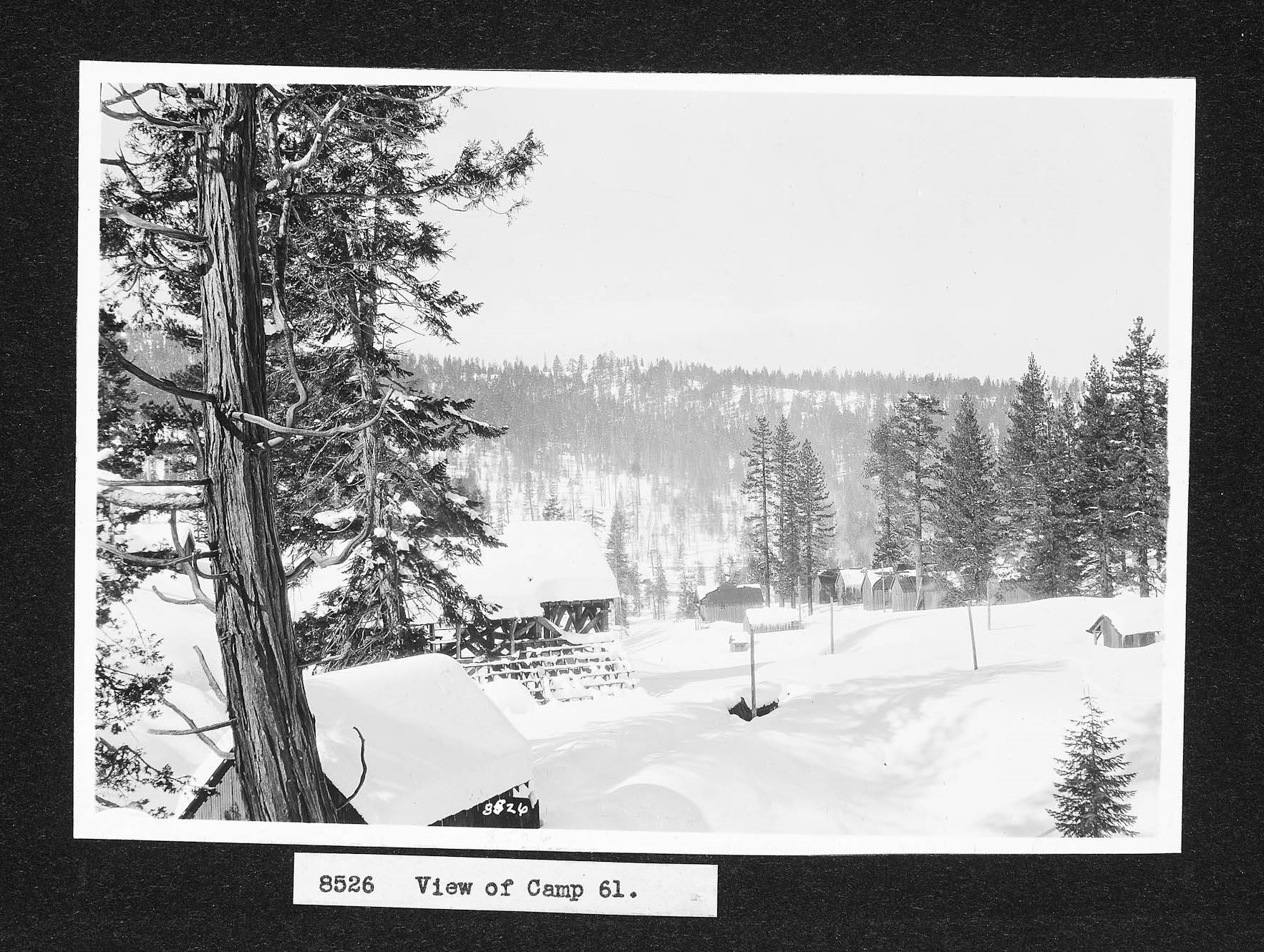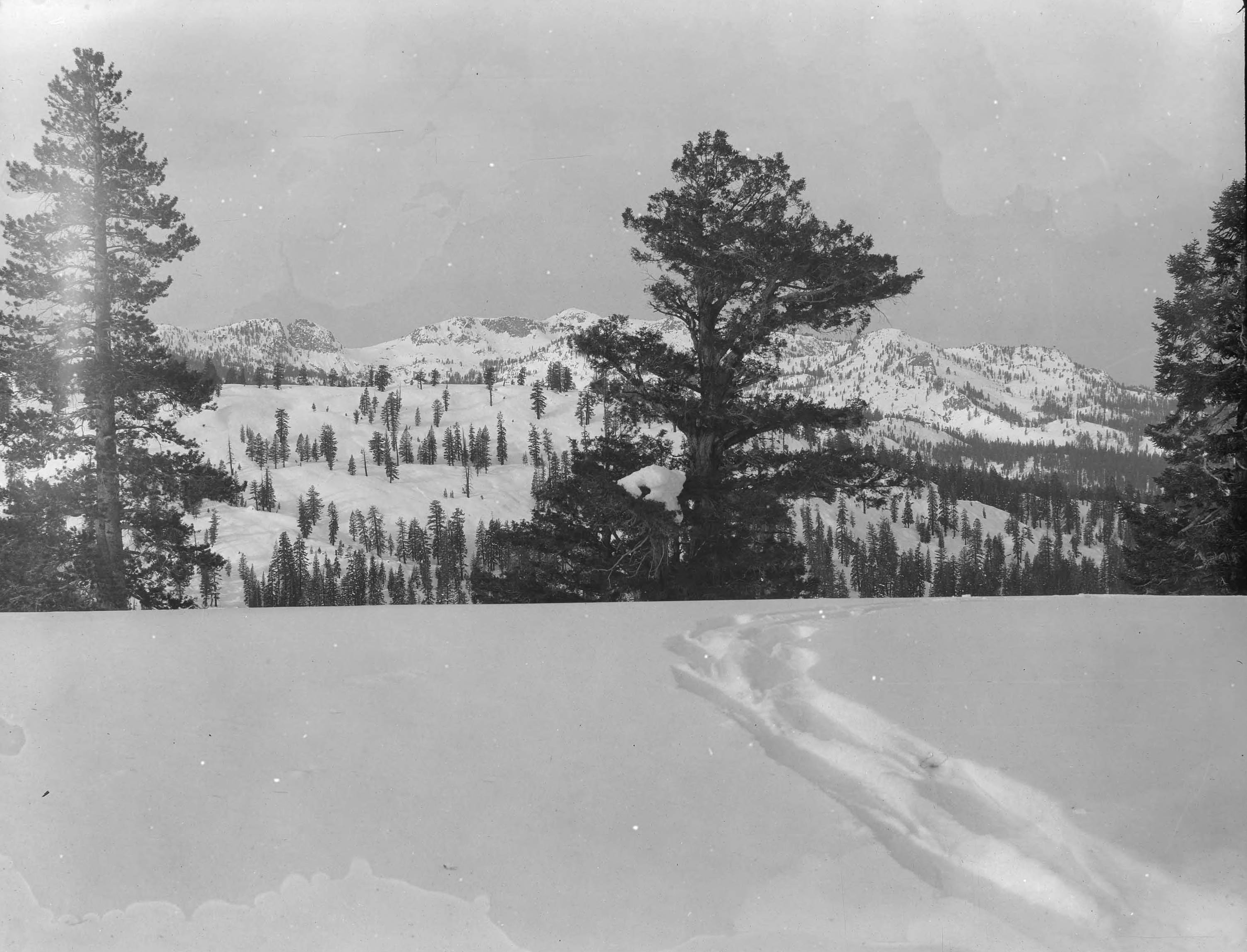 The dog team had not been working long before it was called into action on an errand of mercy, but too late. An employee located at Camp 61, six miles beyond Kaiser Pass, was determined to get home to spend Christmas with his family in the San Joaquin Valley. Against the advice of his superiors and contemporaries, he reached Camp 61-C on Kaiser Pass, where quarters were available for anyone who might need shelter during storms. After a short stop-over, he insisted on going ahead. It was six and one-half miles to Camp 60, at the upper end of Huntington Lake, and the snow at the Pass was more than waist deep. Three men volunteered to accompany him, not wanting to see him go on alone. The party had not gone far when his exhaustion made it necessary for the others to place their companion at the foot of a large juniper tree — the snow is always light around the bases of large trees — and return to camp for Jerry and his dogs. When the rescue party finally reached the juniper tree, the man was dead.