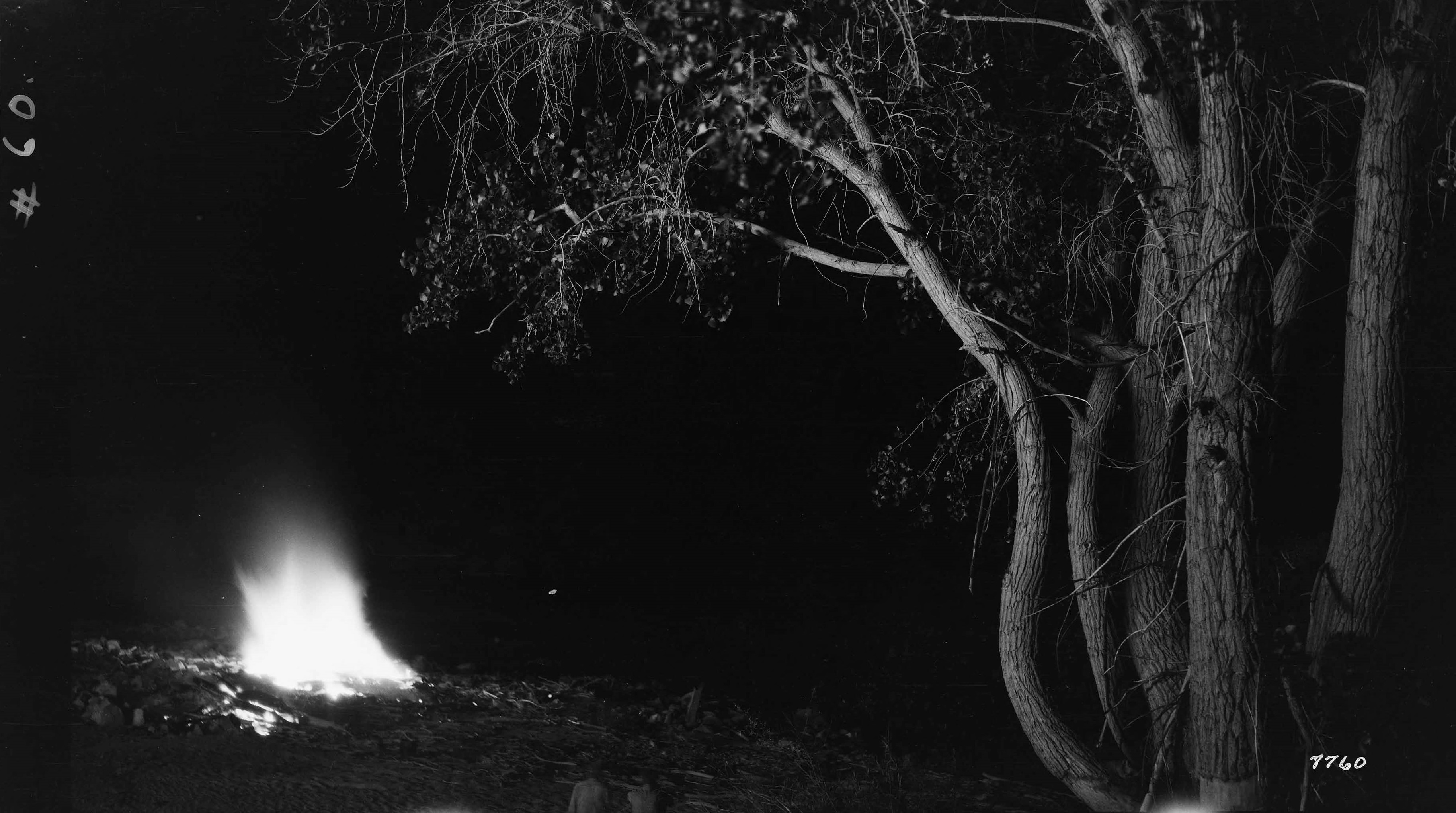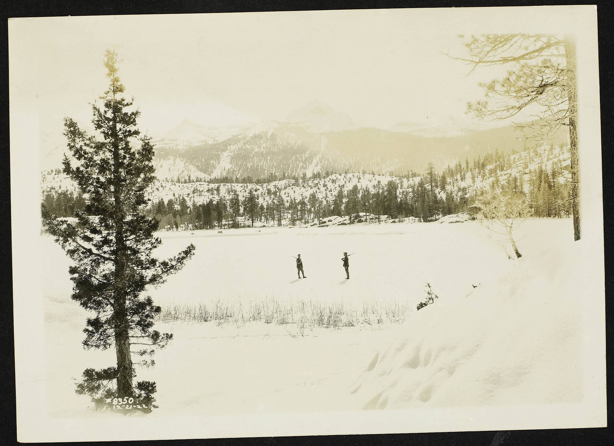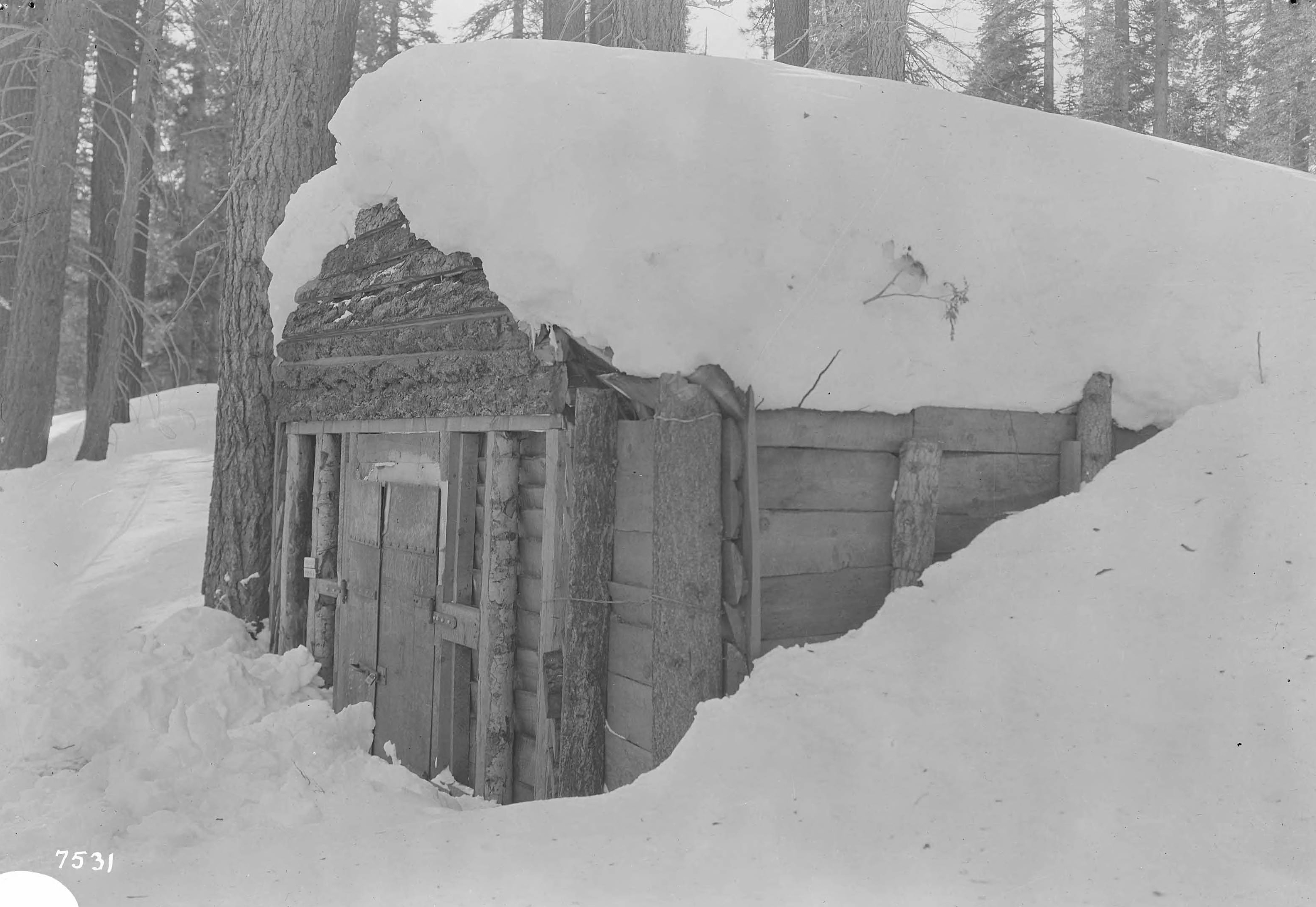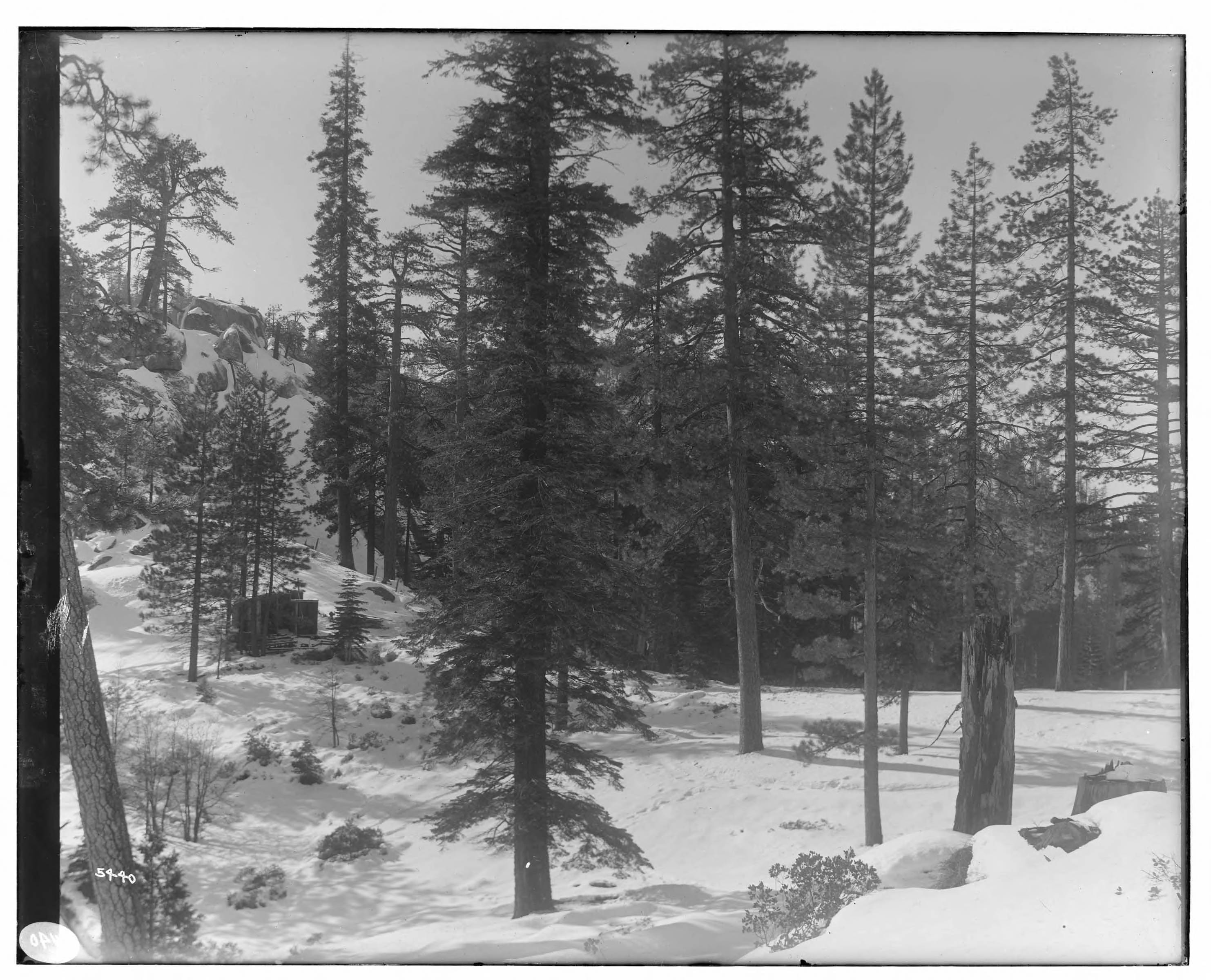The dog team had not been working long before it was called into action on an errand of mercy, but too late. An employee located at Camp 61, six miles beyond Kaiser Pass, was determined to get home to spend Christmas with his family in the San Joaquin Valley. Against the advice of his superiors and contemporaries, he reached Camp 61-C on Kaiser Pass, where quarters were available for anyone who might need shelter during storms. After a short stop-over, he insisted on going ahead. It was six and one-half miles to Camp 60, at the upper end of Huntington Lake, and the snow at the Pass was more than waist deep. Three men volunteered to accompany him, not wanting to see him go on alone. The party had not gone far when his exhaustion made it necessary for the others to place their companion at the foot of a large juniper tree — the snow is always light around the bases of large trees — and return to camp for Jerry and his dogs. When the rescue party finally reached the juniper tree, the man was dead.
