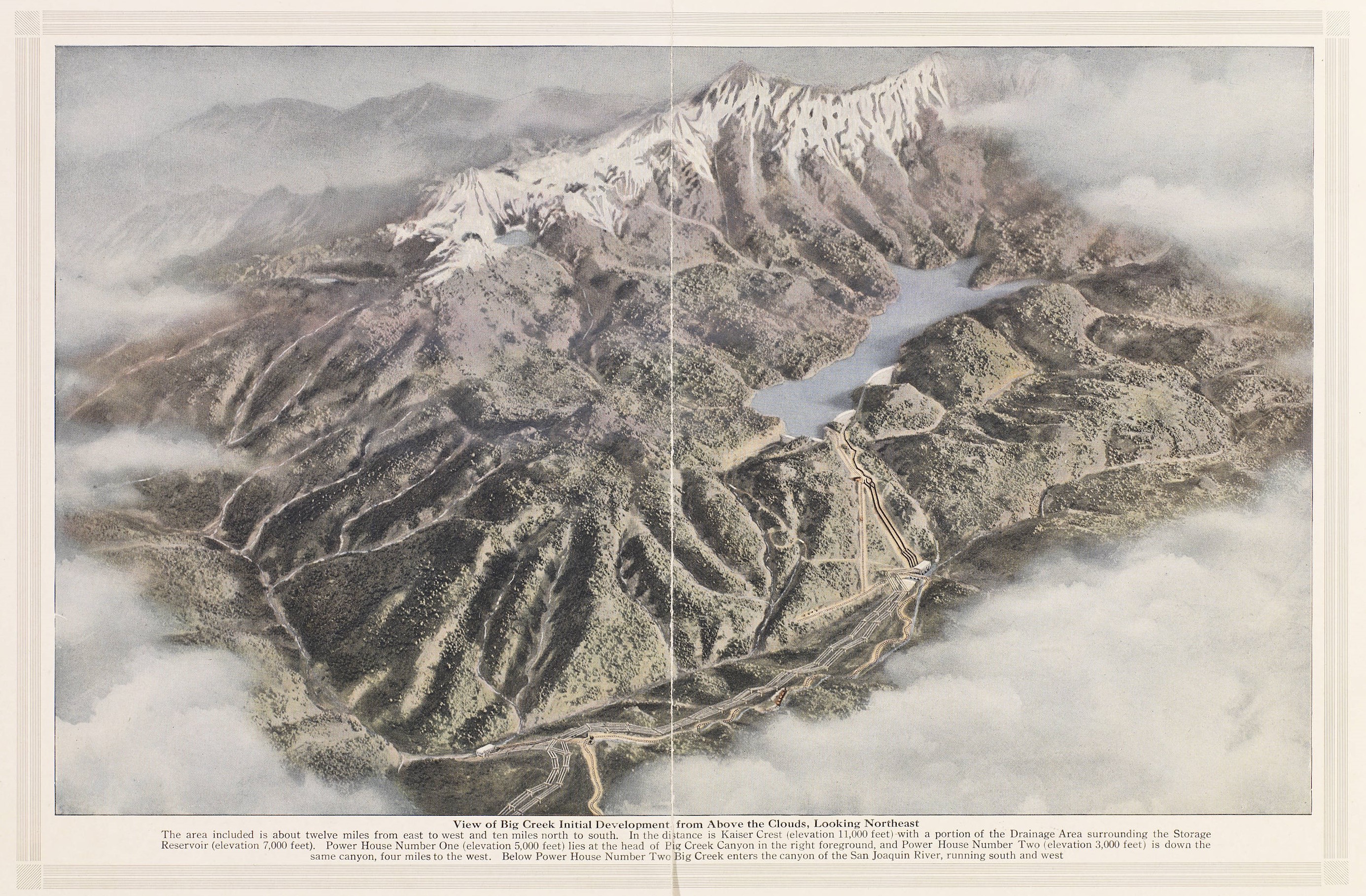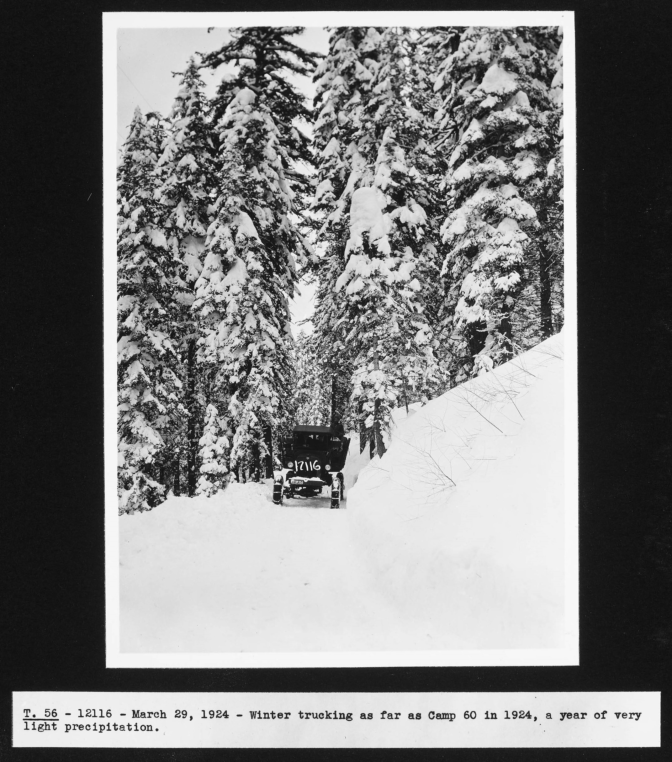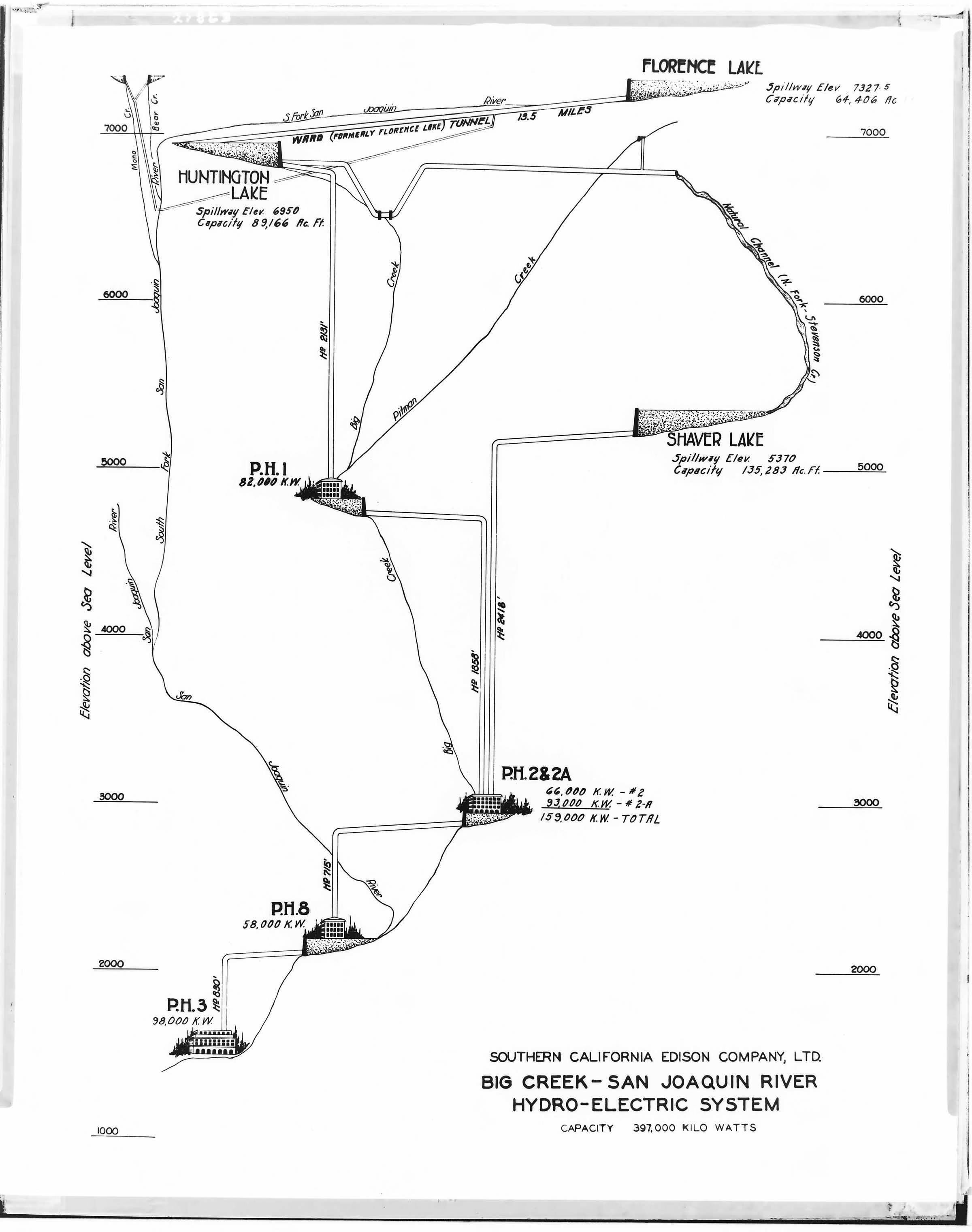 “The winter snows of the Sierras were the entire reason for the Big Creek Project. As the heavy snowpack melted, the runoff water was stored in reservoirs, then used to generate electricity before going down to irrigate crops in the San Joaquin Valley below. Unfortunately, the heavy snowfalls at higher altitudes made construction of portions of the project very difficult, shortening the working season and making transportation difficult.”