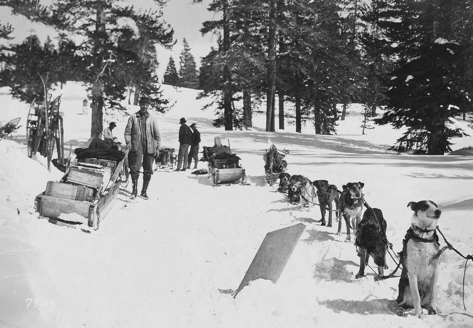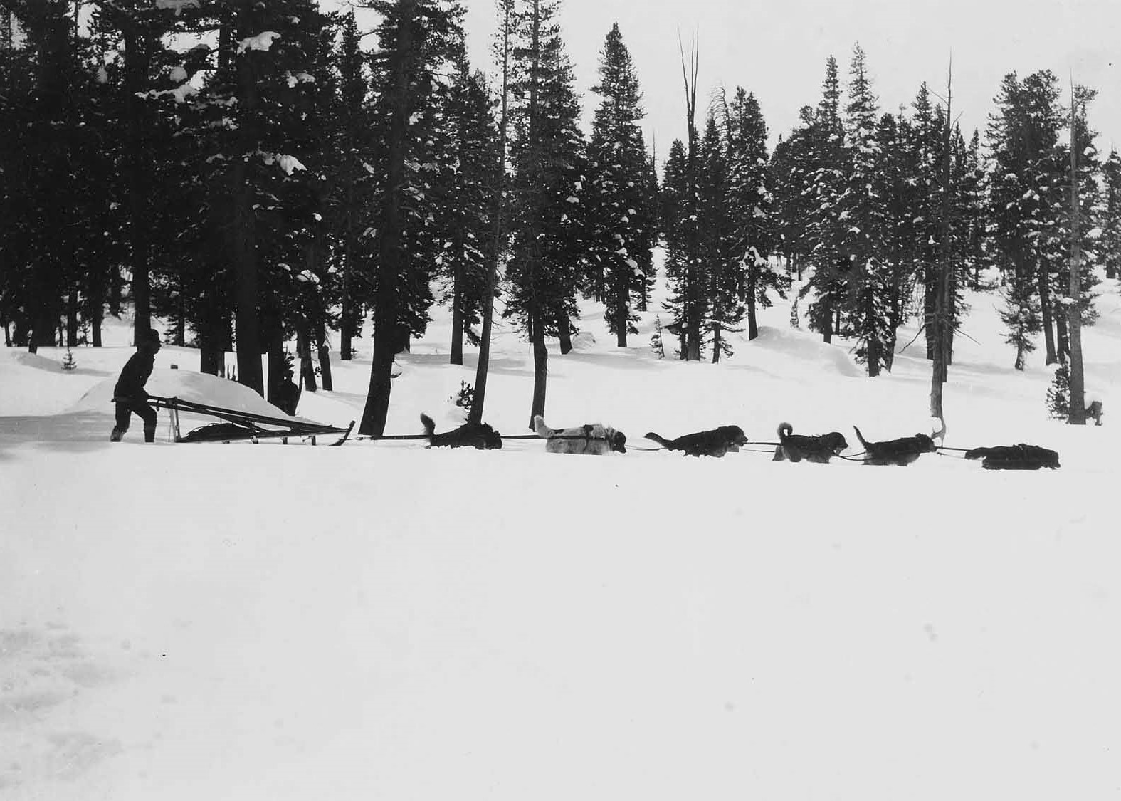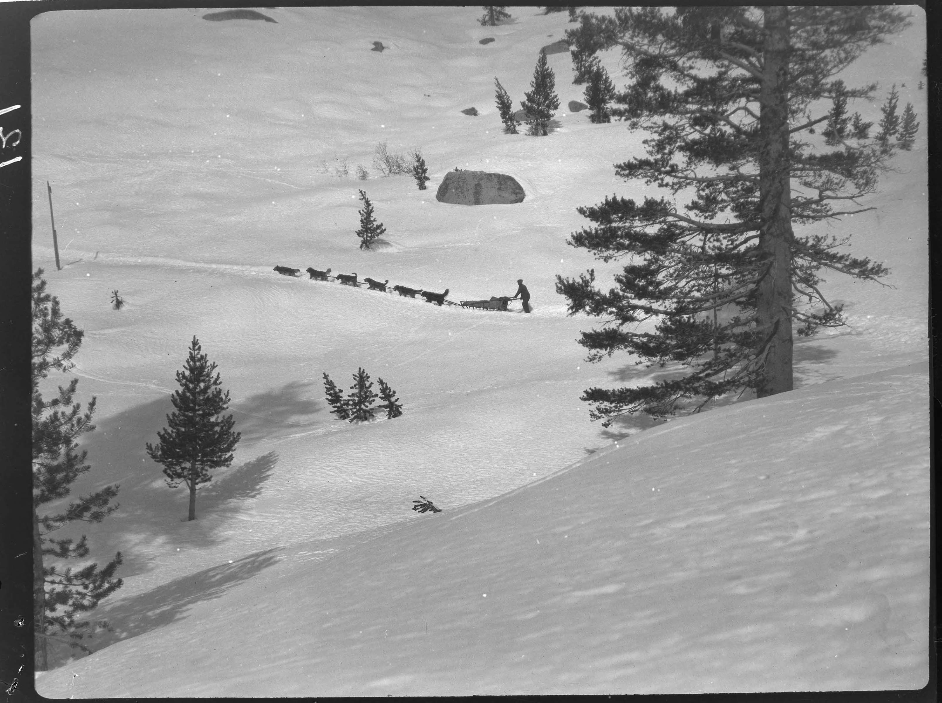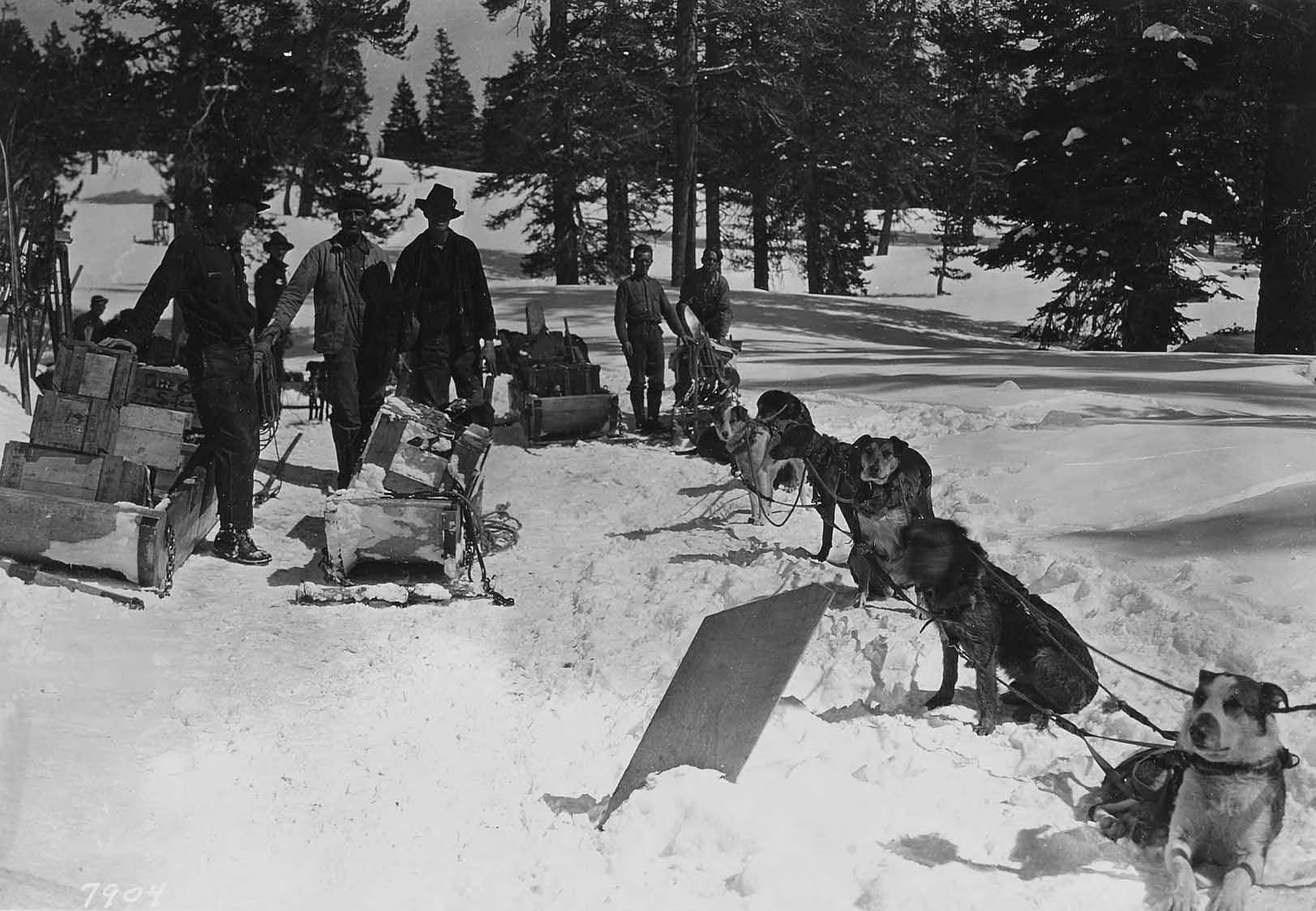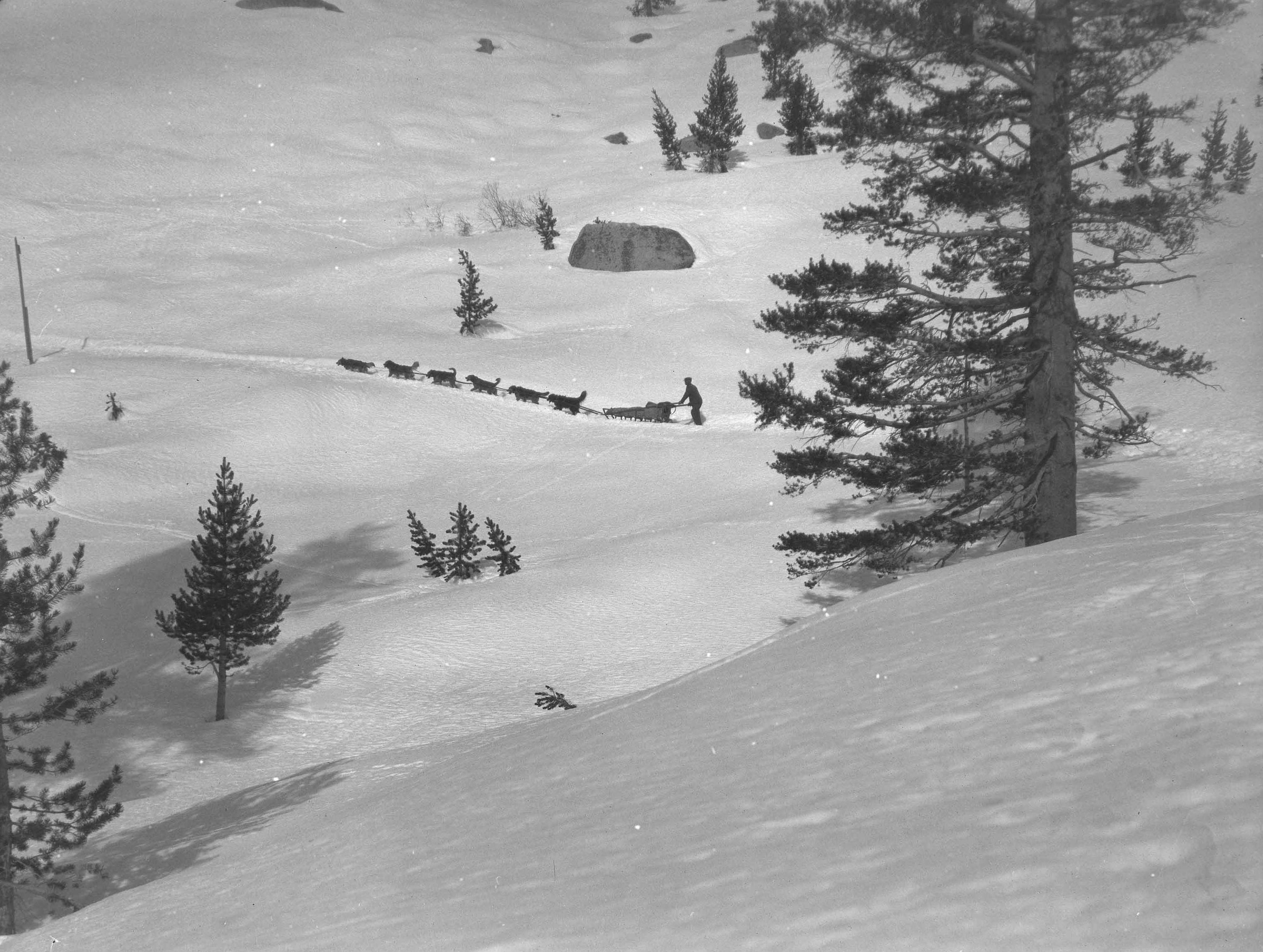 “We were faced with the problem, during winter months, of getting mail and light supplies of various kinds, particularly medicine, over Kaiser Pass with the road impassable on account of deep snow. Equipment for snow removal such as we have today had not been perfected. The decision was made to secure a dog team, the question being how to get one which was trained, with a driver, in time to be of use during the winter which was then upon us. With the assistance of Ingersoll-Rand Company, we obtained a team of seven dogs and a driver from Alaska.