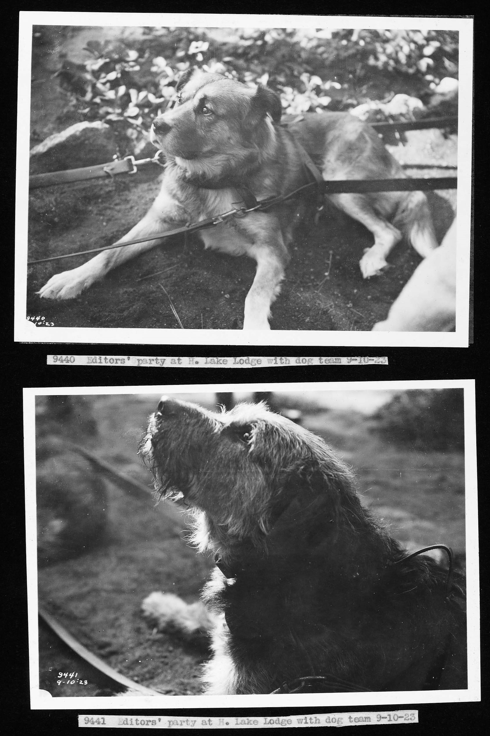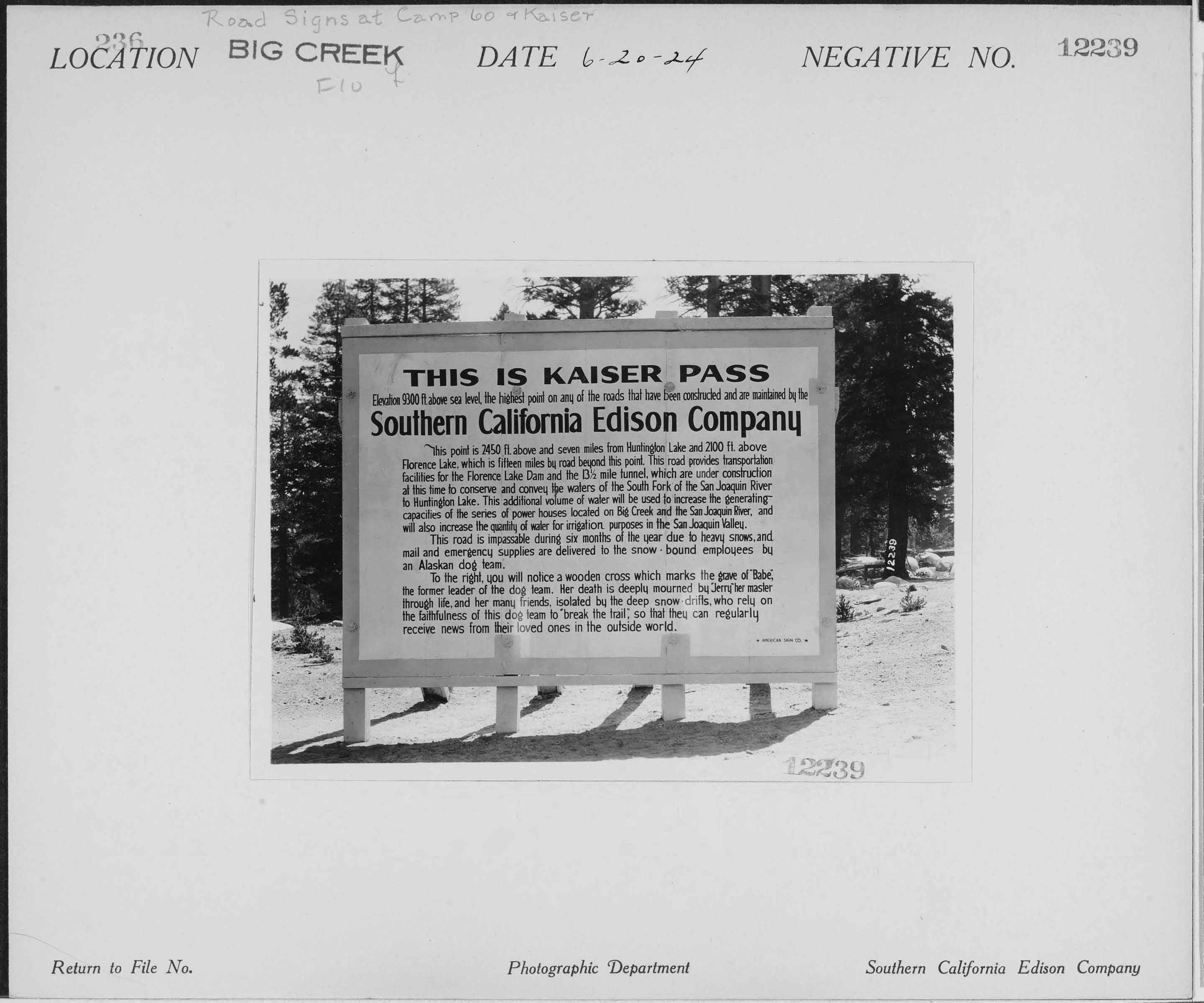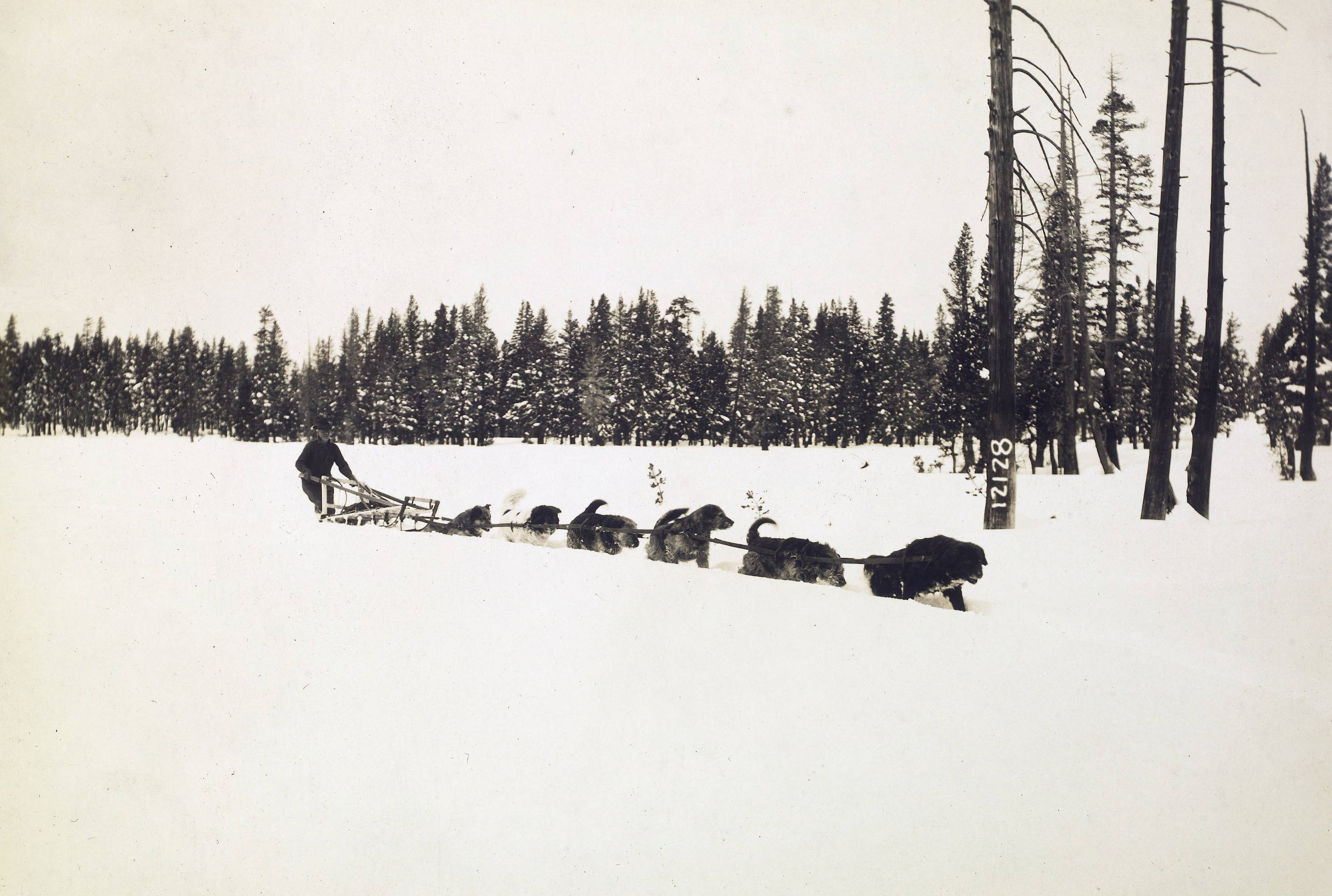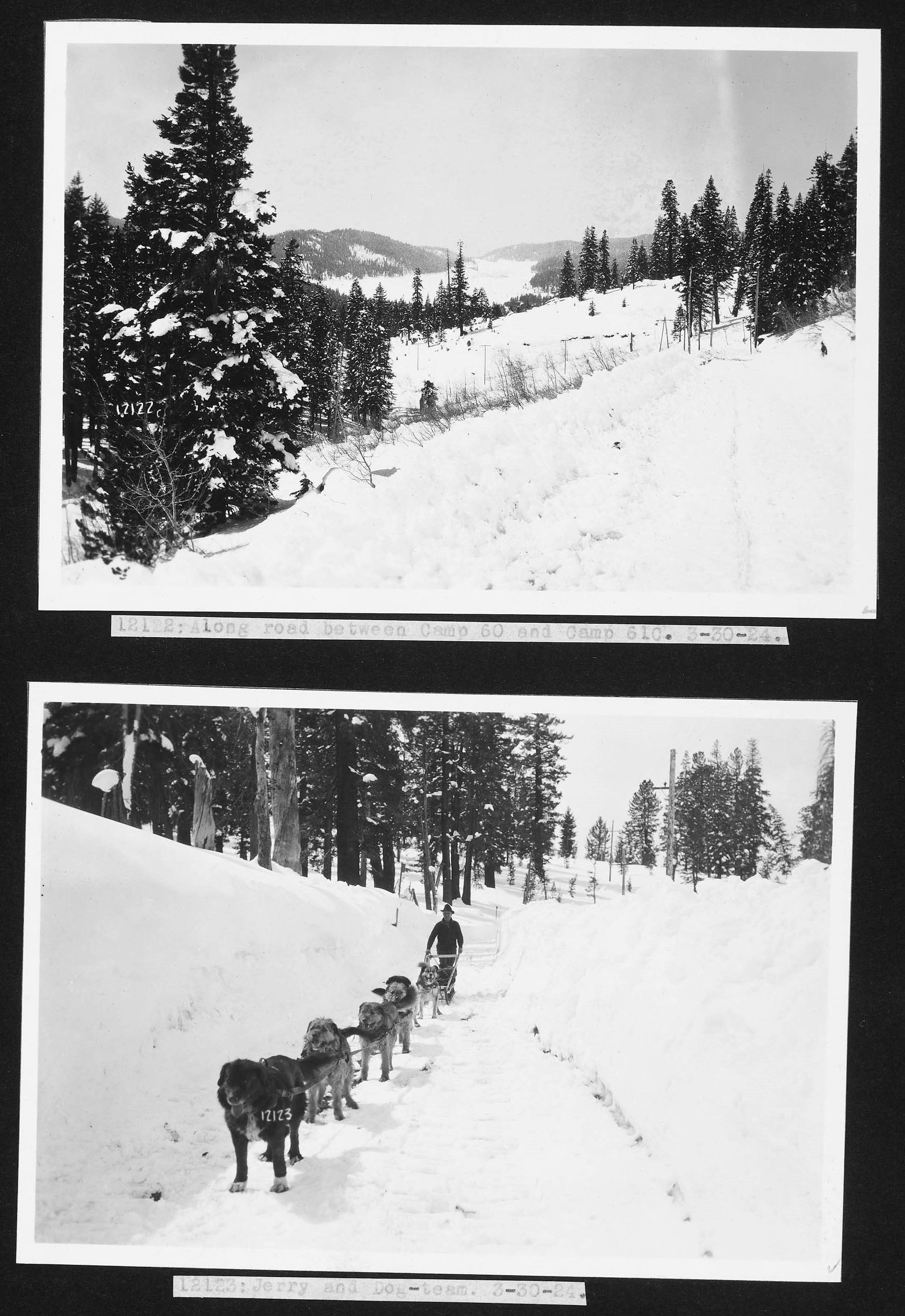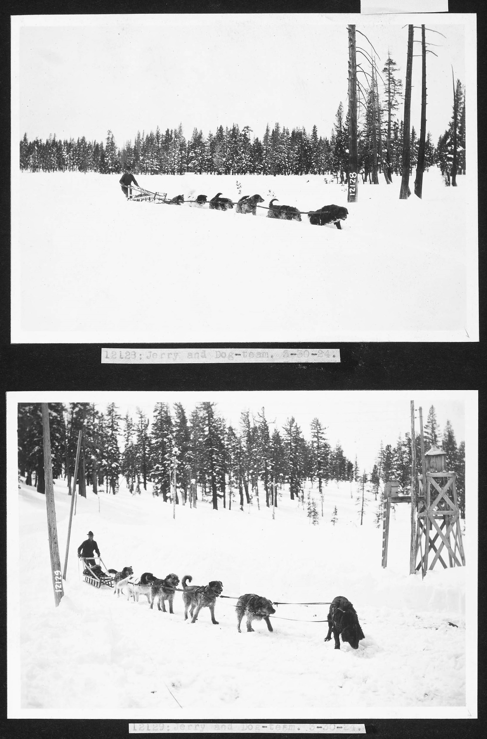 “We were faced with the problem, during winter months, of getting mail and light supplies of various kinds, particularly medicine, over Kaiser Pass with the road impassable on account of deep snow. Equipment for snow removal such as we have today had not been perfected. The decision was made to secure a dog team, the question being how to get one which was trained, with a driver, in time to be of use during the winter which was then upon us. With the assistance of Ingersoll-Rand Company, we obtained a team of seven dogs and a driver from Alaska.