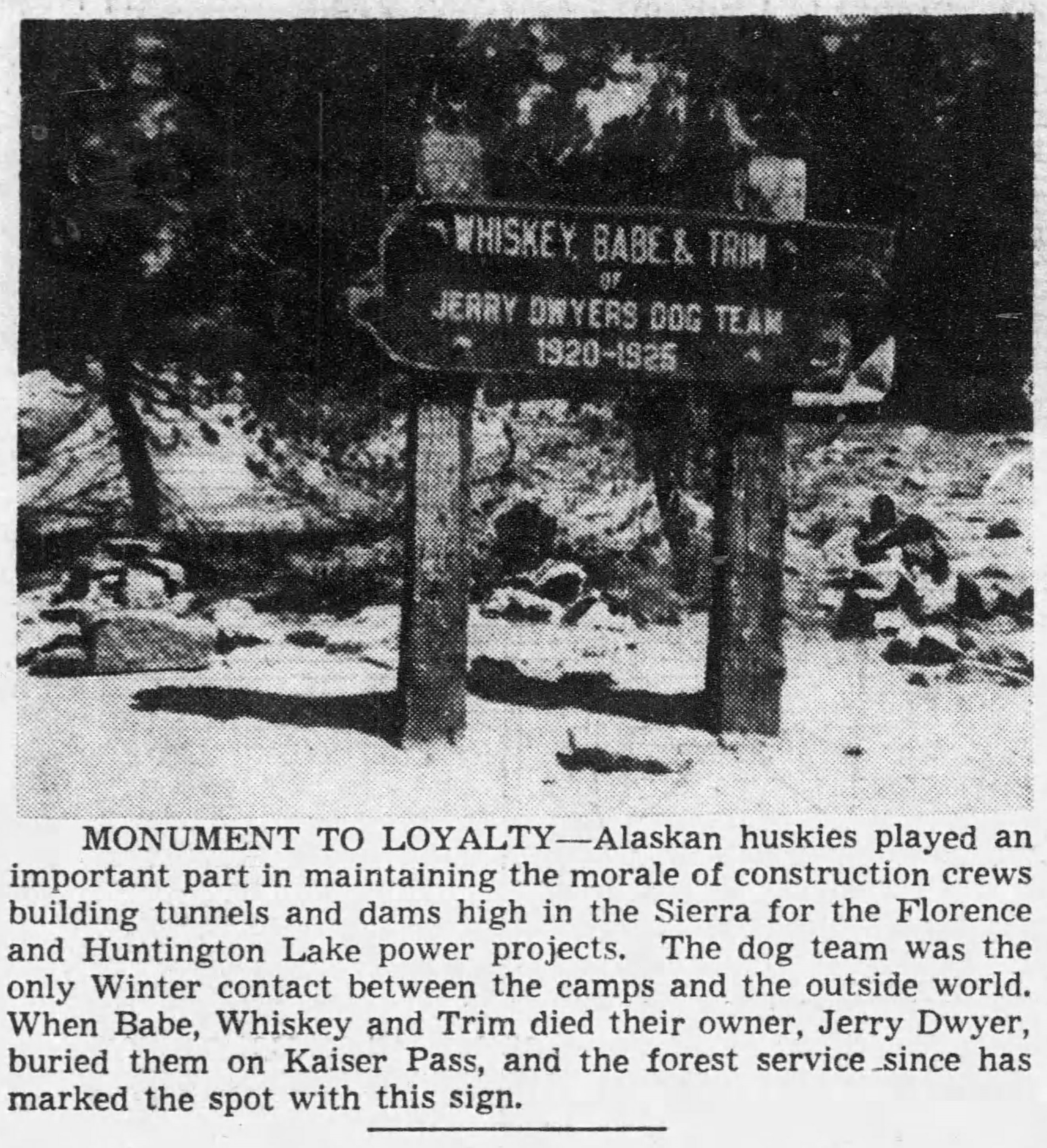 Dwyer’s dog team is now memorialized at Kaiser Pass northeast of Huntington Lake. Here, Dwyer buried three of his dogs during his seven year stay. The first to be buried was Babe, the leader, a husky male who disliked all but Dwyer. His temperament remained the same, dour.