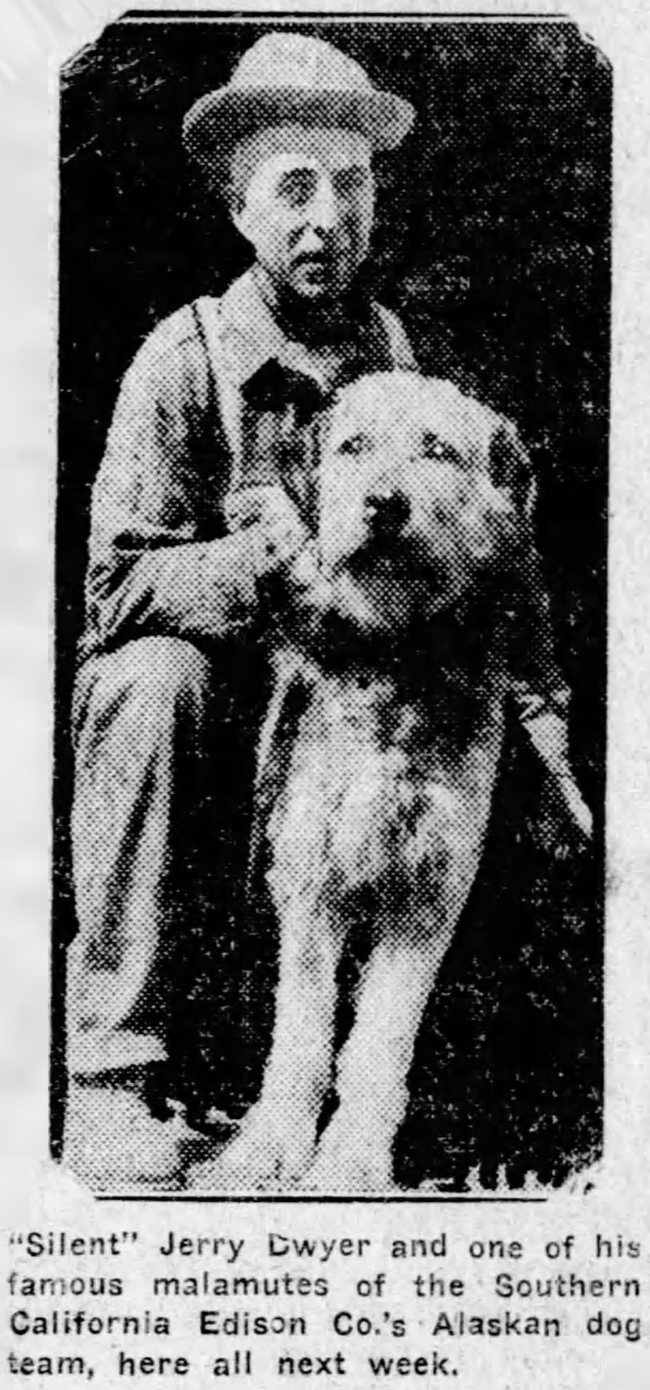 A littler four-page paper — a house organ published by the Southern California Edison Co. — wrapped around a souvenir gift from a friend attending the Fresno, Cal., district fair, was the first clue. The illustrations attracted attention and led to the discovery of Jerry. ‘Silent Jerry and his Alaskan Dog Team,’ was the title above a short sketch of the recent events of Jerry’s life, accompanied by his photograph. The photograph revived remembrance of Dwyer and the article inspired still more curiosity. Jerry was described in this way: ‘He is a strong man in middle life. His closely knit figure is lithe and alert. He treads with the step of a mountaineer and is capable of unbelievable endurance. His face — it is a fine, kindly face, with a broad forehead, and about his firm mouth there is written deep lines which trace the story of mental and bodily conflict. Save when he is talking about his dogs, he is silent as the Great White North. He smilingly turns about the probe that would penetrate his life story, and probers have winced before the unspoken rebuke in the patient blue eyes with a life secret behind them.