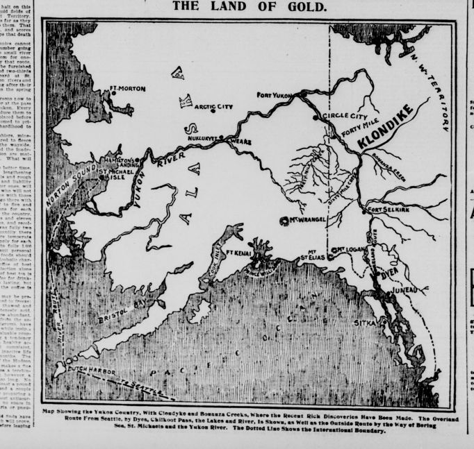 “When summer came there were nearly three thousand people in and about Dawson, Alaska, the great majority of whom had come in during the winter and spring, and who were eagerly waiting to make a fortune. The class was increased when work became slack in the mines, owing to the running water, and also began to be increased by those from adjoining settlements who had been unable to reach the district the season before, and by the vanguard of that great crowd which was soon to pour in over the passes. It is a fact significant of the remoteness of the country and scarcity of facilities for communication and transportation, that while all these scenes of newly-discovered millions were being enacted at Dawson, the outside world was pursuing its peaceful way in utter innocence of Dawson and its mines. A few letters had found their way out, and there were rumors along the Pacific coast of the new discoveries, but they were treated in the papers as highly-colored tales, and stuck into inconspicuous places in mining intelligence. Juneau miners had heard a good deal, however, and were soon on their way down the river.