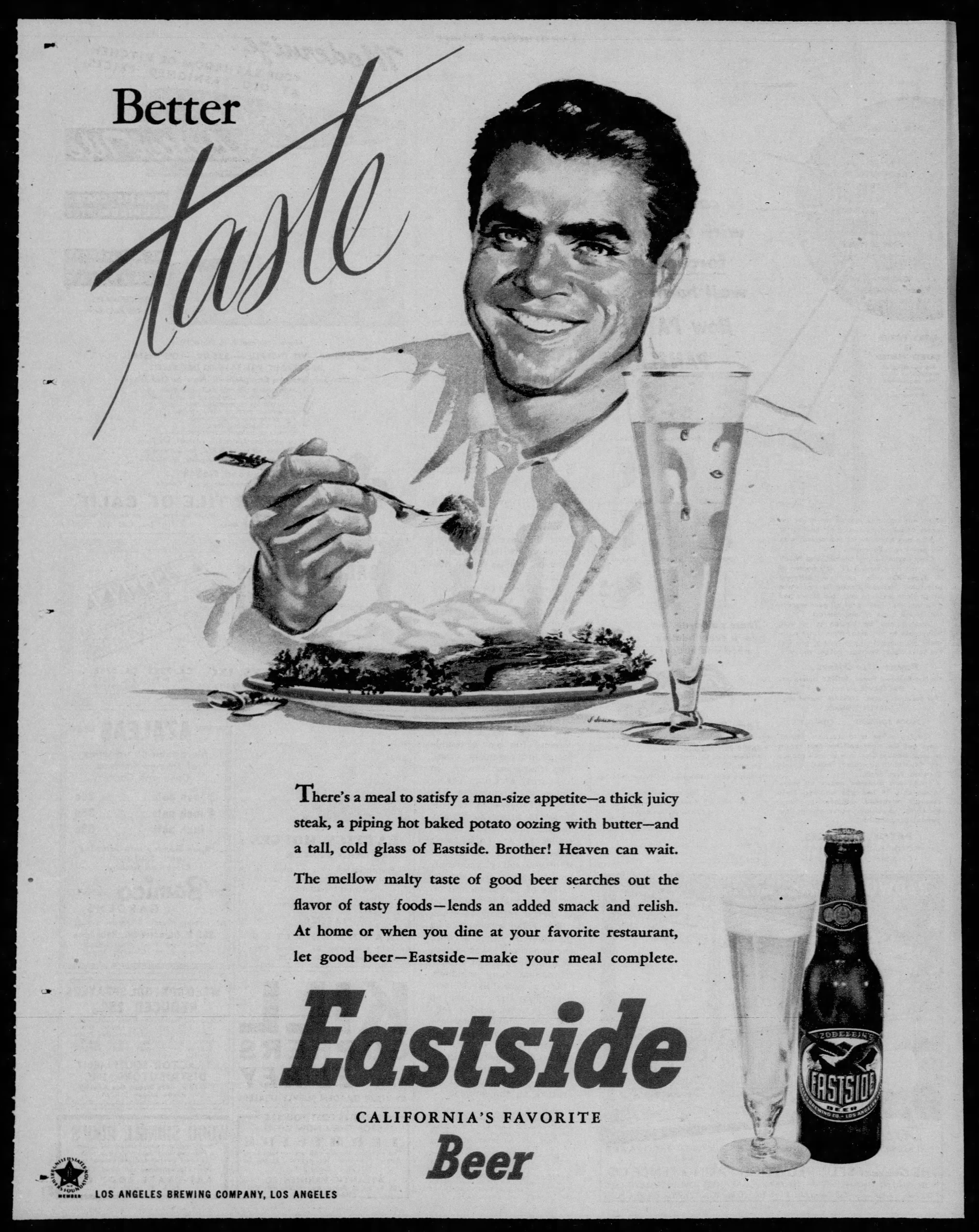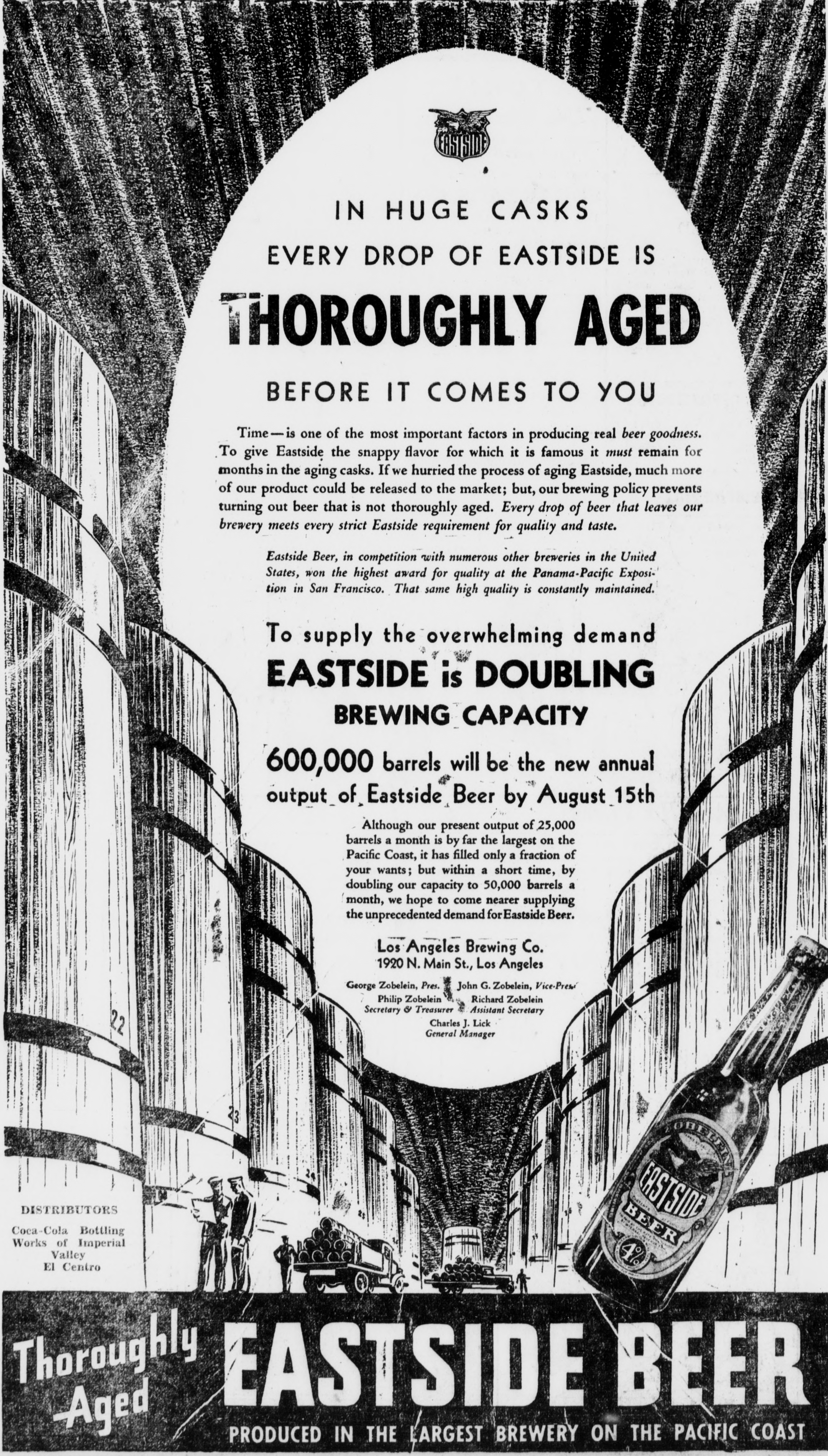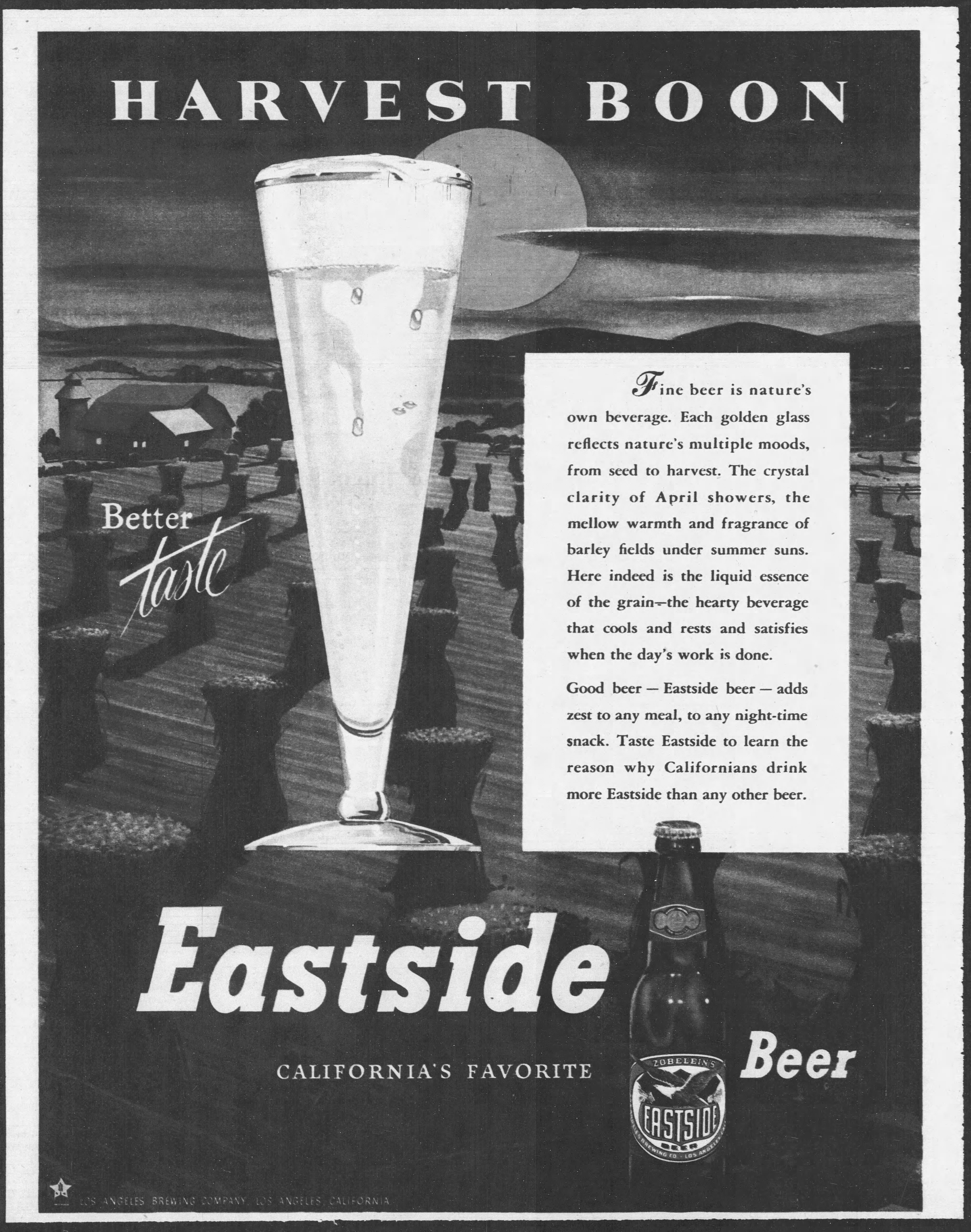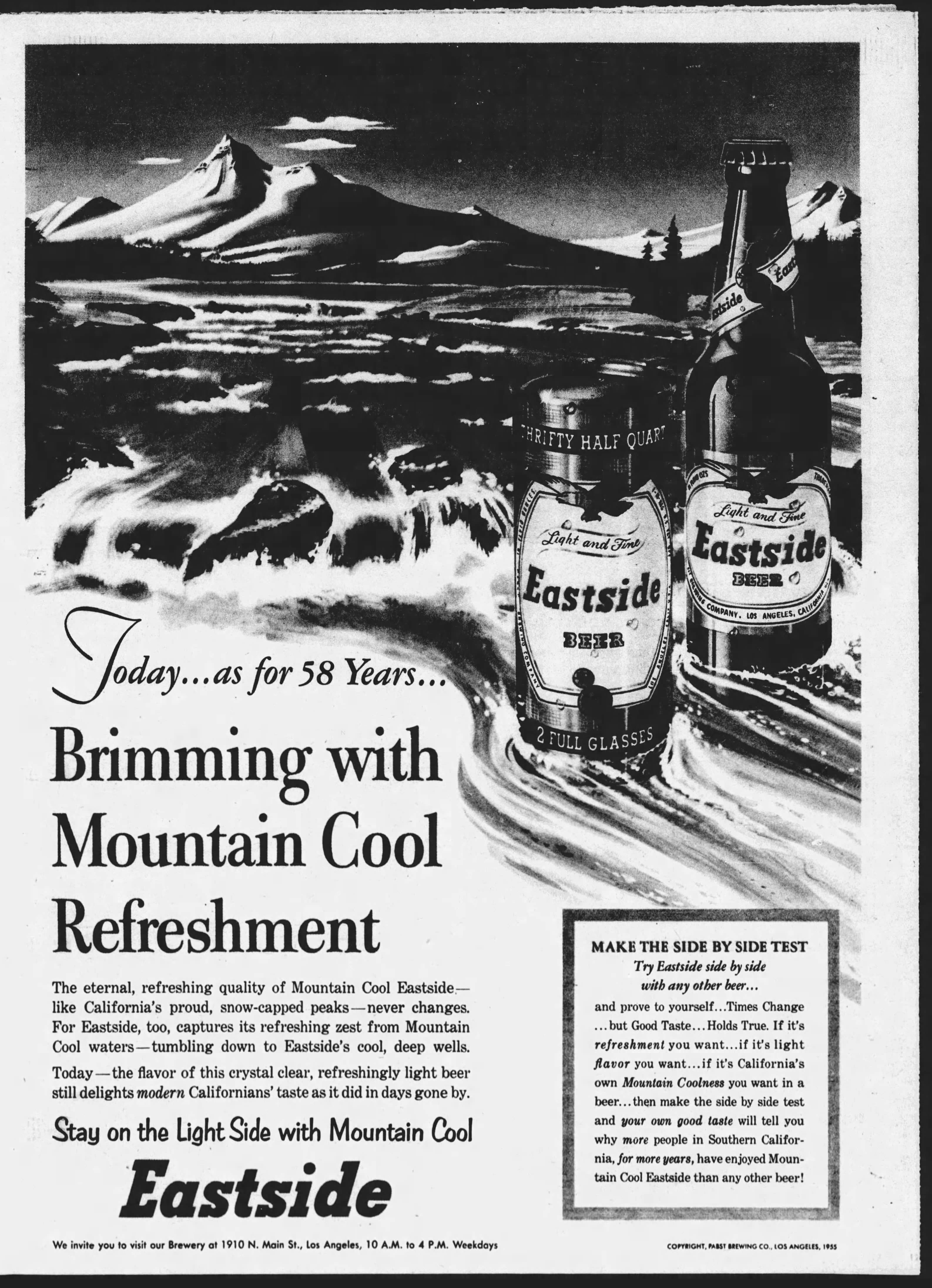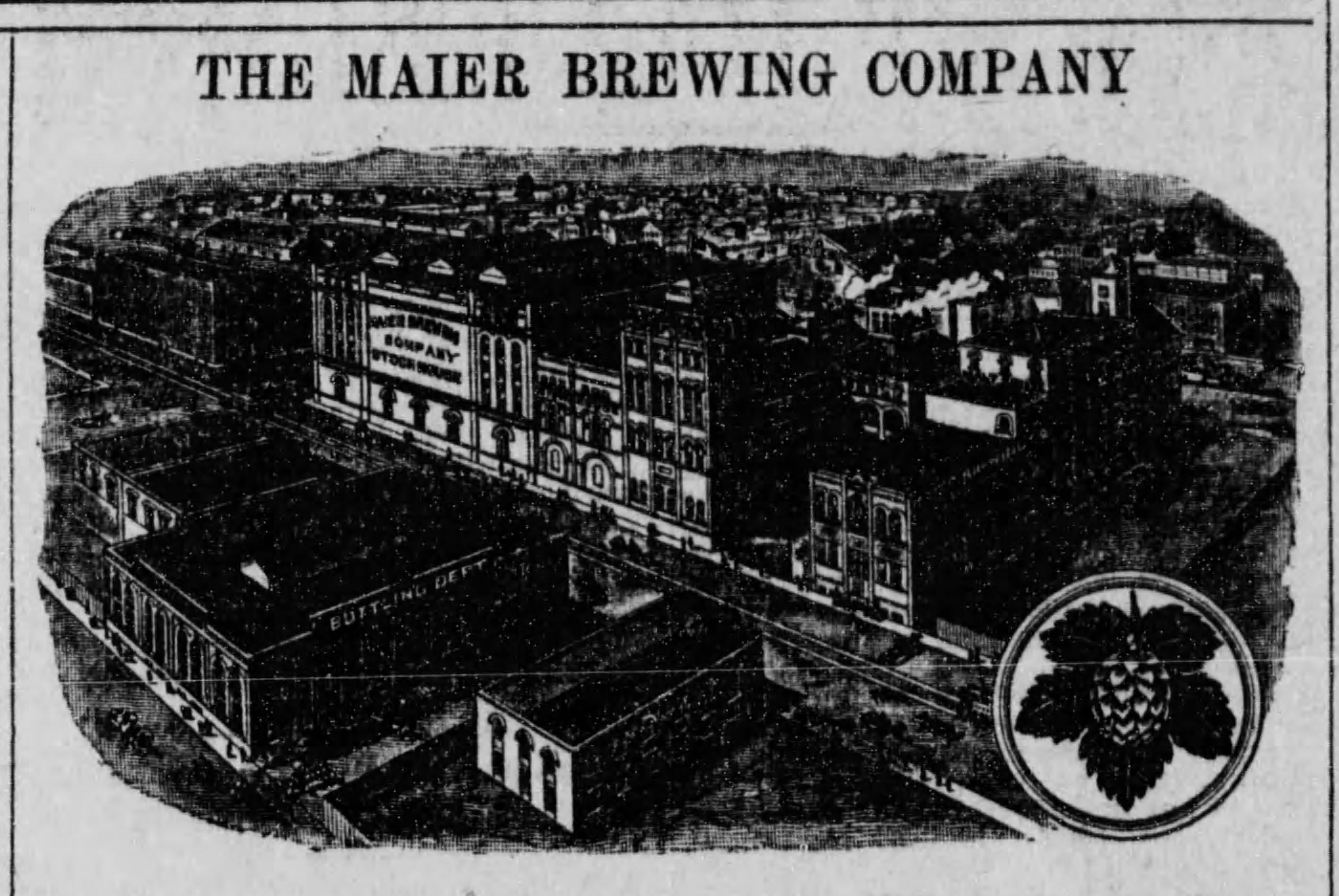“The Maier Brewing Company started as the Ed. Preuss & Company Philadelphia Brewery in 1874. The following year, it became the D. Mahlstedt Company Philadelphia Brewery, and then the Maier & Zobelein Brewery, located in Los Angeles, in 1882. When Maier and Zobelein dissolved their partnership in 1907, the brewery became the Maier Brewing Company, located at 500 East Commercial Street, Los Angeles. Existing for several decades, the Maier Brewing Company was purchased by the General Brewing Company in 1971, but was later closed in 1974. Eastside Beer was bottled by Los Angeles Brewing Company, owned by George Zobelein, a former partner of Maier and Zobelein Brewery. After the two split in 1907, Zobelein named his new beer ‘Eastside’ since Los Angeles Brewing Company was located east of the Los Angeles River at 600 Moulton Avenue, and the 1920-2026 block of Main Street. The bottling facility was eventually sold and became the Pabst Brewery.”