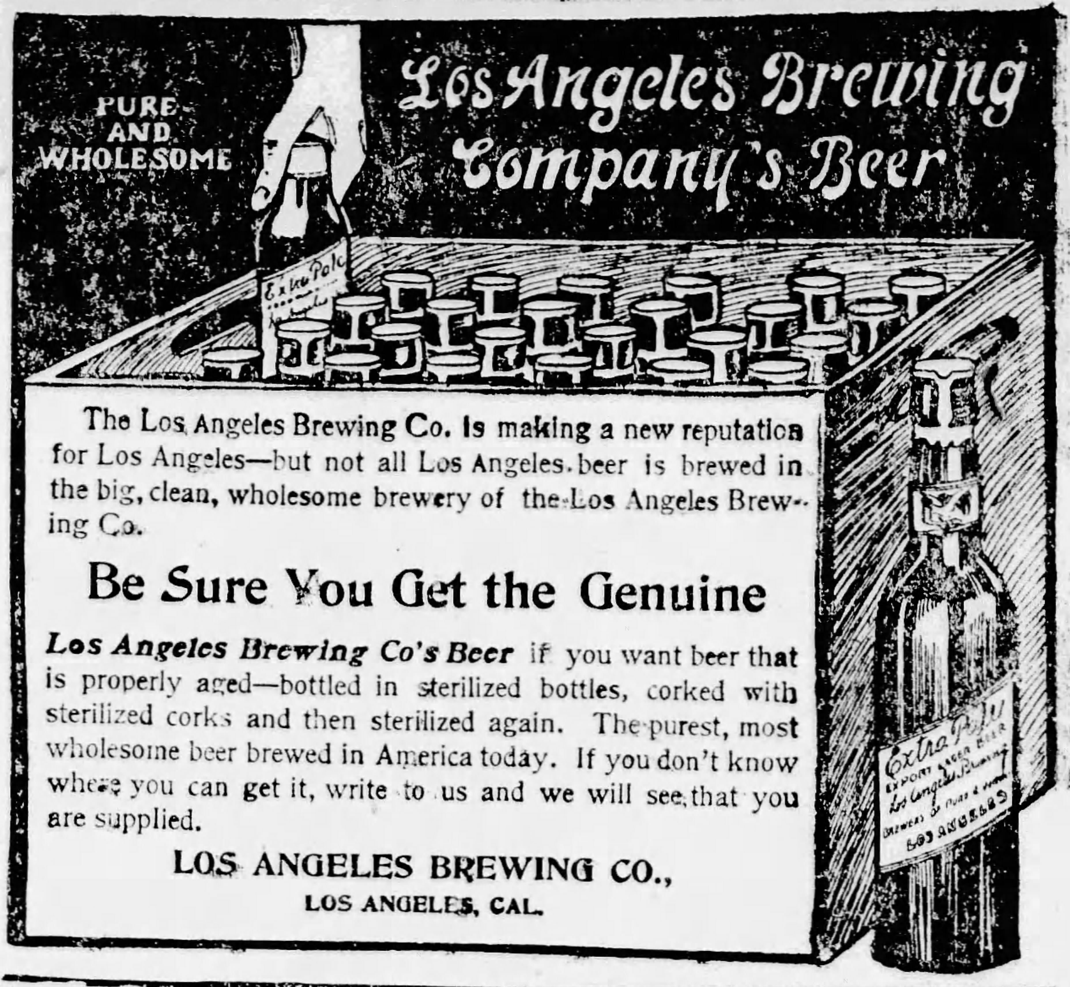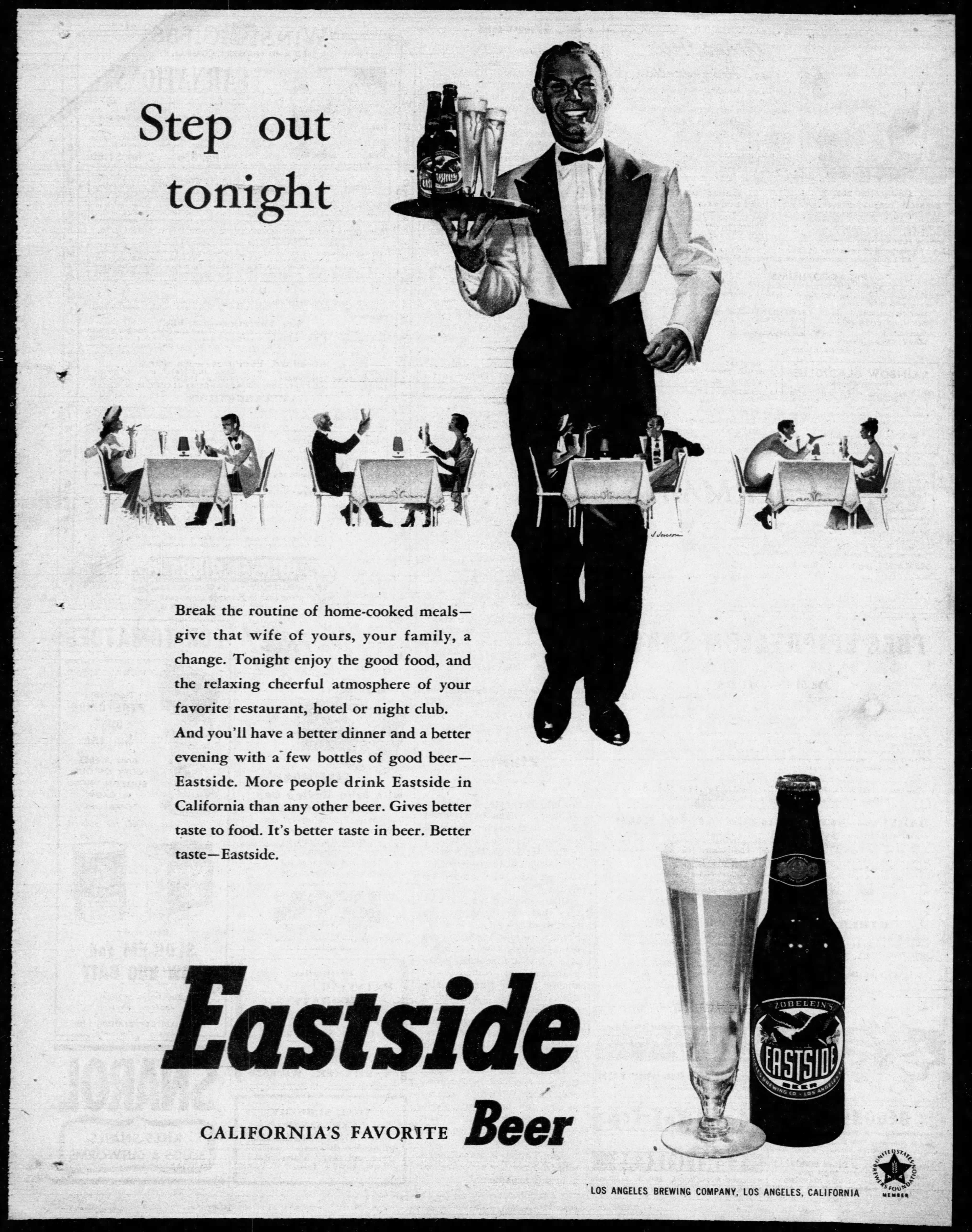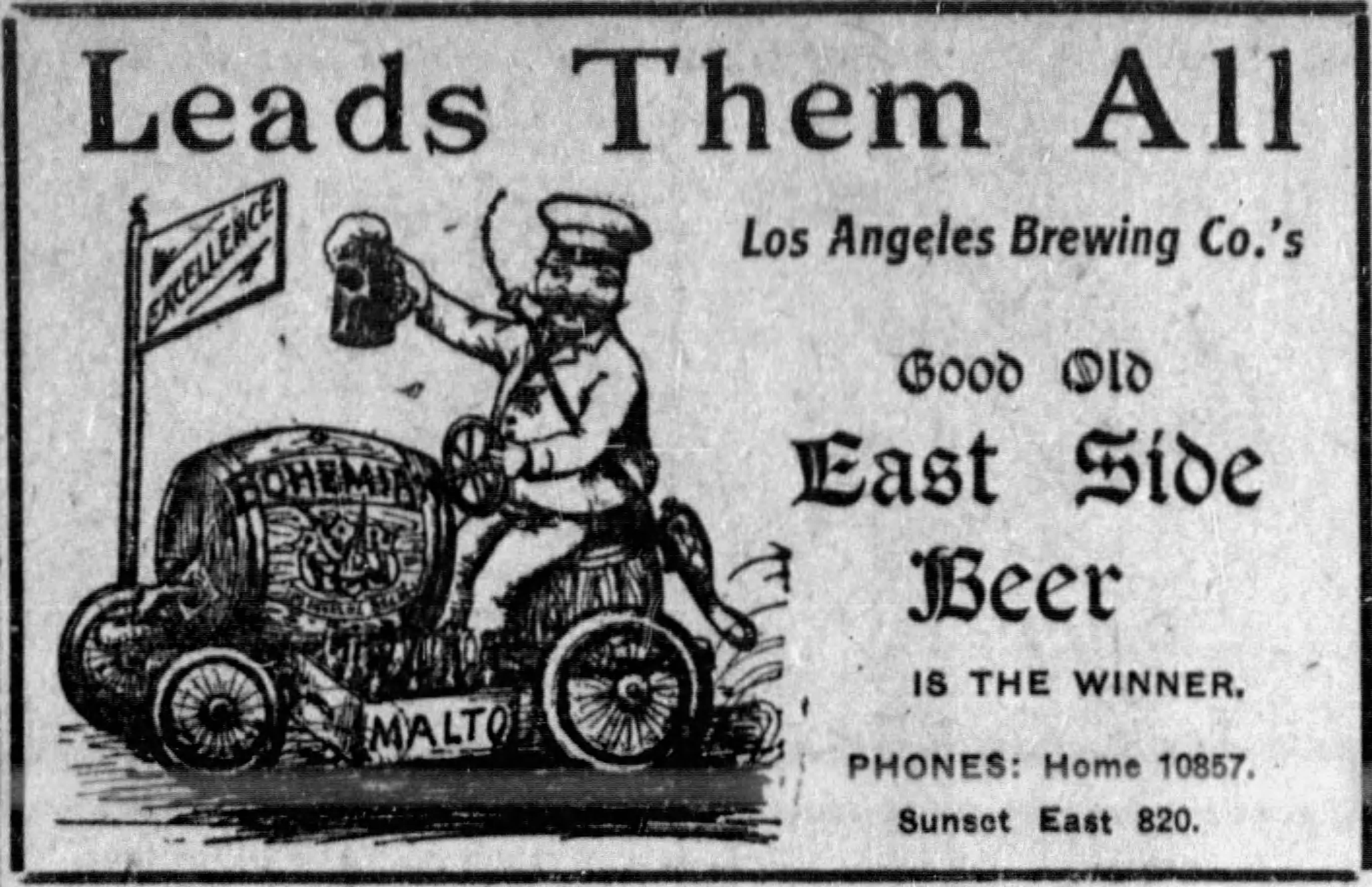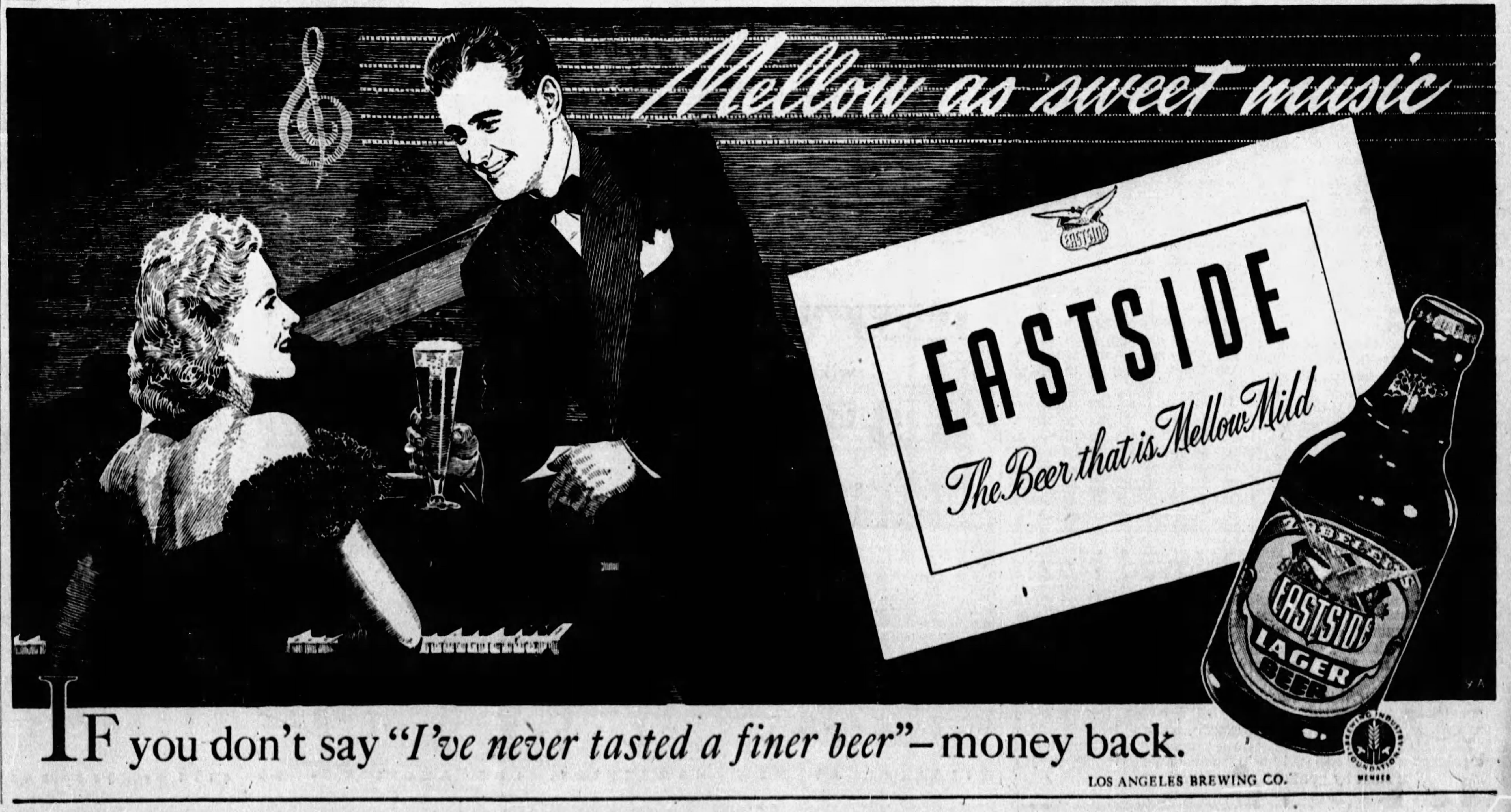“The Maier Brewing Company started as the Ed. Preuss & Company Philadelphia Brewery in 1874. The following year, it became the D. Mahlstedt Company Philadelphia Brewery, and then the Maier & Zobelein Brewery, located in Los Angeles, in 1882. When Maier and Zobelein dissolved their partnership in 1907, the brewery became the Maier Brewing Company, located at 500 East Commercial Street, Los Angeles. Existing for several decades, the Maier Brewing Company was purchased by the General Brewing Company in 1971, but was later closed in 1974. Eastside Beer was bottled by Los Angeles Brewing Company, owned by George Zobelein, a former partner of Maier and Zobelein Brewery. After the two split in 1907, Zobelein named his new beer ‘Eastside’ since Los Angeles Brewing Company was located east of the Los Angeles River at 600 Moulton Avenue, and the 1920-2026 block of Main Street. The bottling facility was eventually sold and became the Pabst Brewery.”