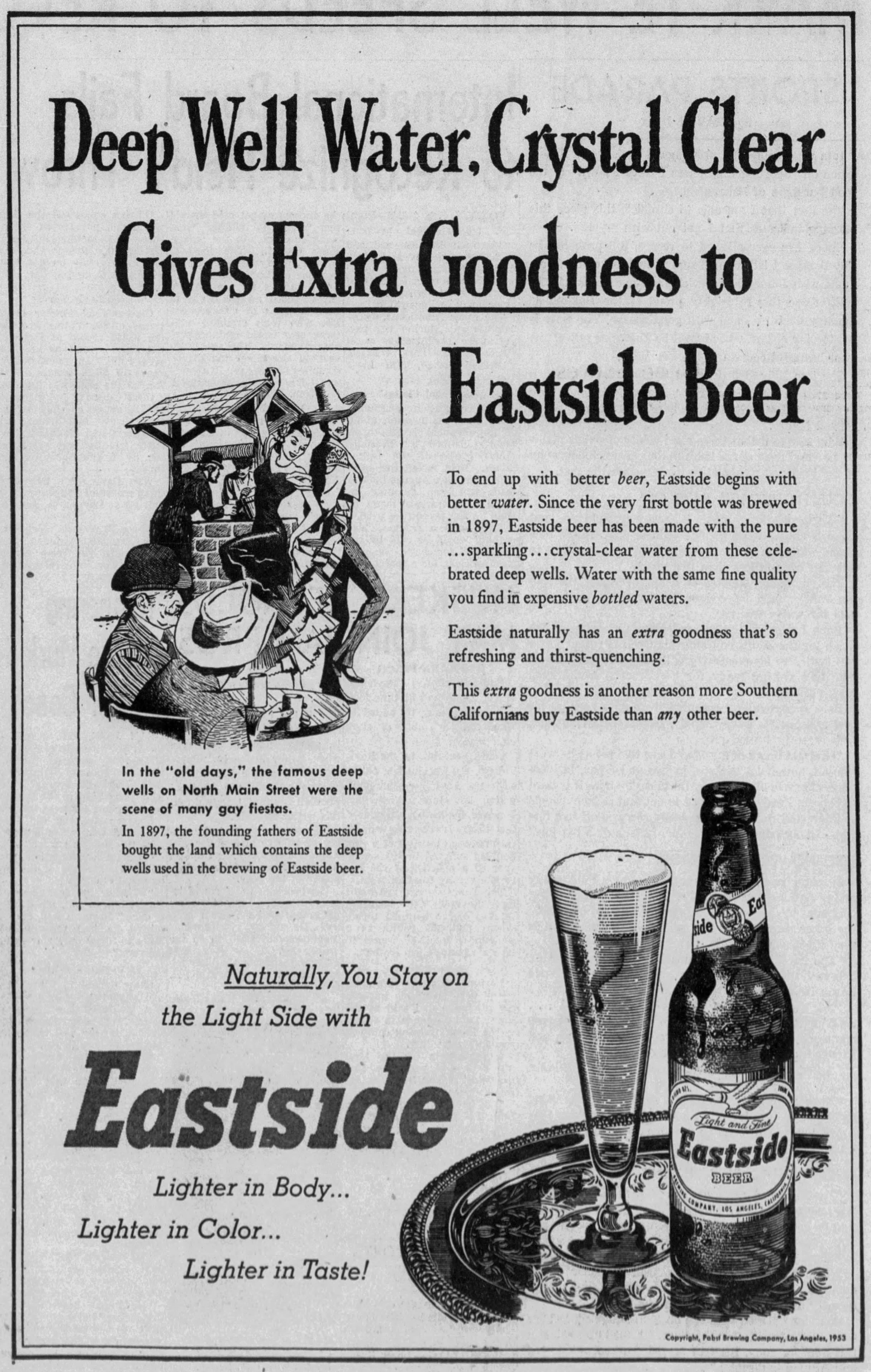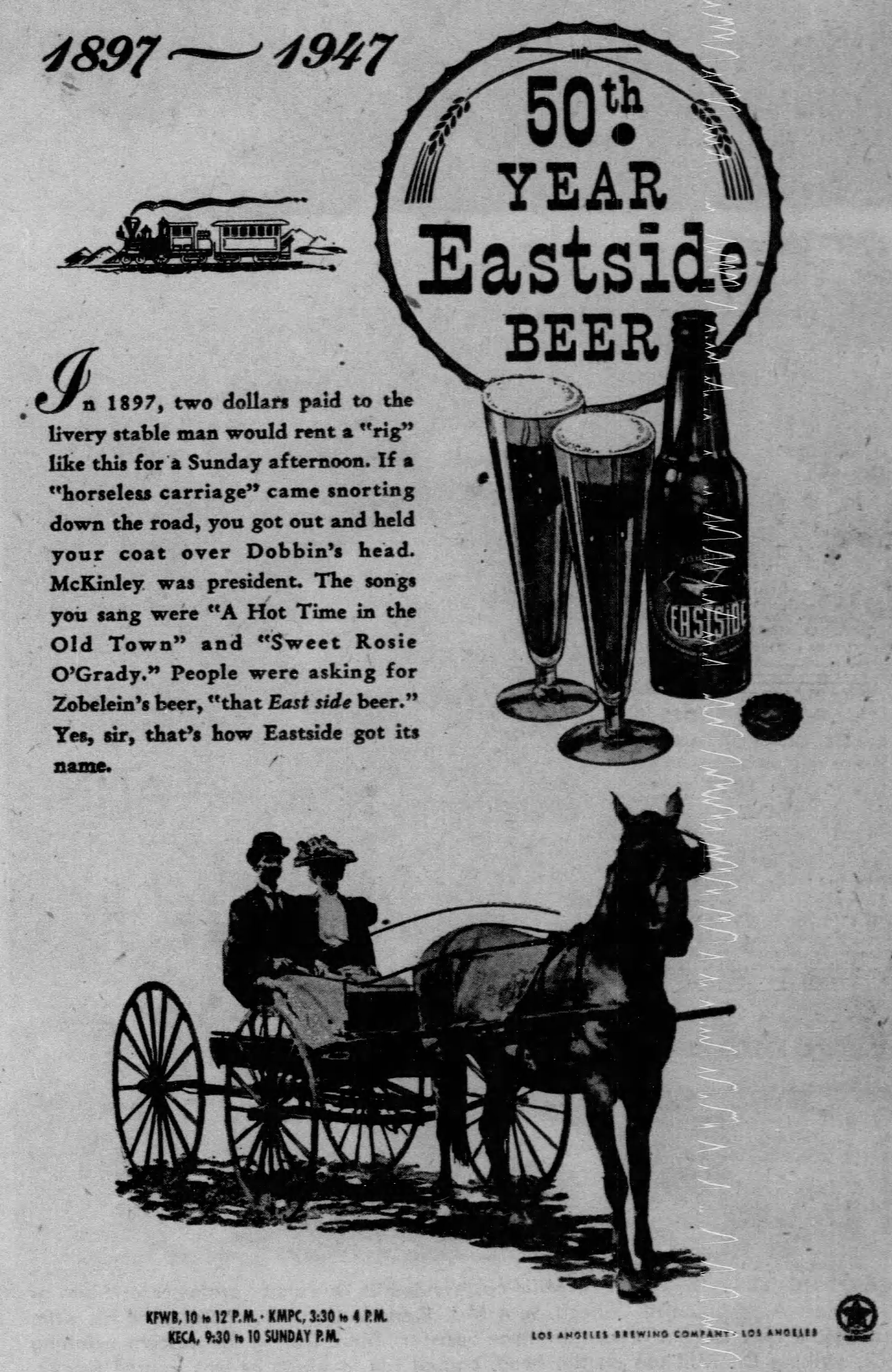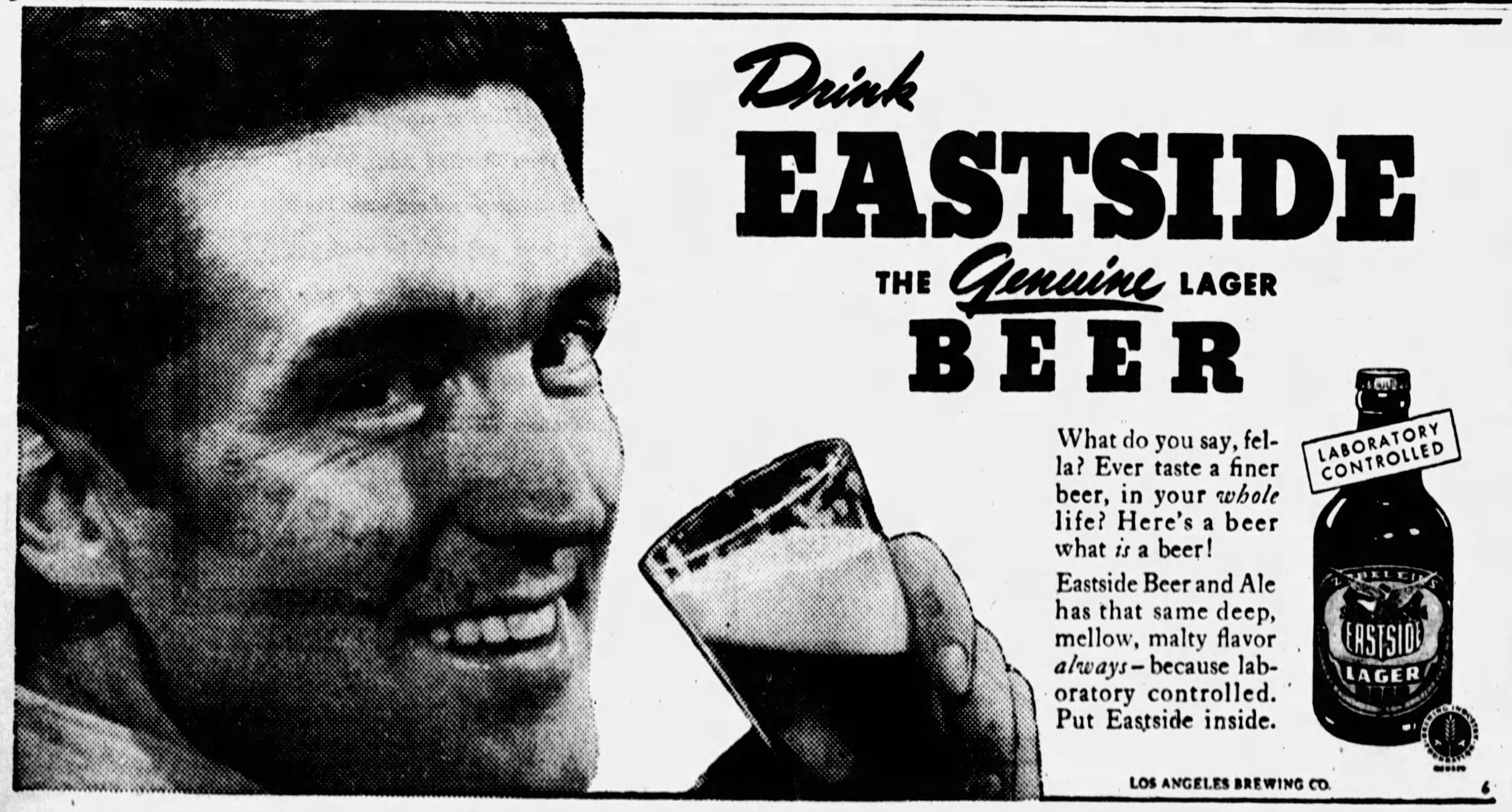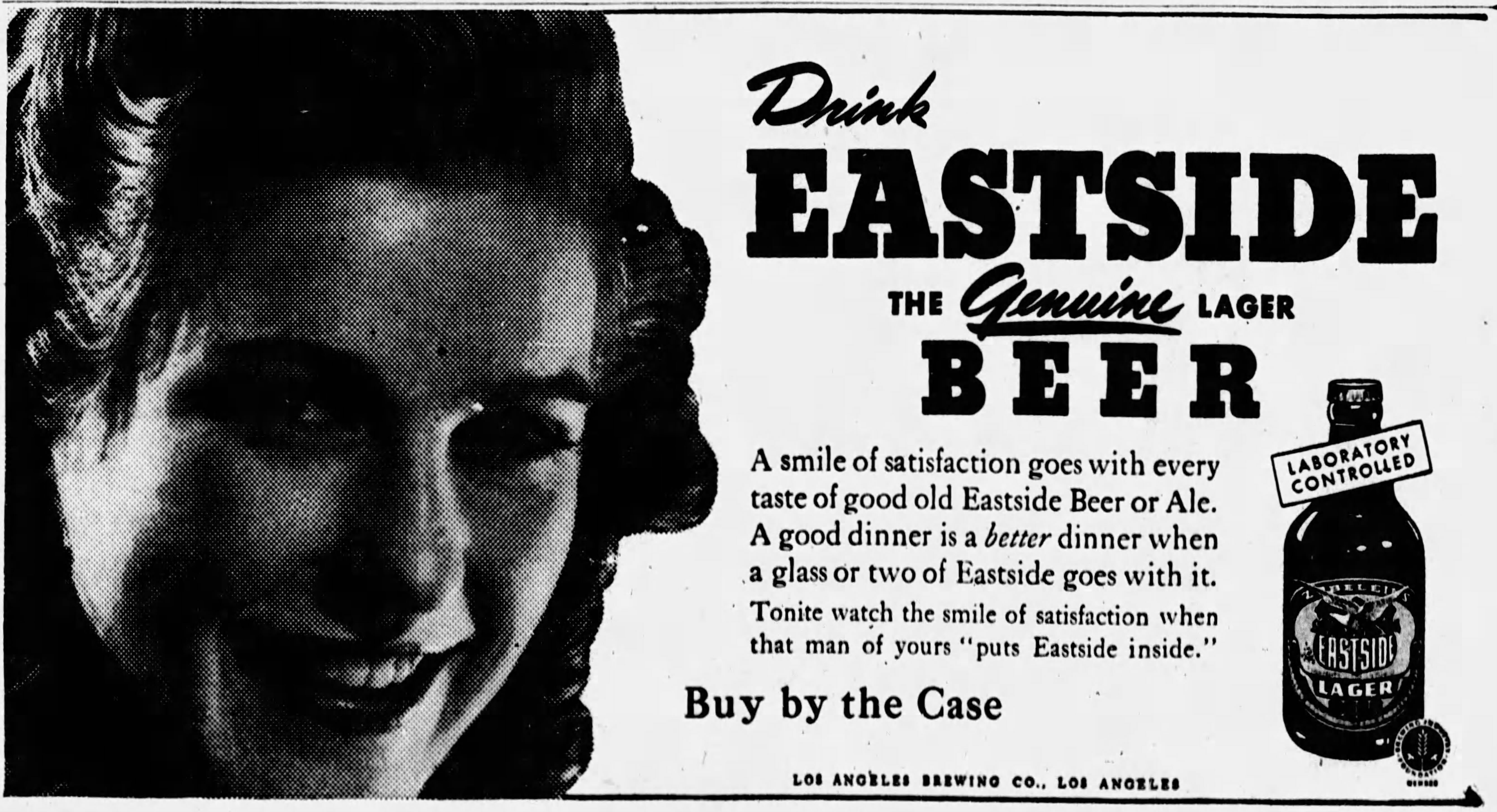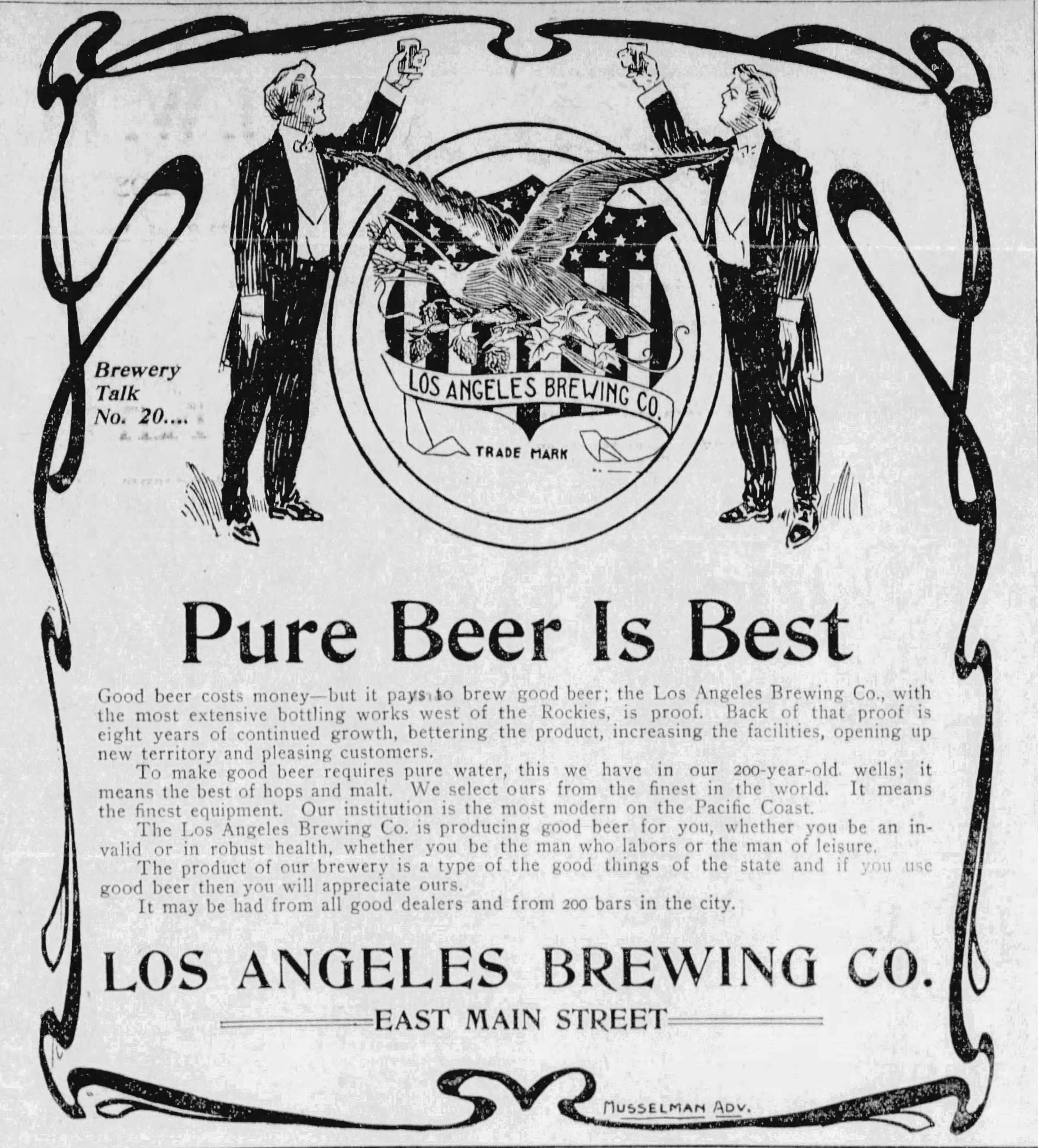 “The Maier Brewing Company started as the Ed. Preuss & Company Philadelphia Brewery in 1874. The following year, it became the D. Mahlstedt Company Philadelphia Brewery, and then the Maier & Zobelein Brewery, located in Los Angeles, in 1882. When Maier and Zobelein dissolved their partnership in 1907, the brewery became the Maier Brewing Company, located at 500 East Commercial Street, Los Angeles. Existing for several decades, the Maier Brewing Company was purchased by the General Brewing Company in 1971, but was later closed in 1974. Eastside Beer was bottled by Los Angeles Brewing Company, owned by George Zobelein, a former partner of Maier and Zobelein Brewery. After the two split in 1907, Zobelein named his new beer ‘Eastside’ since Los Angeles Brewing Company was located east of the Los Angeles River at 600 Moulton Avenue, and the 1920-2026 block of Main Street. The bottling facility was eventually sold and became the Pabst Brewery.”